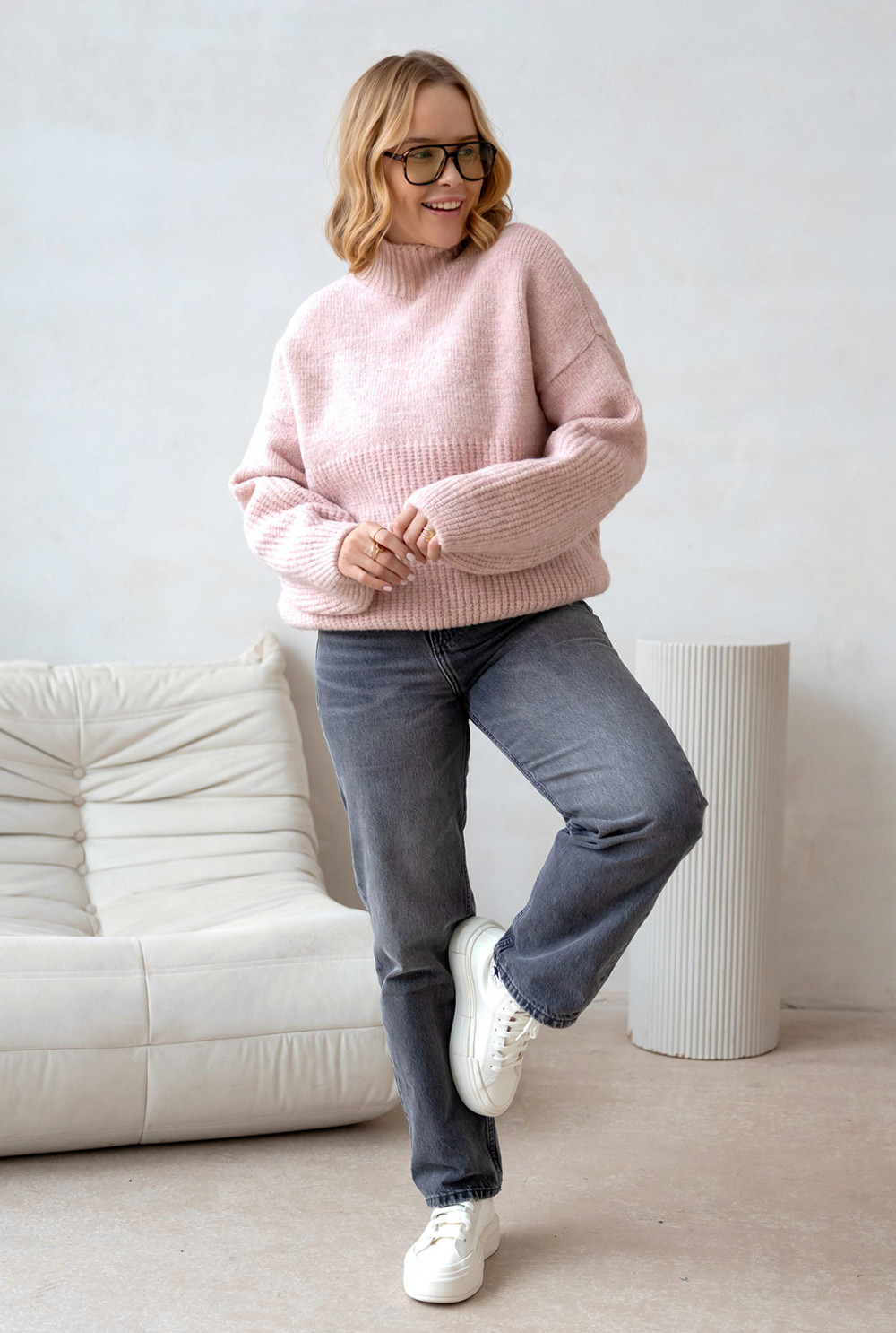 Miękki, przyjemny w dotyku sweterek z dodatkiem wełny. Model o lekko skróconym kroju i delikatnie zaokrąglonym dekolcie pięknie układa się na sylwetce. Charakteru dodają mu szersze rękawy zakończone ściągaczami, takimi samymi jak dół swetra.
