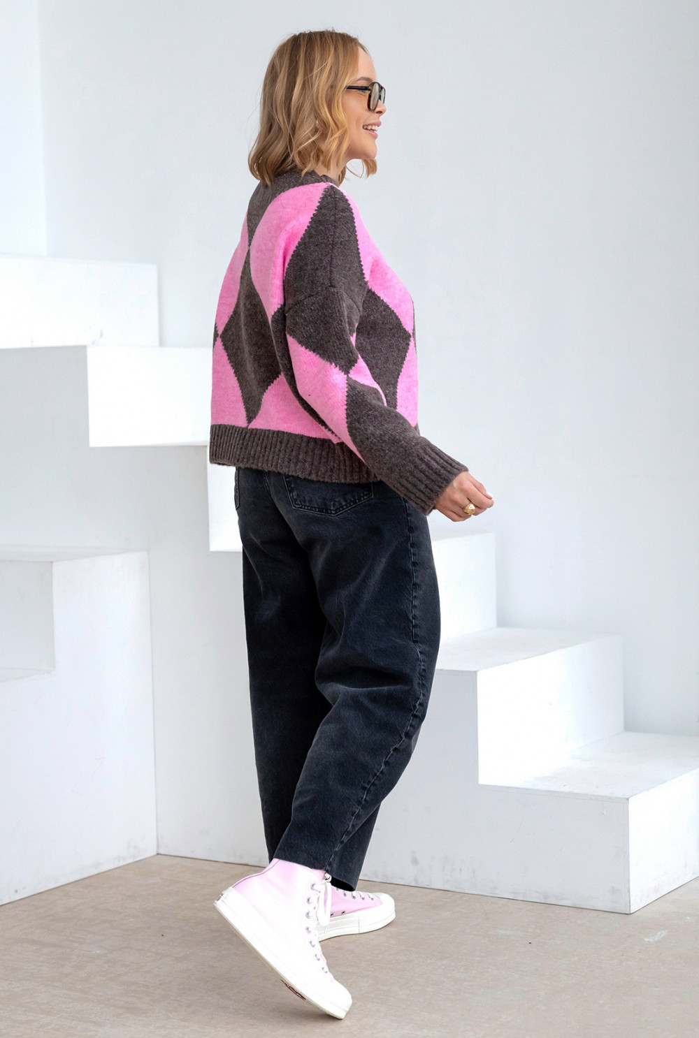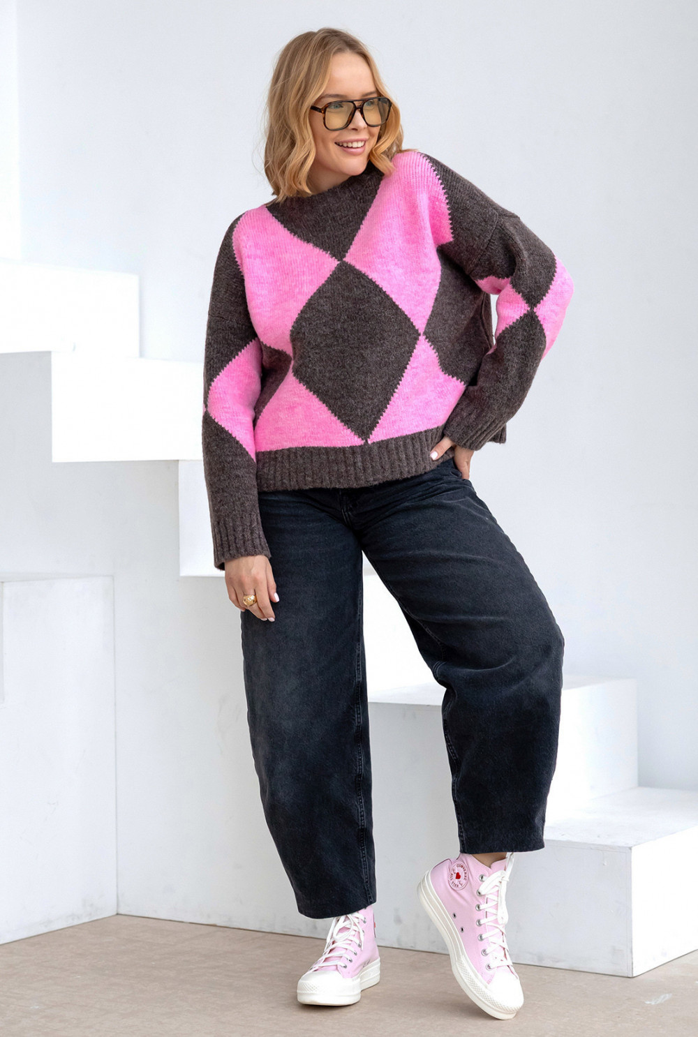 Sweter w romby Anastasia Ciemne kakao-baby róż