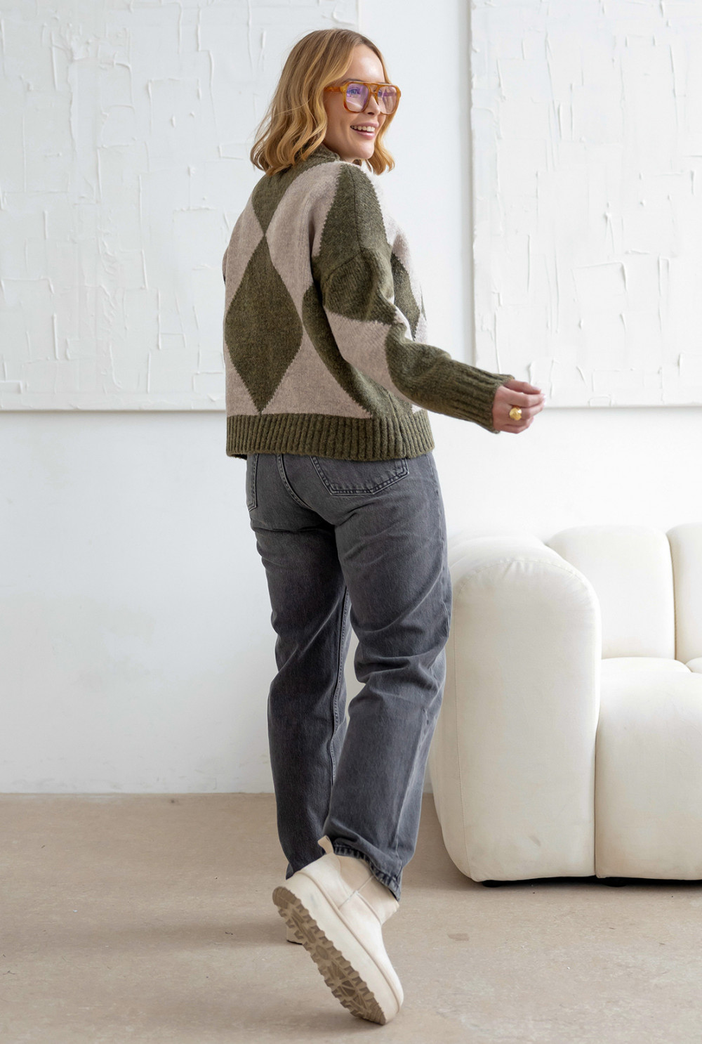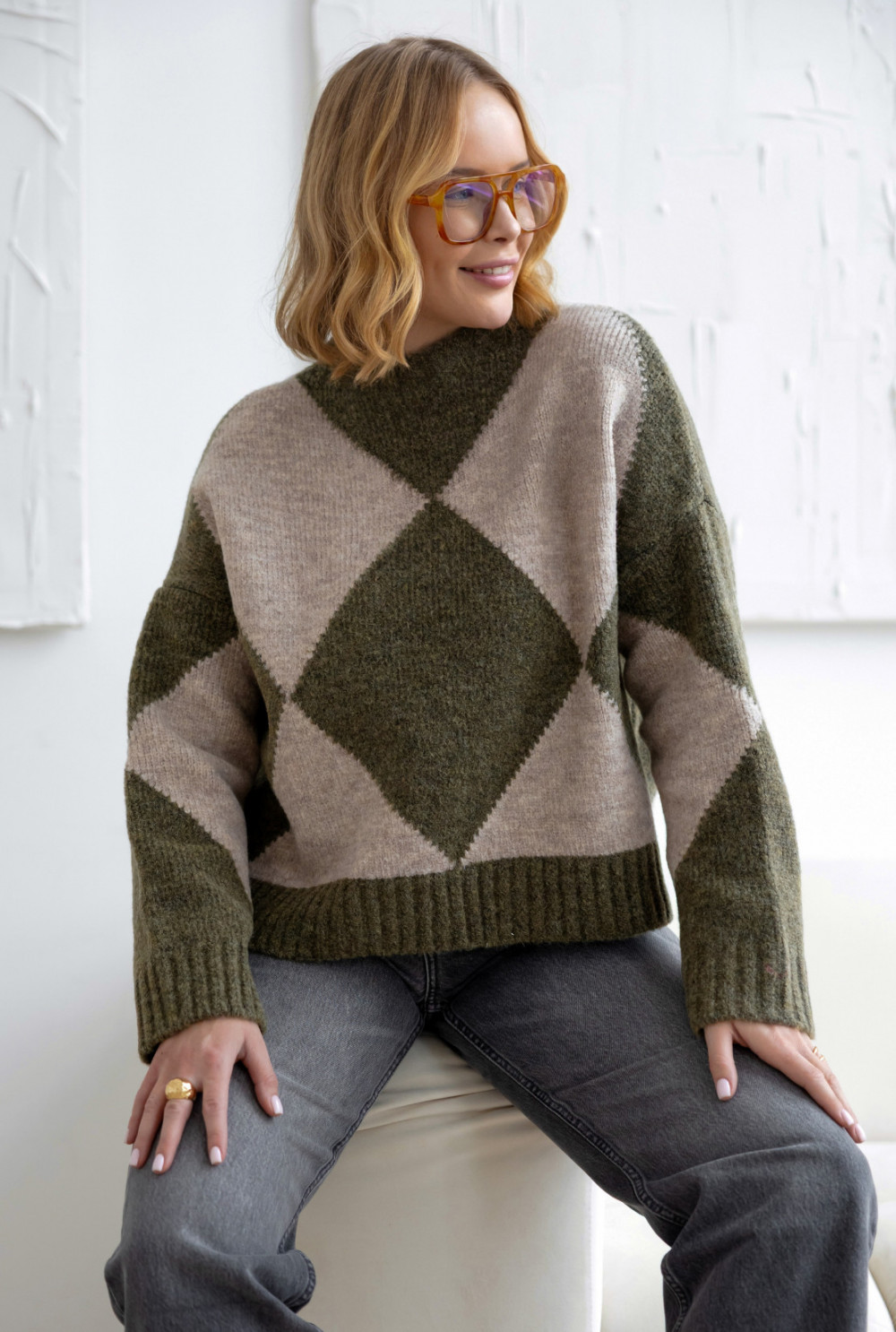 Miękki sweter w romby świetnie zaprezentuje się w codziennych stylizacjach w jesienno-zimowym sezonie. Wyróżnia się niebanalnym połączeniem kolorystycznym, nadającym całości niepowtarzalnego charakteru. To model o klasycznym fasonie z długimi rękawami.