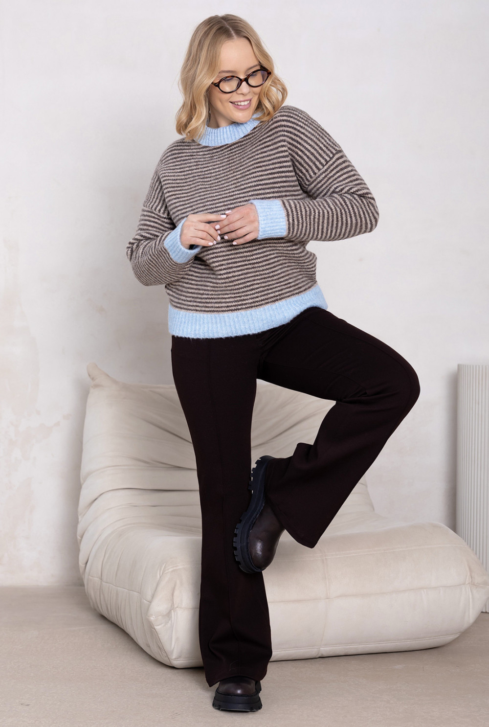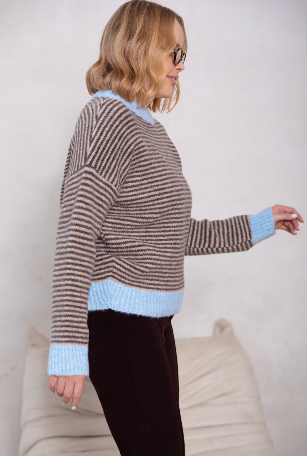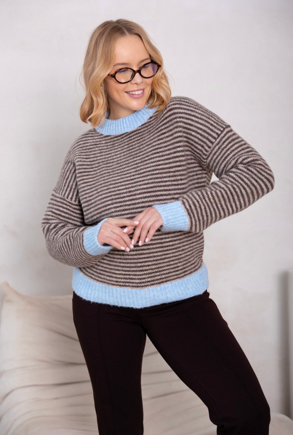 Miękki i ciepły sweterek z kolorową plisą o prostym kroju, wykonany z przyjemnej dzianiny z dodatkiem wełny. Kontrastowe ściągacze przy dekolcie, rękawach i dole nadają mu charakteru. Dostępny w kilku modnych kolorach.