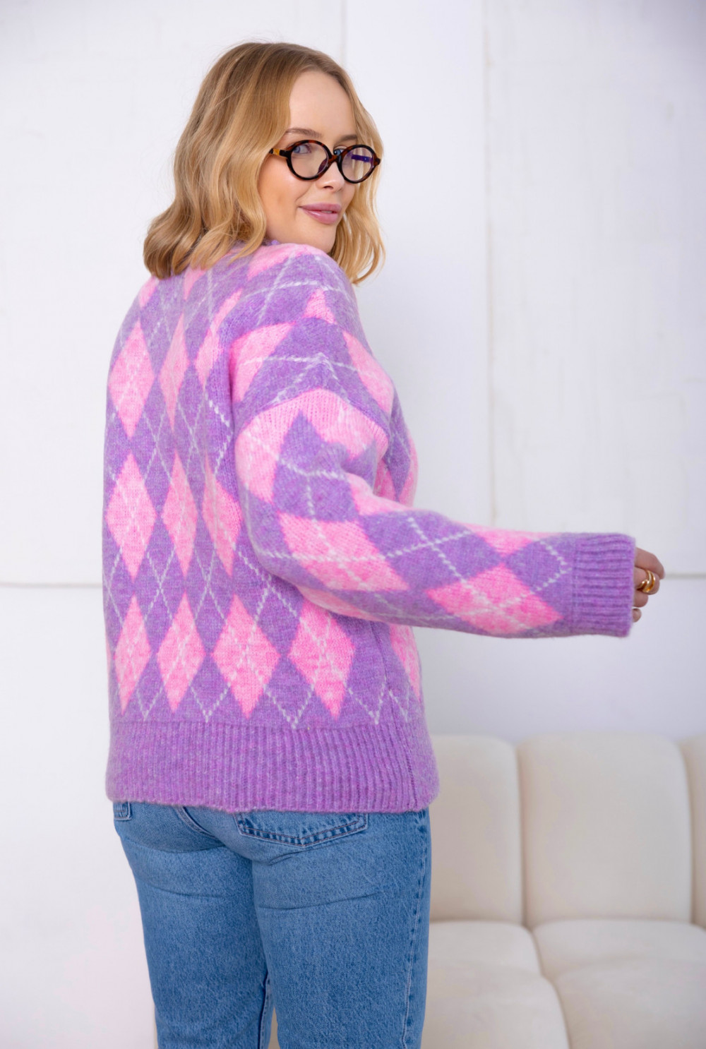 Oversizow sweter wykonany z materiału z domieszką wełny. To model o prostym kroju, wyróżniający się wzorem w romby. Posiada dekolt w łódkę oraz ściągacze w dolnej części i przy rękawach.