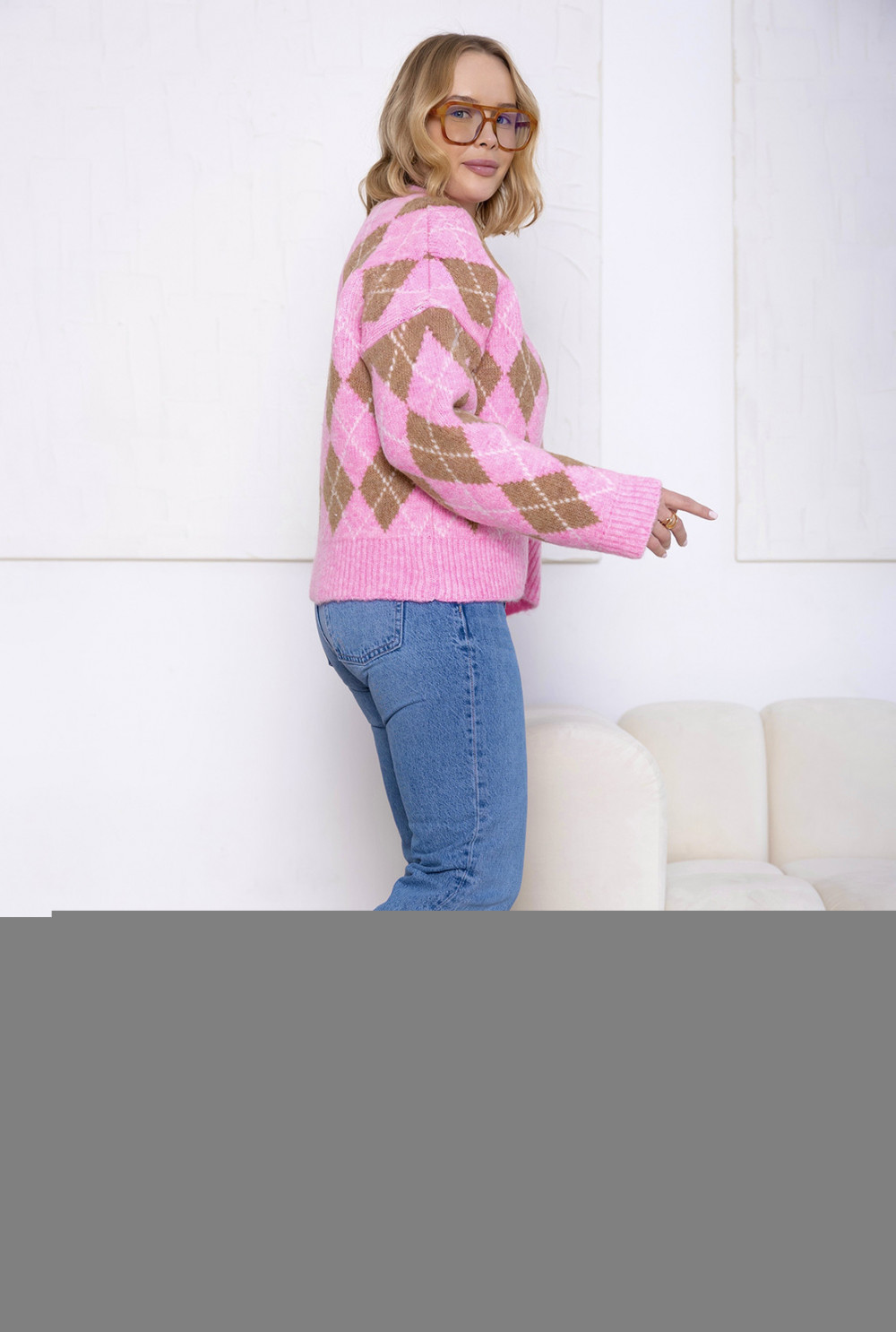 Oversizow sweter wykonany z materiału z domieszką wełny. To model o prostym kroju, wyróżniający się wzorem w romby. Posiada dekolt w łódkę oraz ściągacze w dolnej części i przy rękawach.