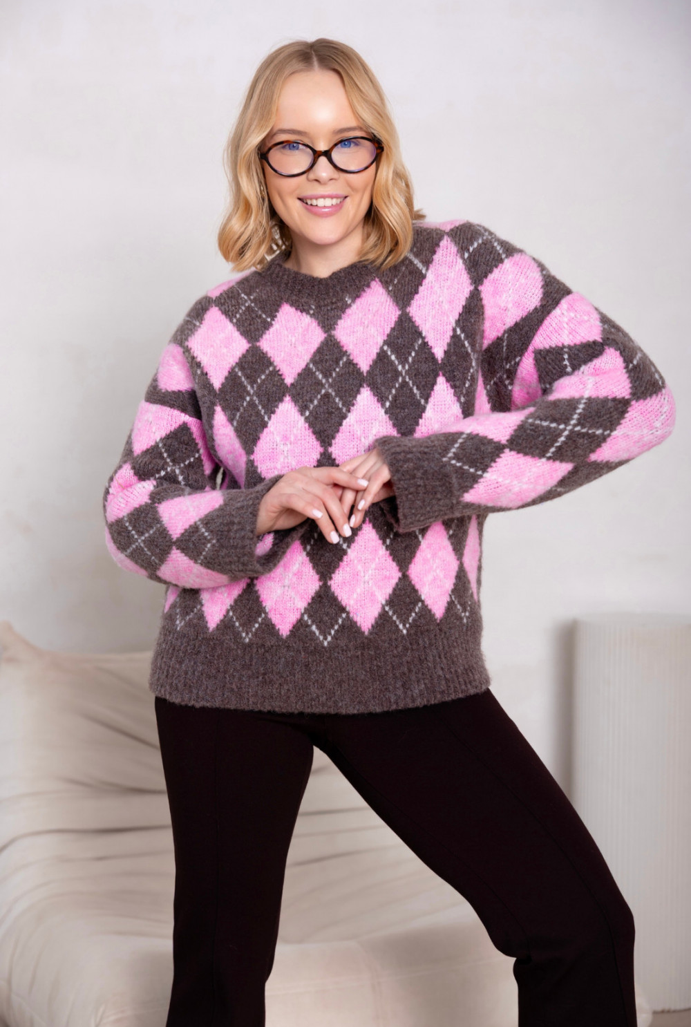 Oversizow sweter wykonany z materiału z domieszką wełny. To model o prostym kroju, wyróżniający się wzorem w romby. Posiada dekolt w łódkę oraz ściągacze w dolnej części i przy rękawach.