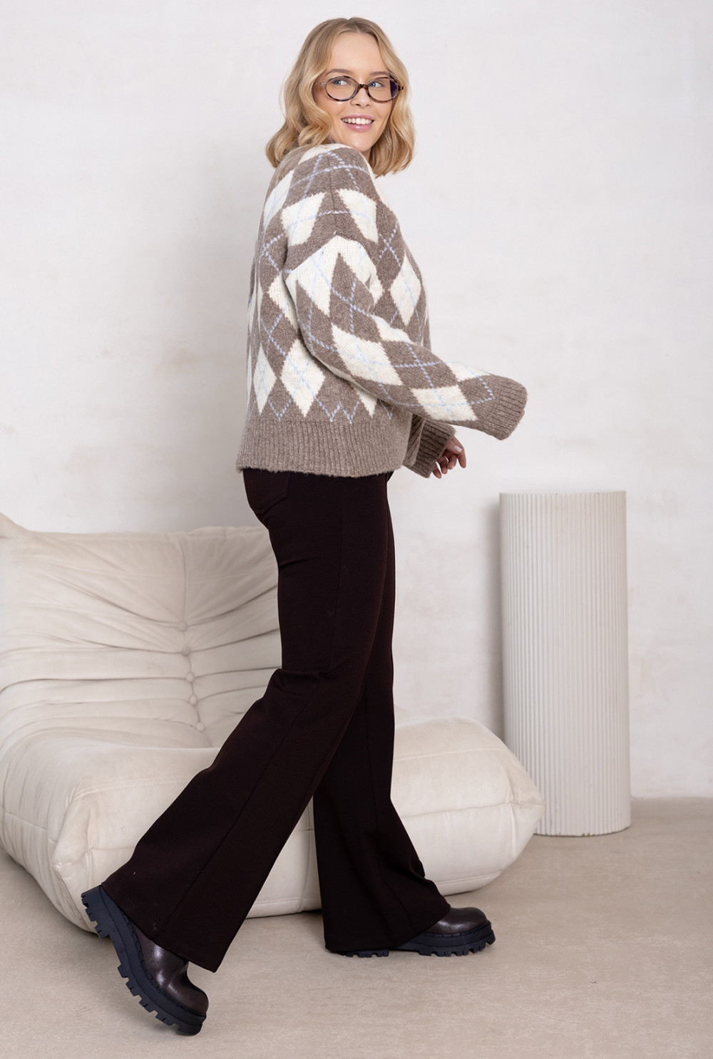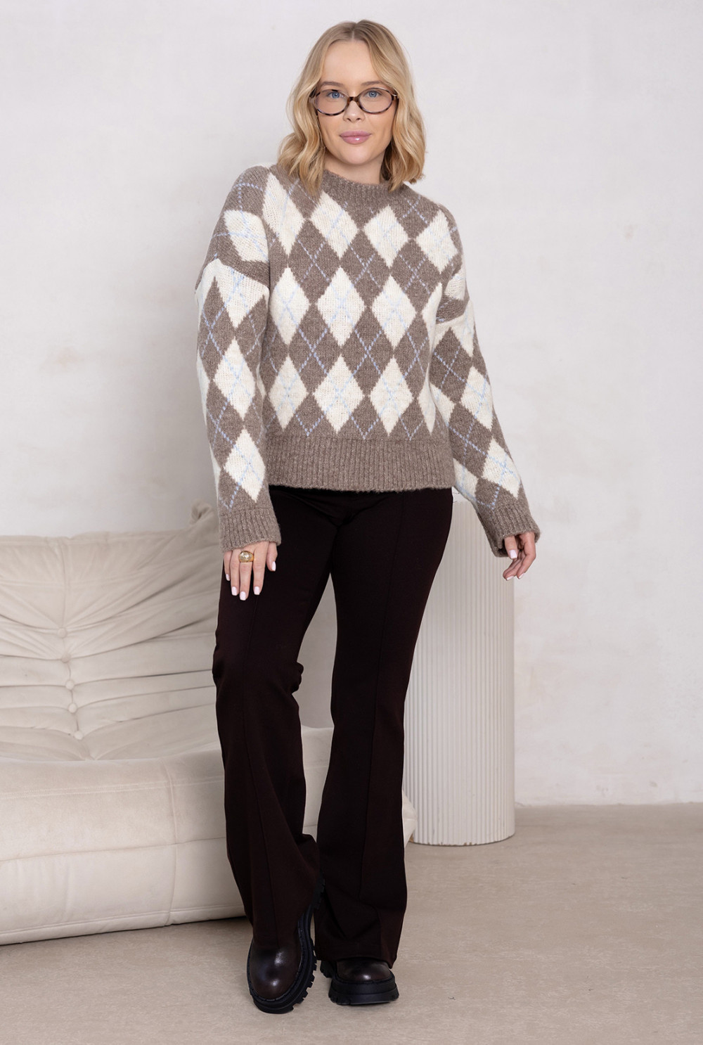 Oversizow sweter wykonany z materiału z domieszką wełny. To model o prostym kroju, wyróżniający się wzorem w romby. Posiada dekolt w łódkę oraz ściągacze w dolnej części i przy rękawach.