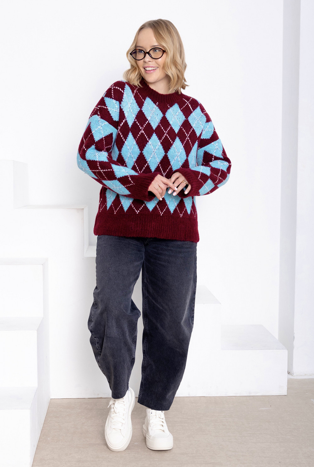 Sweter w romby Candy Burgund-niebo