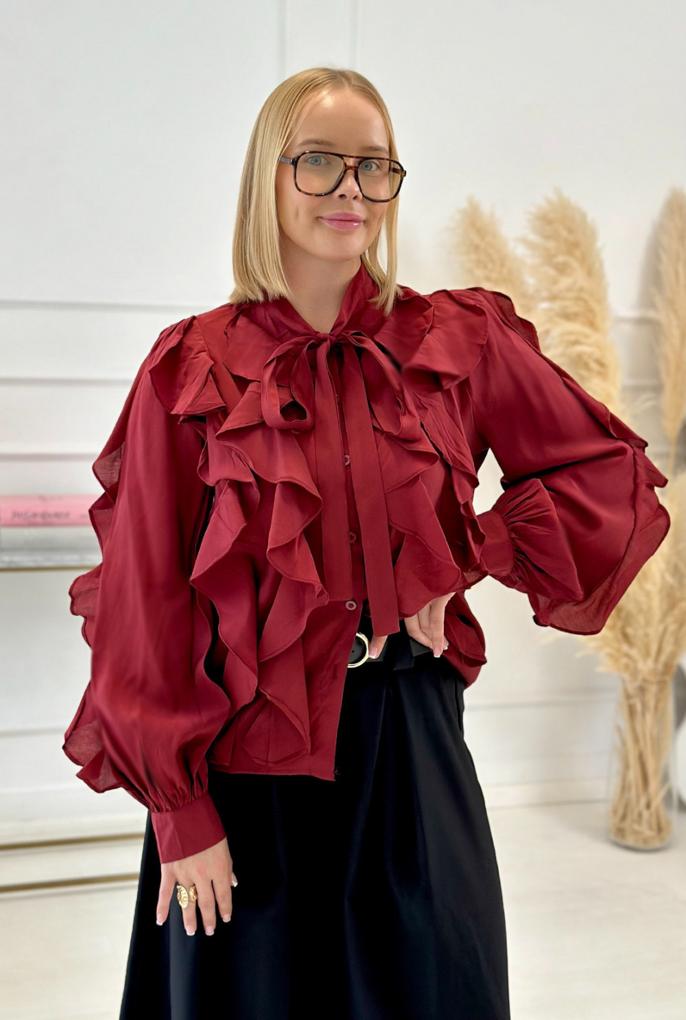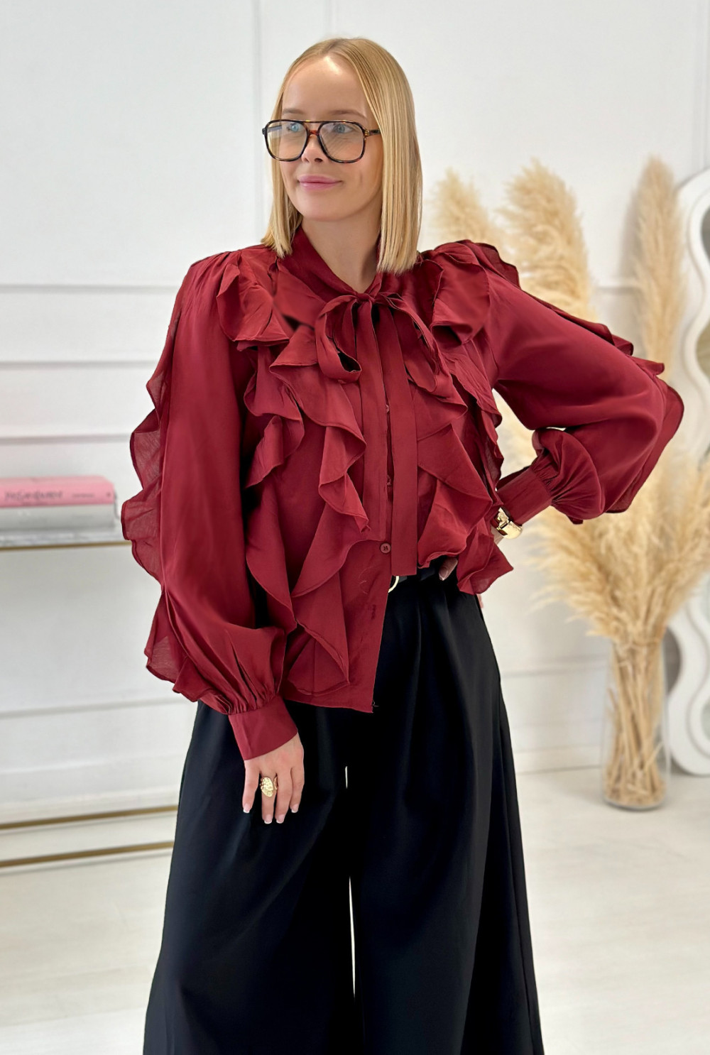 Lekka koszula wykonana z transparentnej tkaniny. To propozycja wyróżniająca się efektownymi falbankami oraz wiązaniem przy szyi. osiada zapięcie na guziki, a długie rękawy zakończone zostały mankietami.