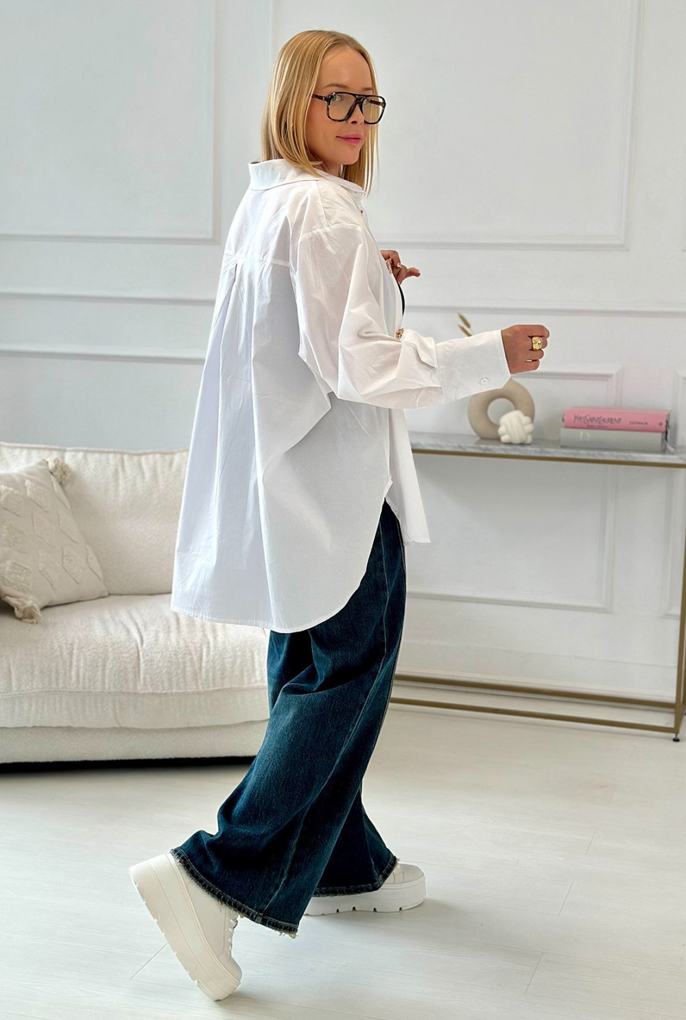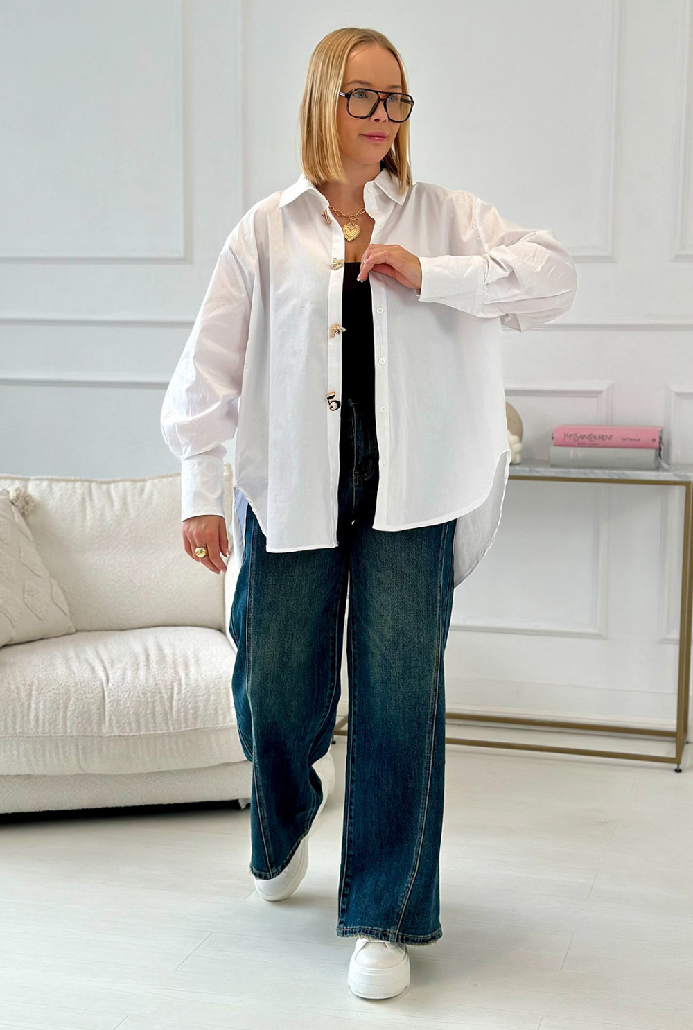 Oversizowa koszula z bawełny, wyróżniająca się ozdobnymi broszkami. Model w klasycznym kroju, lekko wydłużony z tyłu, zapinany na kryte guziki. Uzupełniony o kołnierzyk i szersze rękawy z eleganckimi mankietami, tworzy stylową, harmonijną całość.