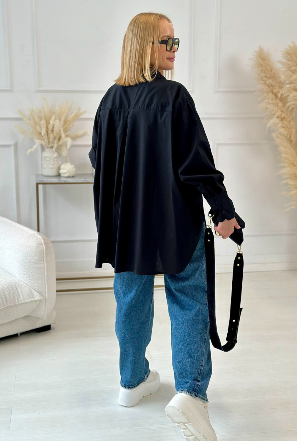 Oversizowa koszula z bawełny, wyróżniająca się ozdobnymi broszkami. Model w klasycznym kroju, lekko wydłużony z tyłu, zapinany na kryte guziki. Uzupełniony o kołnierzyk i szersze rękawy z eleganckimi mankietami, tworzy stylową, harmonijną całość.
