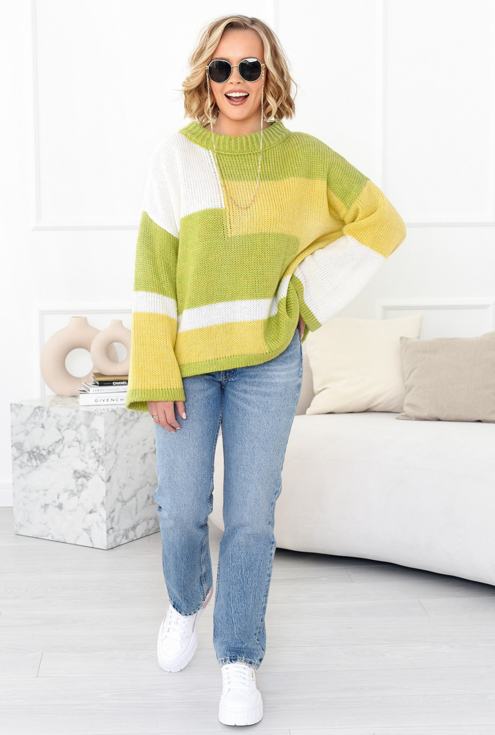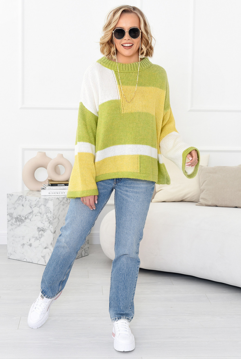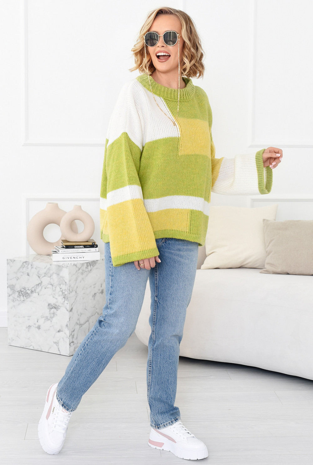 Krótki sweterek z domieszką wełny w składzie wyróżnia się oryginalną kolorystyką! Model z nieco szerszym rękawem, zakończony plisą pod szyją! Świetnie sprawdzi się w wiosennej stylizacji.