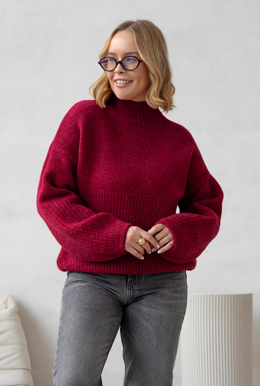 Miękki, przyjemny w dotyku sweterek z dodatkiem wełny. Model o lekko skróconym kroju i delikatnie zaokrąglonym dekolcie pięknie układa się na sylwetce. Charakteru dodają mu szersze rękawy zakończone ściągaczami, takimi samymi jak dół swetra.