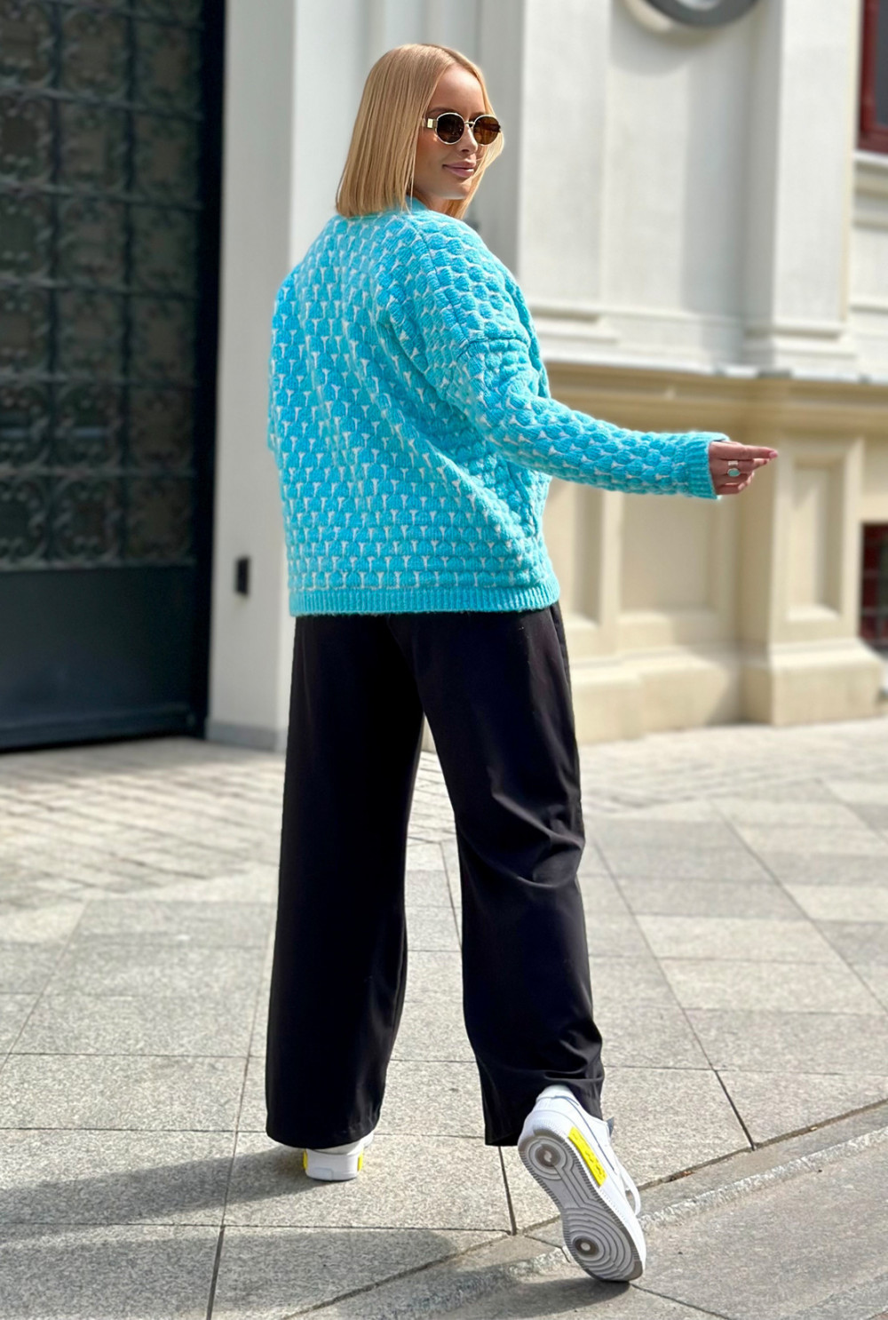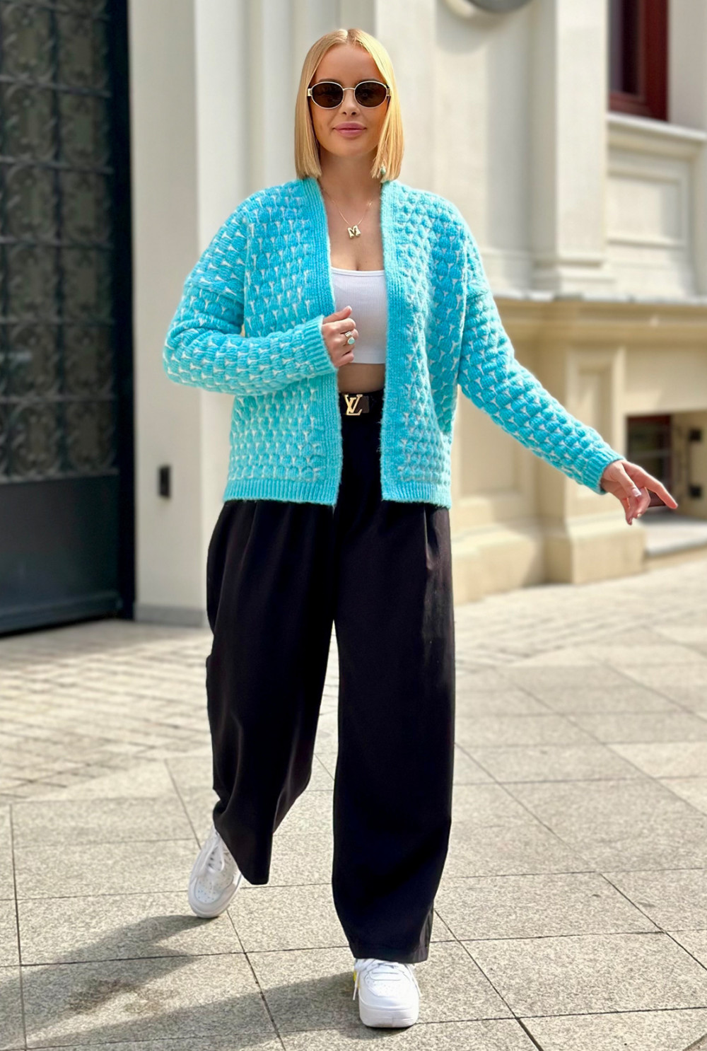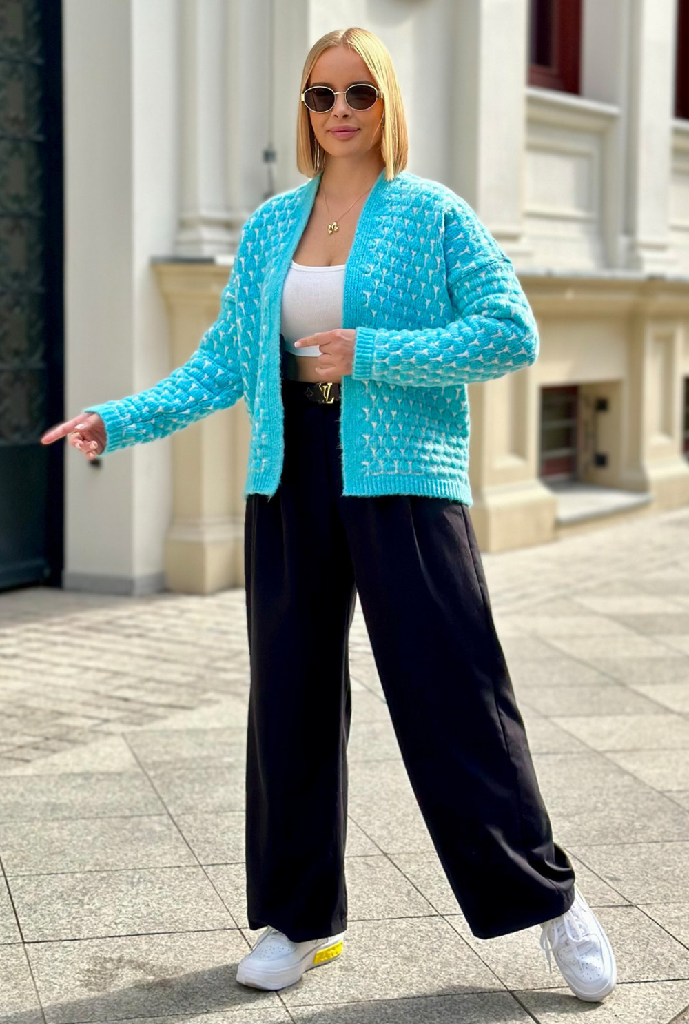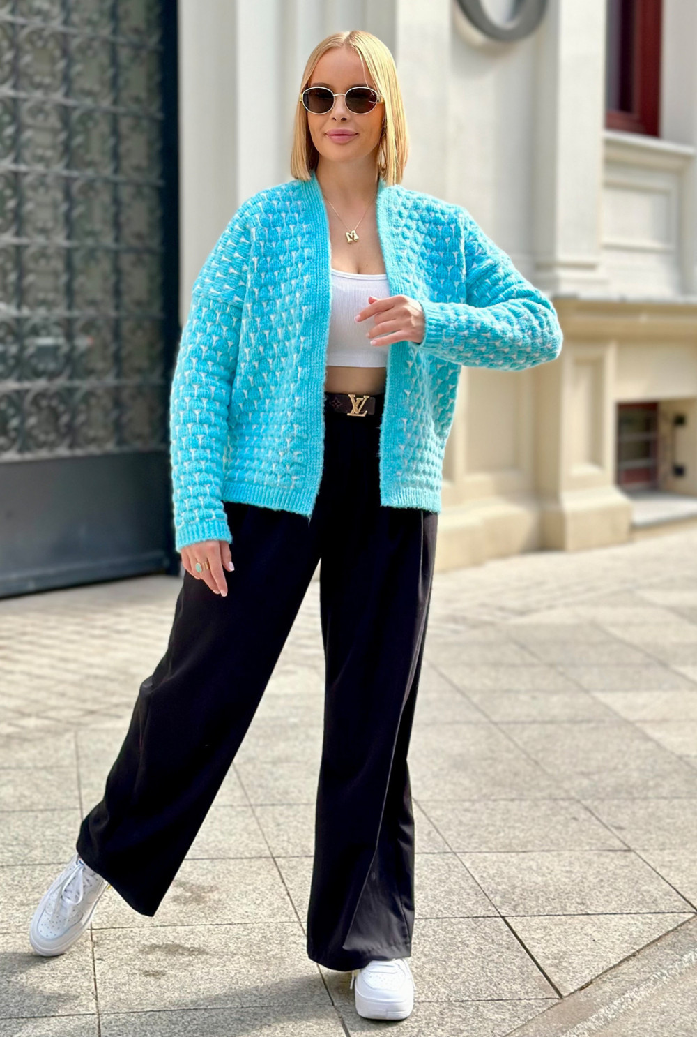 Krótki kardigan o oversizowym kroju to niezastąpiony element garderoby. Wyróżnia się oryginalnym połączeniem kolorów, które nadają mu charakteru. Doskonale sprawdzi się w codziennych stylizacjach, zapewniając wygodę i luz na co dzień.