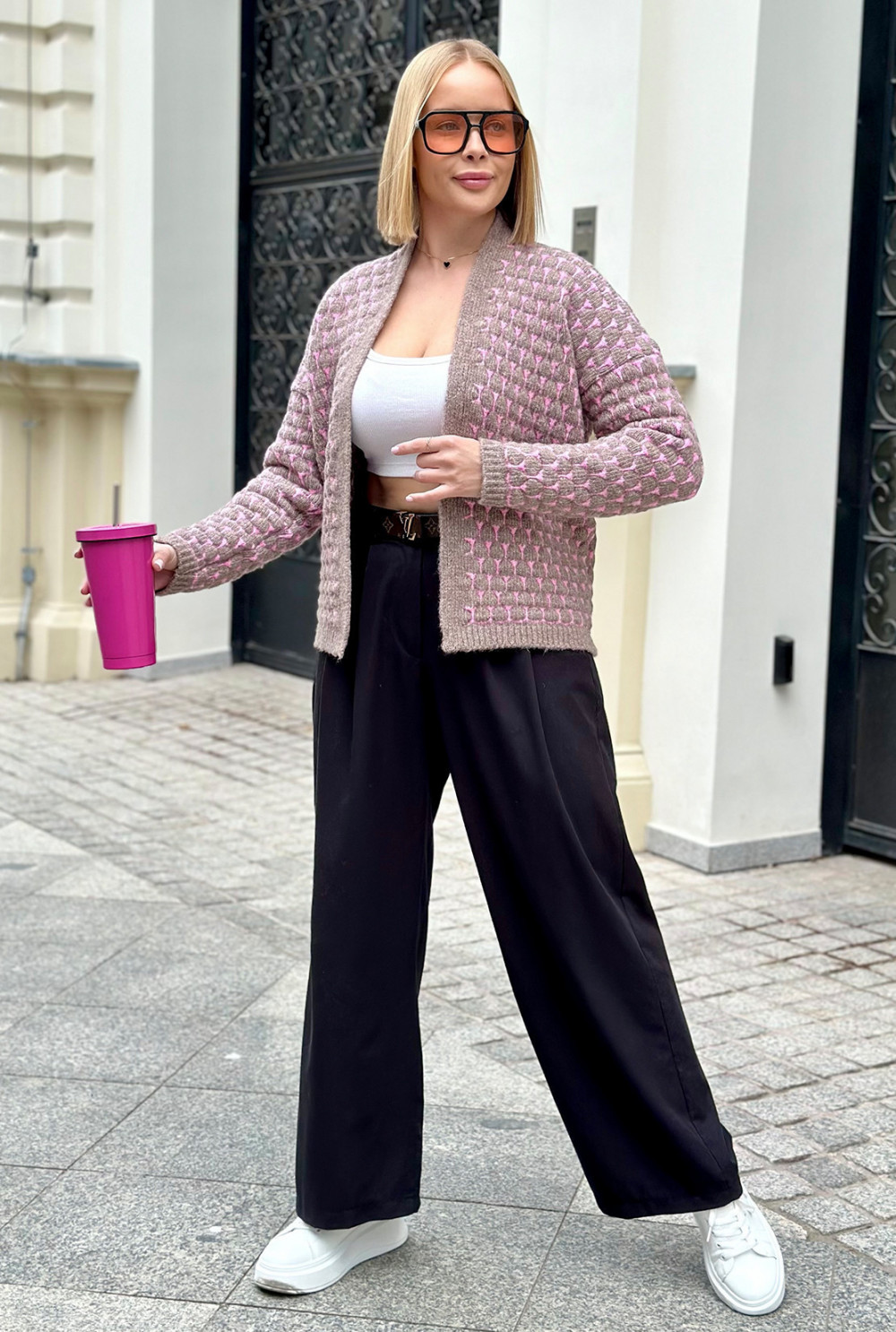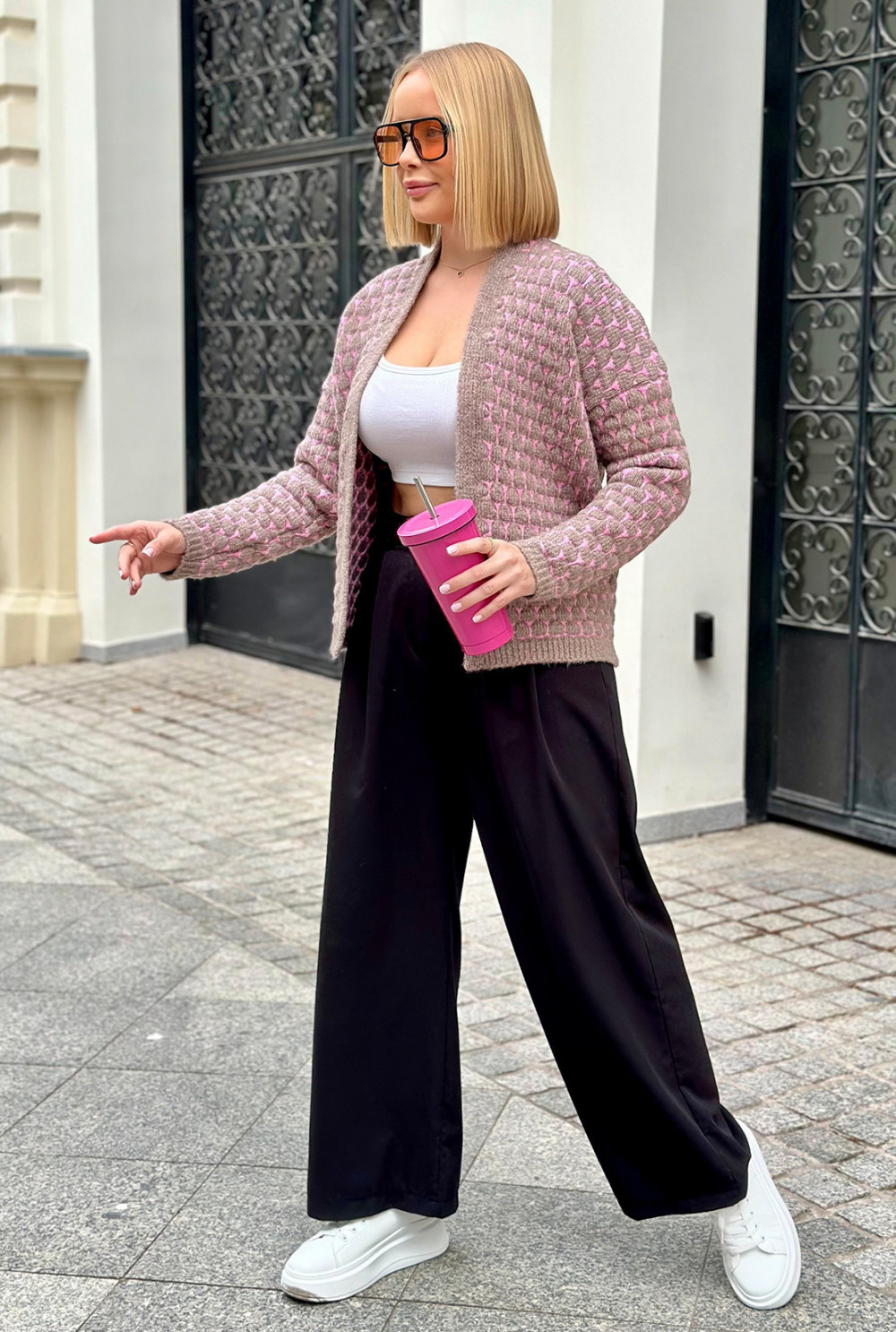 Krótki kardigan o oversizowym kroju to niezastąpiony element garderoby. Wyróżnia się oryginalnym połączeniem kolorów, które nadają mu charakteru. Doskonale sprawdzi się w codziennych stylizacjach, zapewniając wygodę i luz na co dzień.