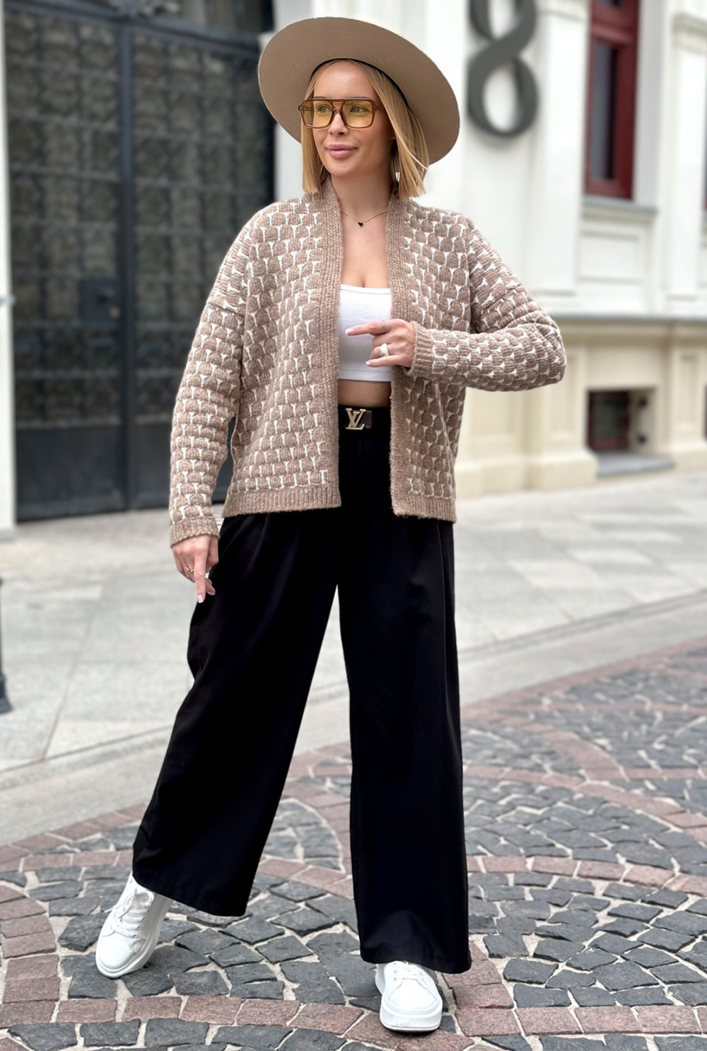 Krótki kardigan o oversizowym kroju to niezastąpiony element garderoby. Wyróżnia się oryginalnym połączeniem kolorów, które nadają mu charakteru. Doskonale sprawdzi się w codziennych stylizacjach, zapewniając wygodę i luz na co dzień.