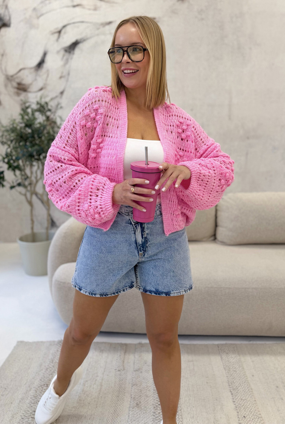 Niesamowicie dziewczęcy krótki kardigan z domieszką wełny i ozdobnym splotem w kształcie serduszek. Doskonale sprawdzi się jako dopełnienie stylizacji na co dzień. Model o oversizowym kroju, rękawy i dół zostały wykończone ściągaczami.