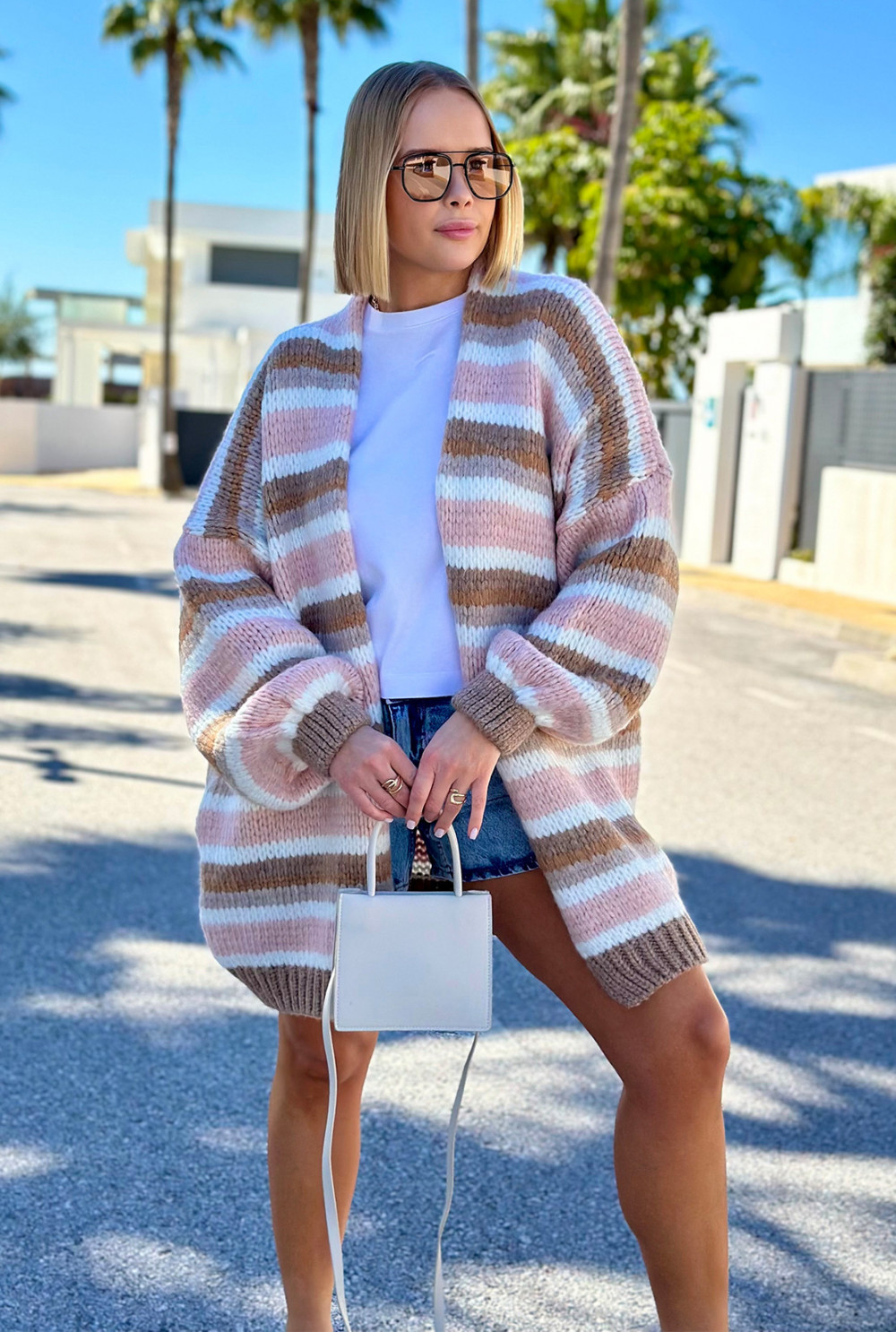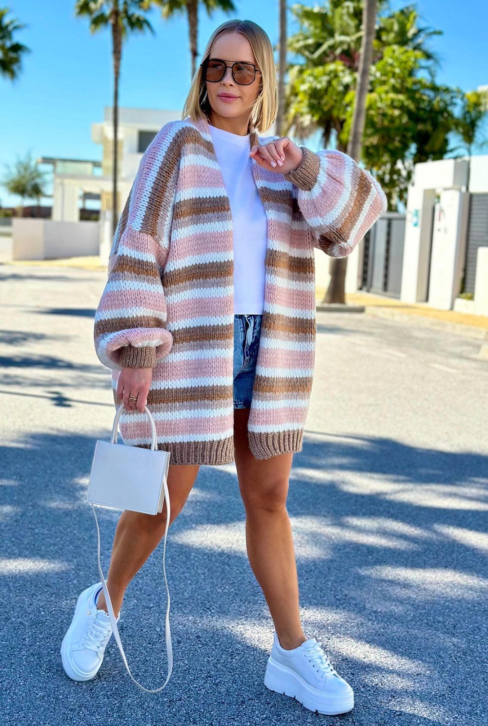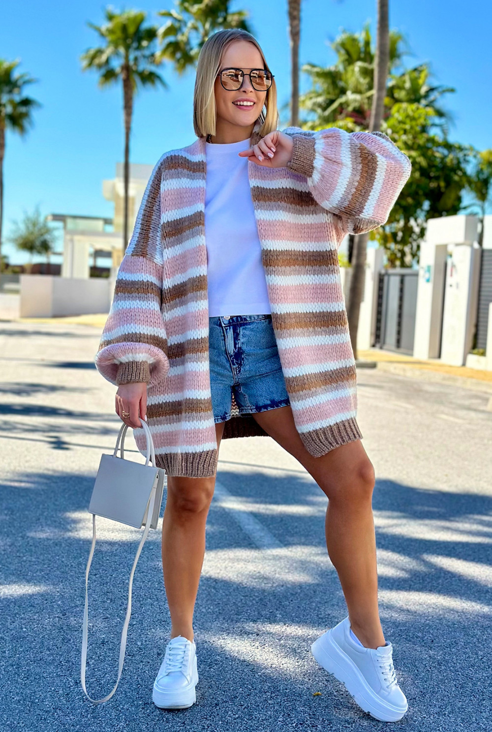 Kardigan oversize w paski Nela Latte-ecru-róż