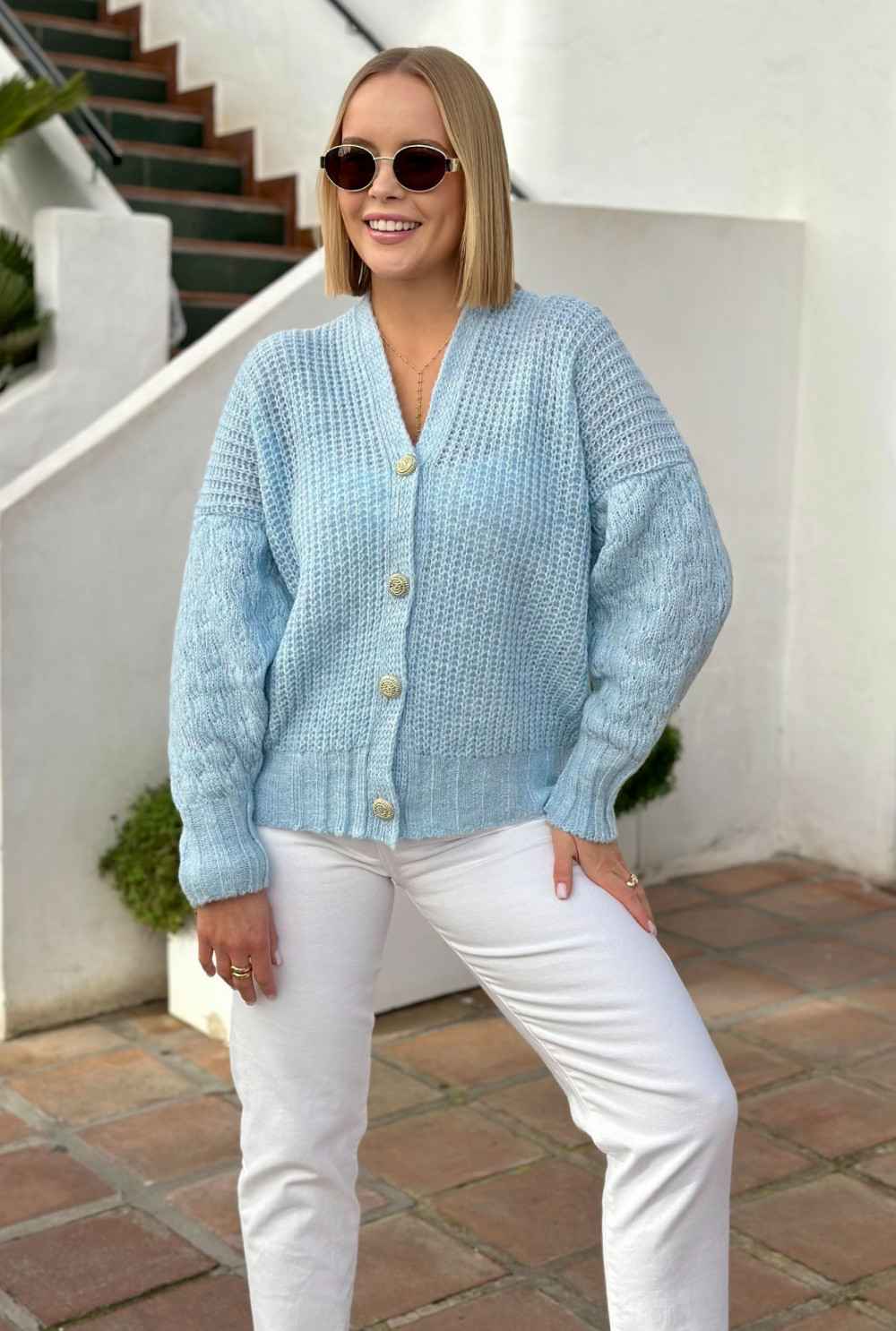 Krótki sweter zapinany na złote guziki to świetna baza do codziennych stylizacji. Ma delikatnie bufiaste rękawy, a przy rękawach i na dole wykończony jest ściągaczem, dzięki czemu ładnie układa się na sylwetce. Dużym plusem jest dekolt w kształcie litery V, który ładnie eksponuje górną część sylwetki. Model występuje w kilku wariantach kolorystycznych.