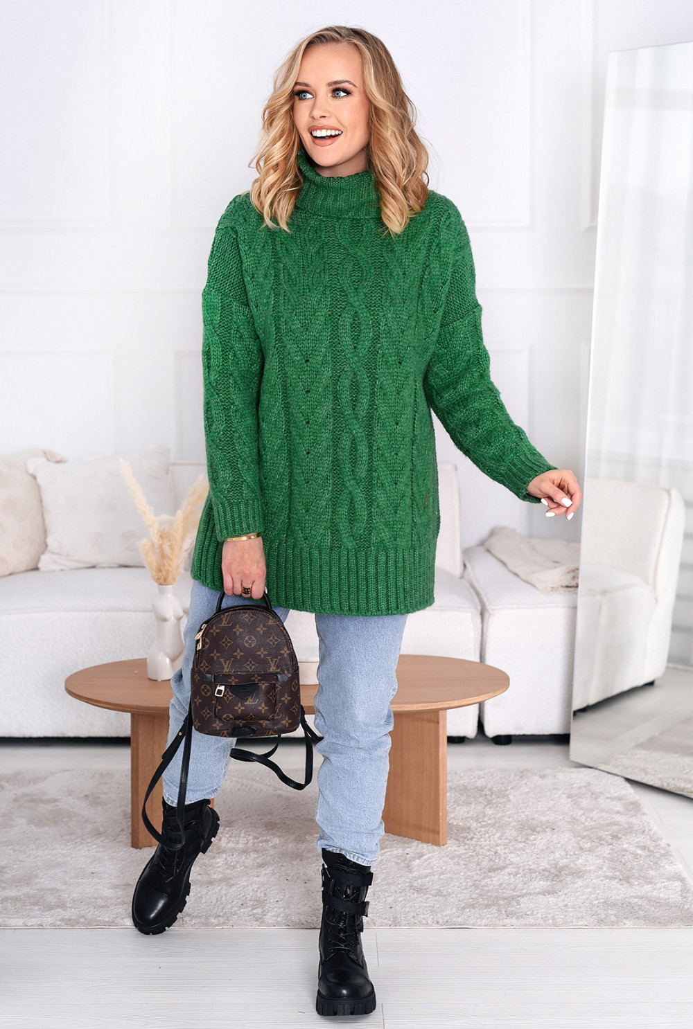 Dłuższy sweter z golfem i ozdobnym splotem. Model zakończony ściągaczem przy rękawach i na dole. Możesz zestawić go z halką lub spodniami i ciężkimi butami – świetna stylizacja gotowa!