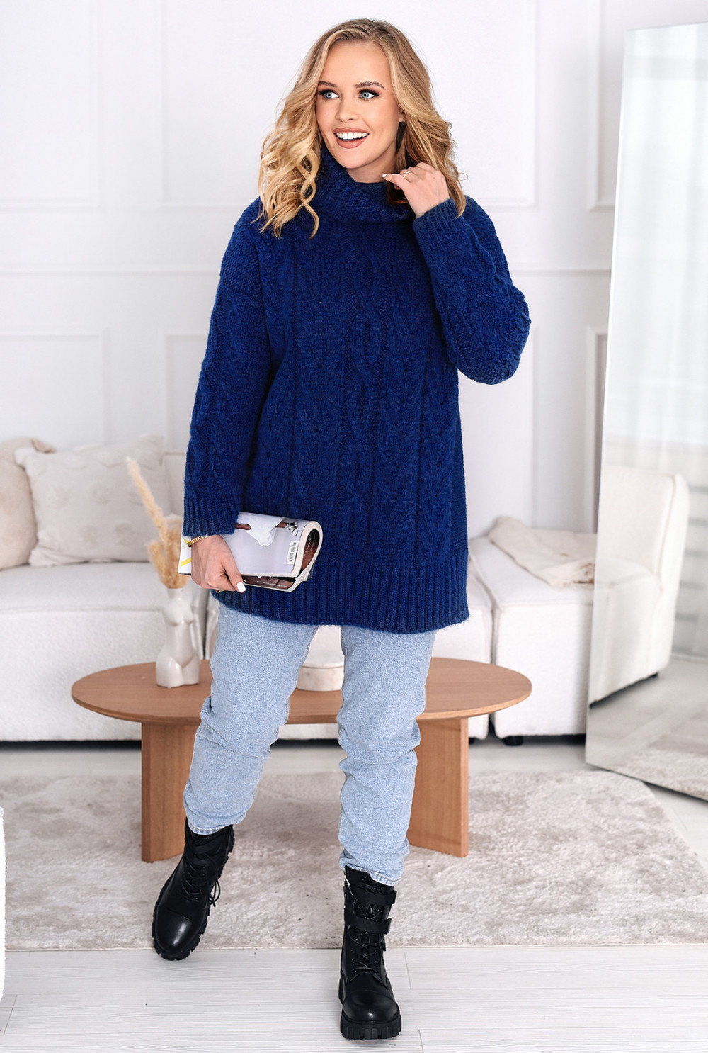 Dłuższy sweter z golfem i ozdobnym splotem. Model zakończony ściągaczem przy rękawach i na dole. Możesz zestawić go z halką lub spodniami i ciężkimi butami – świetna stylizacja gotowa!