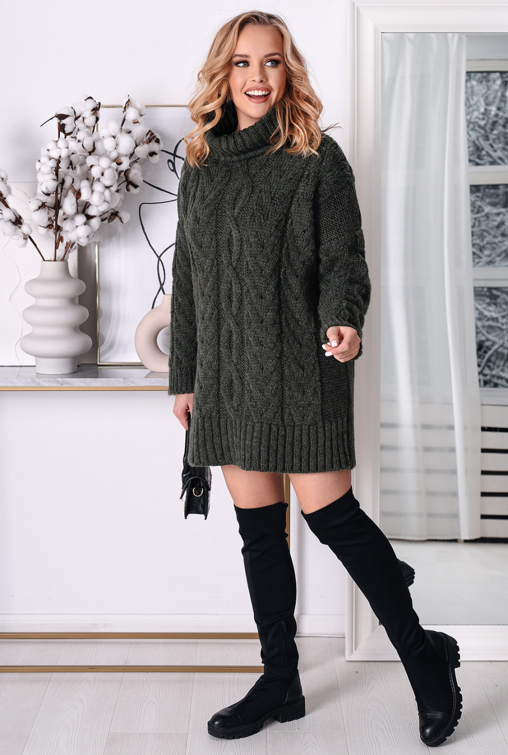 Dłuższy sweter z golfem i ozdobnym splotem. Model zakończony ściągaczem przy rękawach i na dole. Możesz zestawić go z halką lub spodniami i ciężkimi butami – świetna stylizacja gotowa!