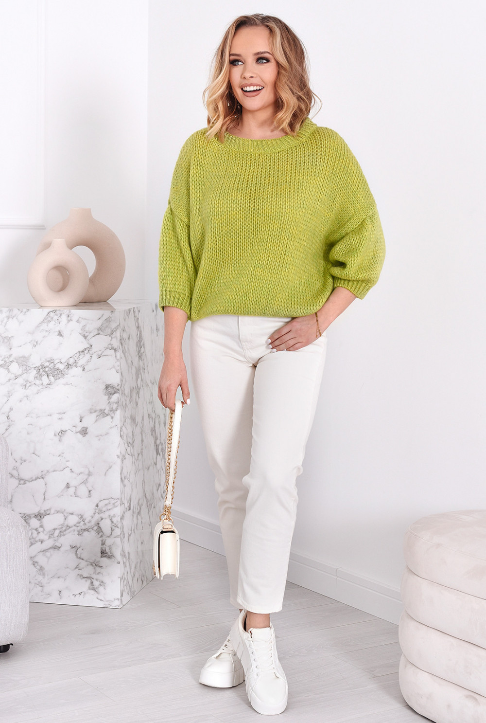 Miękki sweterek to ponadczasowa propozycja idealna na chłodniejsze dni. Charakteryzuje się lekko oversizowym krojem oraz krótkimi rękawami i dołem wykończonymi ściągaczami. To model, który świetnie uzupełni codzienne, wygodne stylizacje, nadając im ciepłego i przytulnego charakteru.