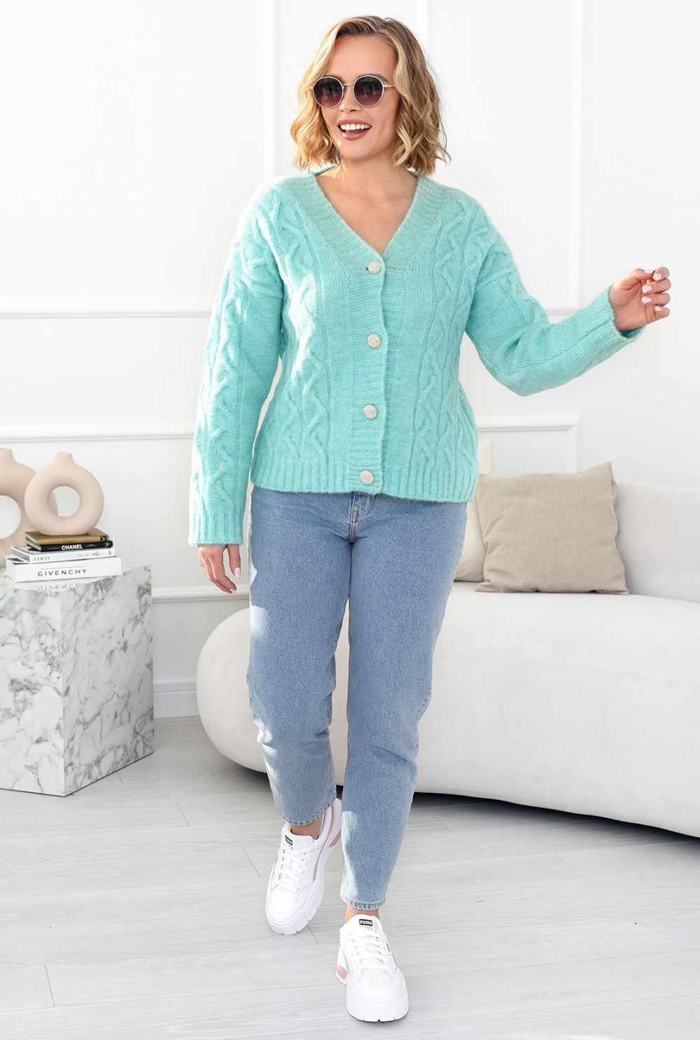 Krótki rozpinany sweter z ozdobnym splotem! Model wykonany z najwyższej jakości materiałów z domieszką wełny. Posiada dekolt w serek. Świetnie uzupełni każdy wiosenny look!