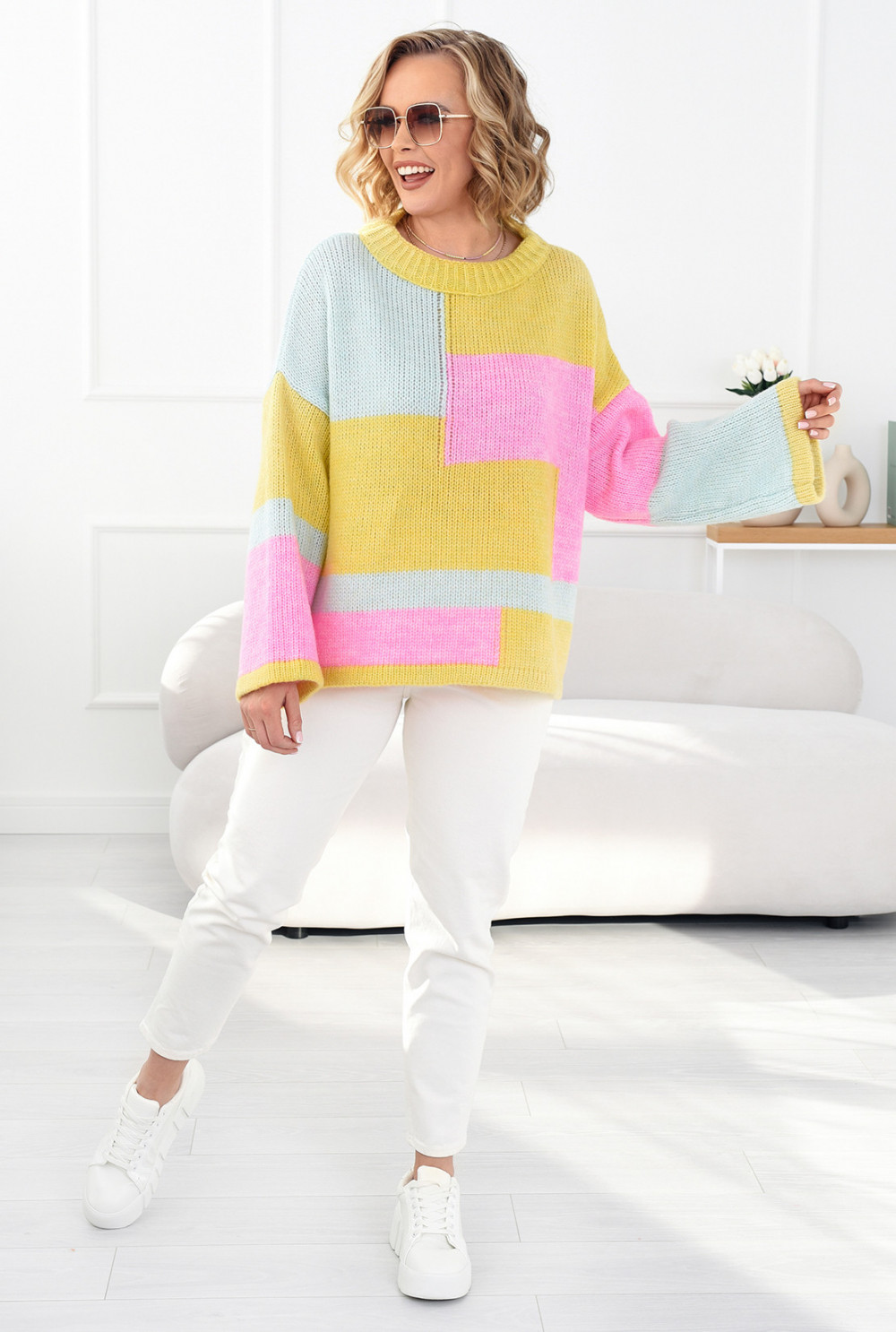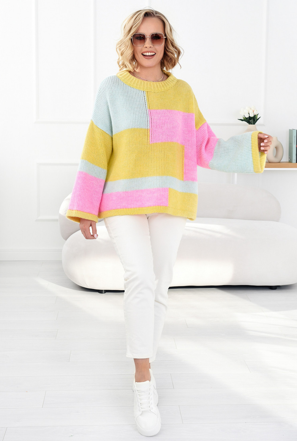 Krótki sweterek z domieszką wełny w składzie wyróżnia się oryginalną kolorystyką! Model z nieco szerszym rękawem, zakończony plisą pod szyją! Świetnie sprawdzi się w wiosennej stylizacji.