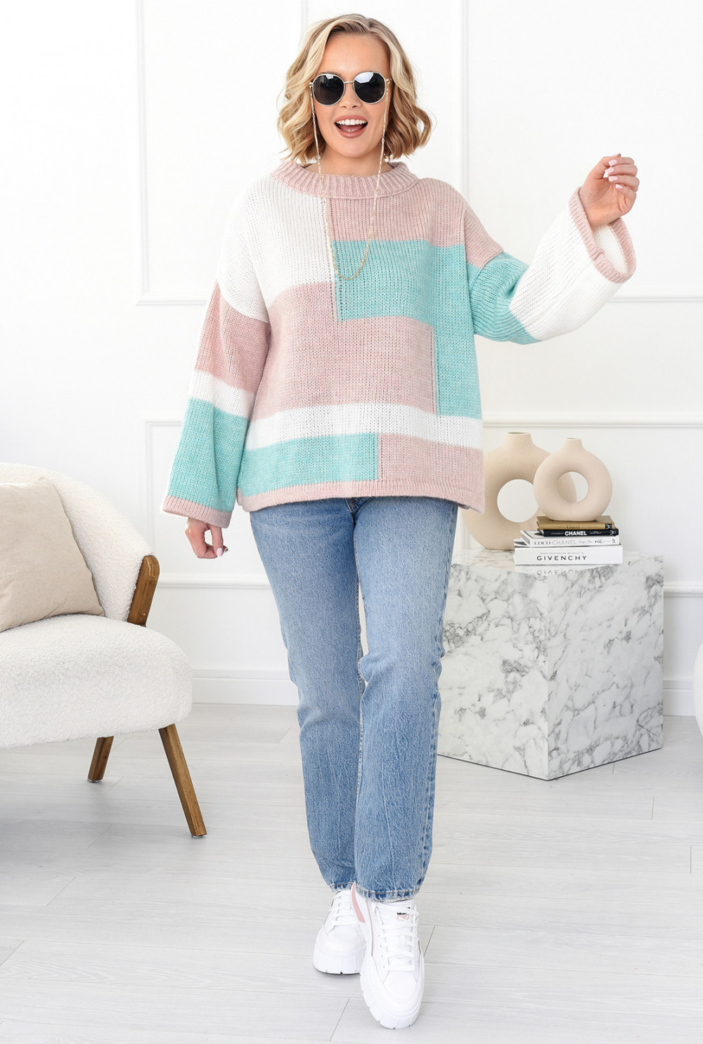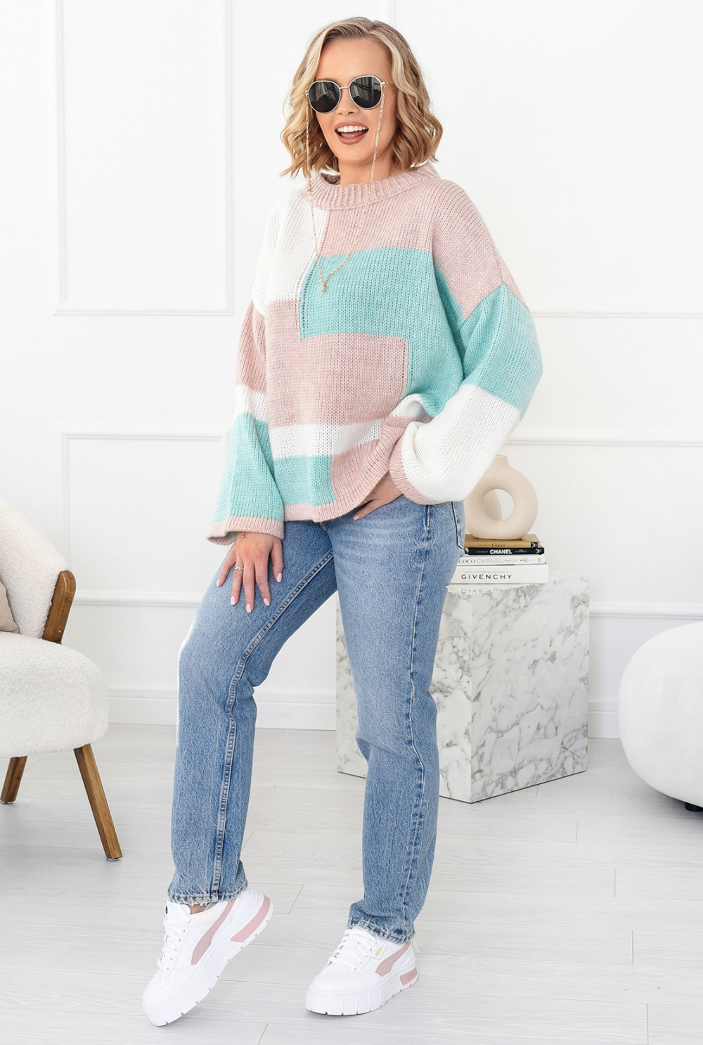 Krótki sweterek z domieszką wełny w składzie wyróżnia się oryginalną kolorystyką! Model z nieco szerszym rękawem, zakończony plisą pod szyją! Świetnie sprawdzi się w wiosennej stylizacji.