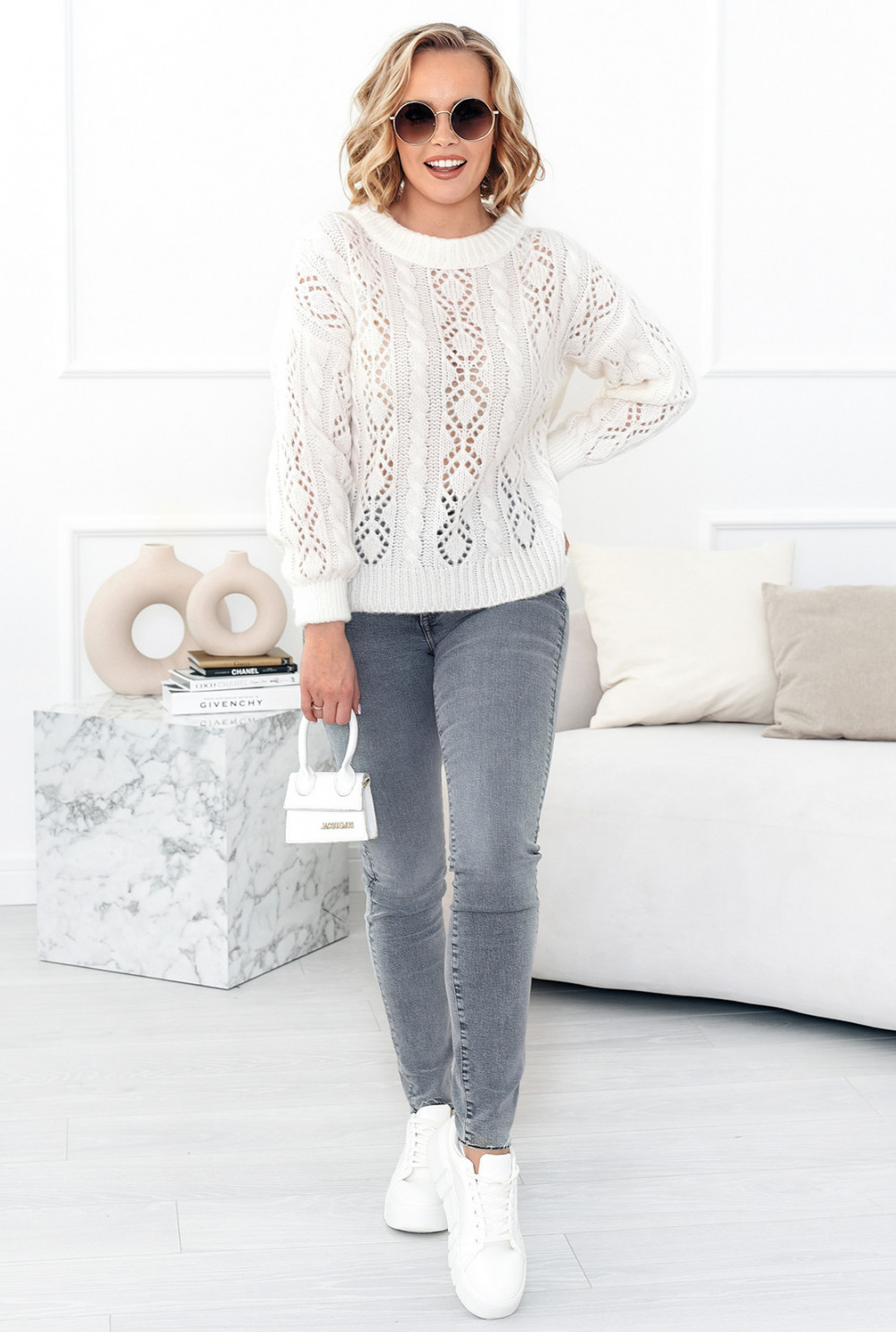 Krótki ażurowy sweter wykonany z najwyższej jakości materiałów. Model zakończony ściągaczami na dole i przy rękawach. Świetnie sprawdzi się na wiosenne i letnie dni!