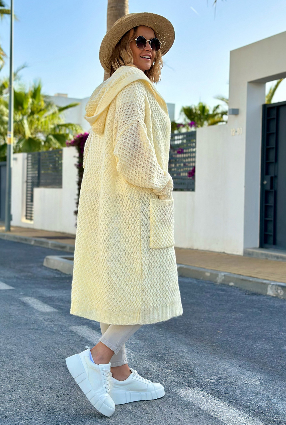 Długi, cienki kardigan z kieszeniami i kapturem. Model wykonany ze splotu przypominający plastry miodu. Idealnie dopełni każdą stylizację!