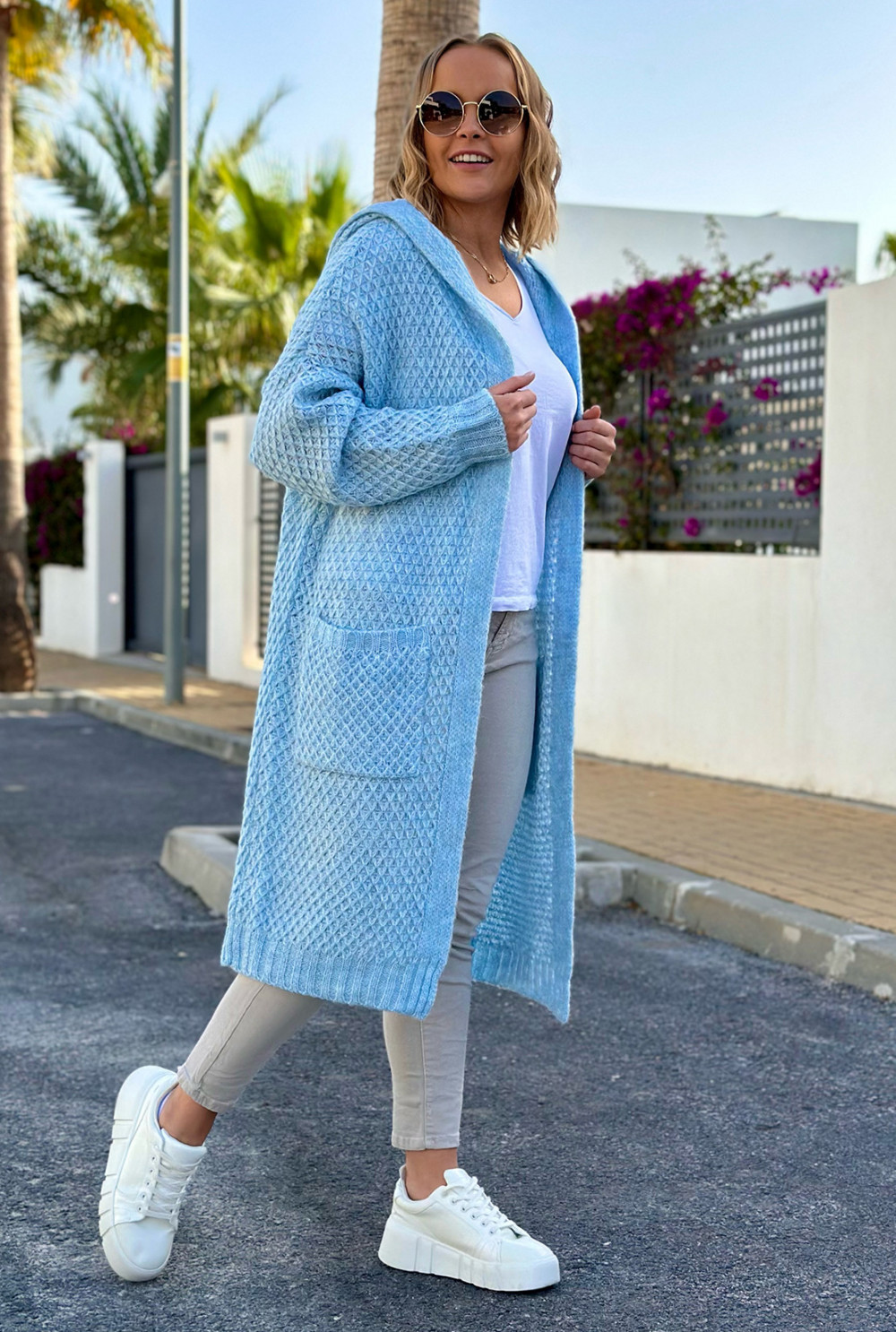Długi kardigan z kieszeniami i kapturem Luise Błękit