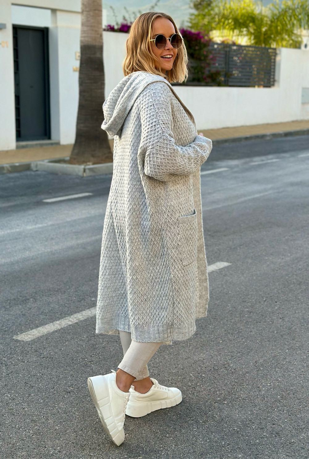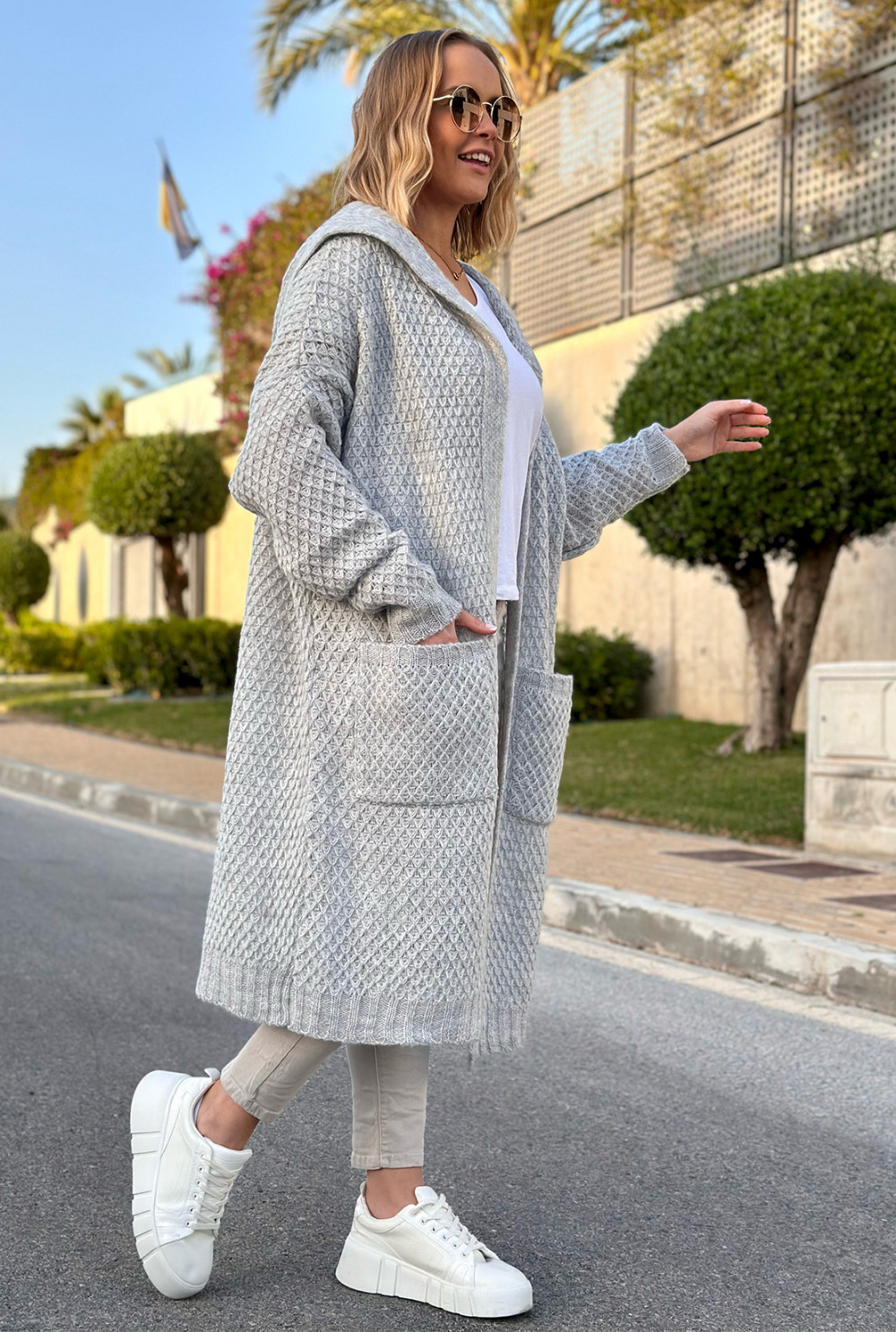 Długi, cienki kardigan z kieszeniami i kapturem. Model wykonany ze splotu przypominający plastry miodu. Idealnie dopełni każdą stylizację!