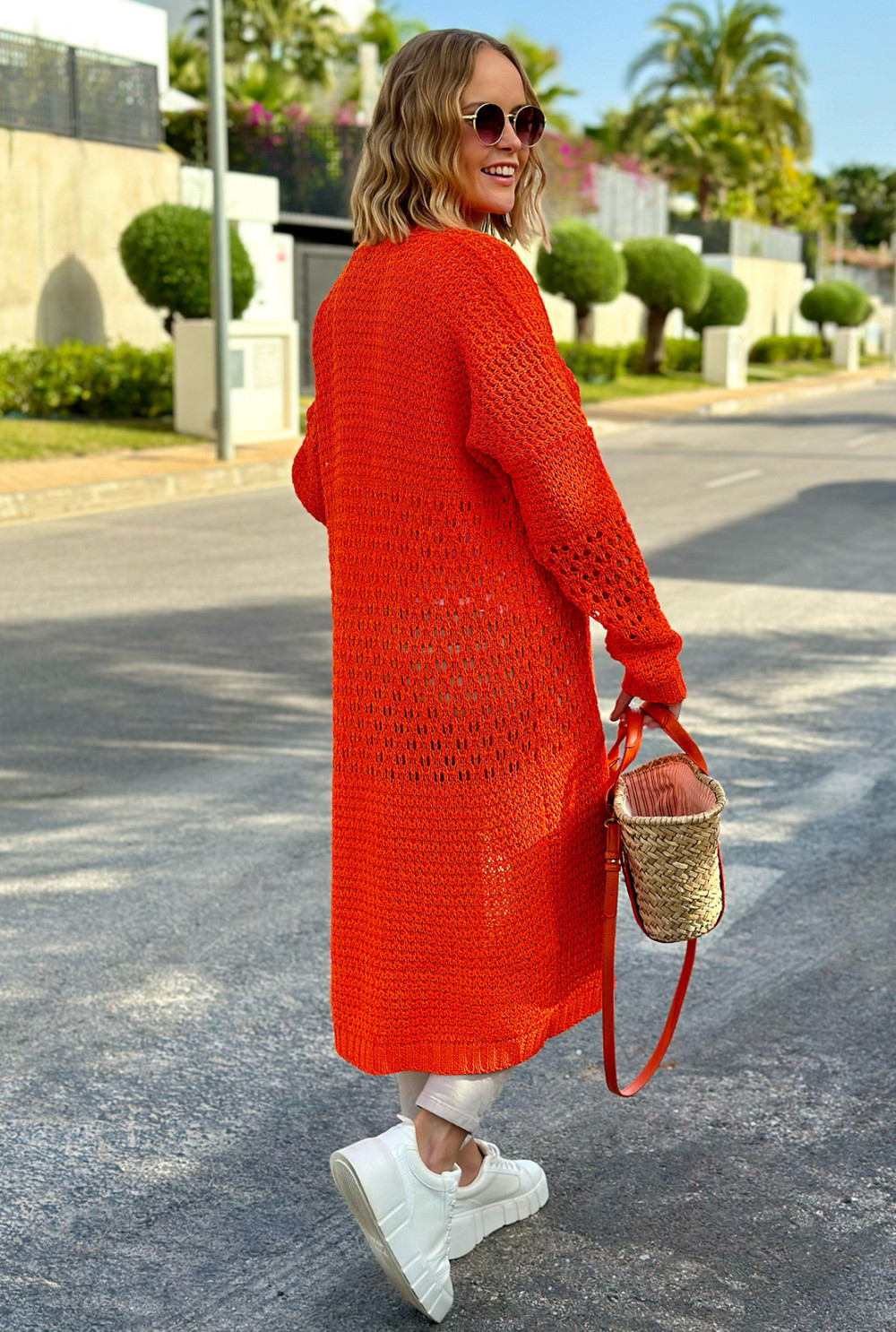 Długi kardigan wykonany z ażurowego splotu. Świetnie dopełni każdą wiosenno-letnią stylizację!