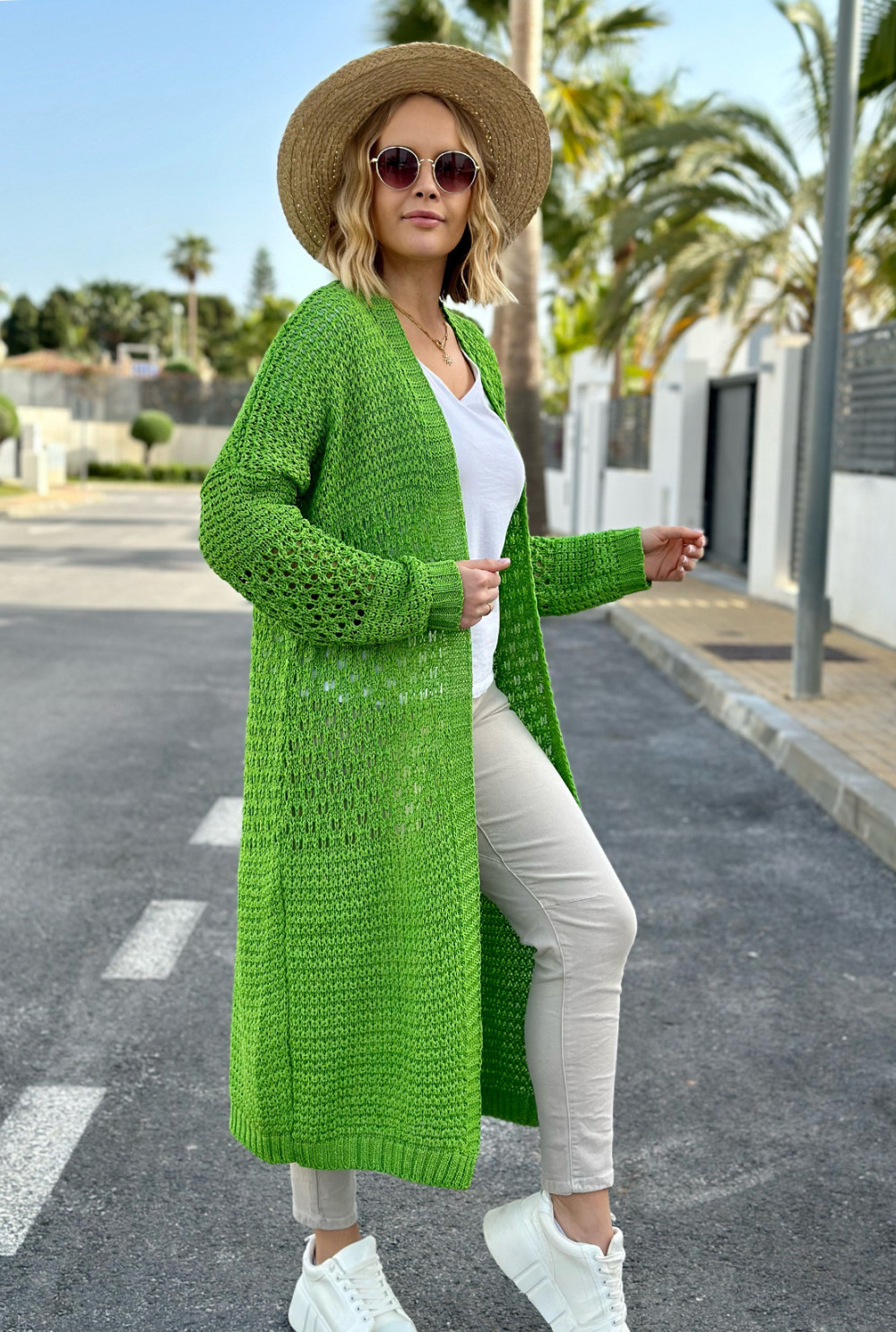 Długi kardigan wykonany z ażurowego splotu. Świetnie dopełni każdą wiosenno-letnią stylizację!