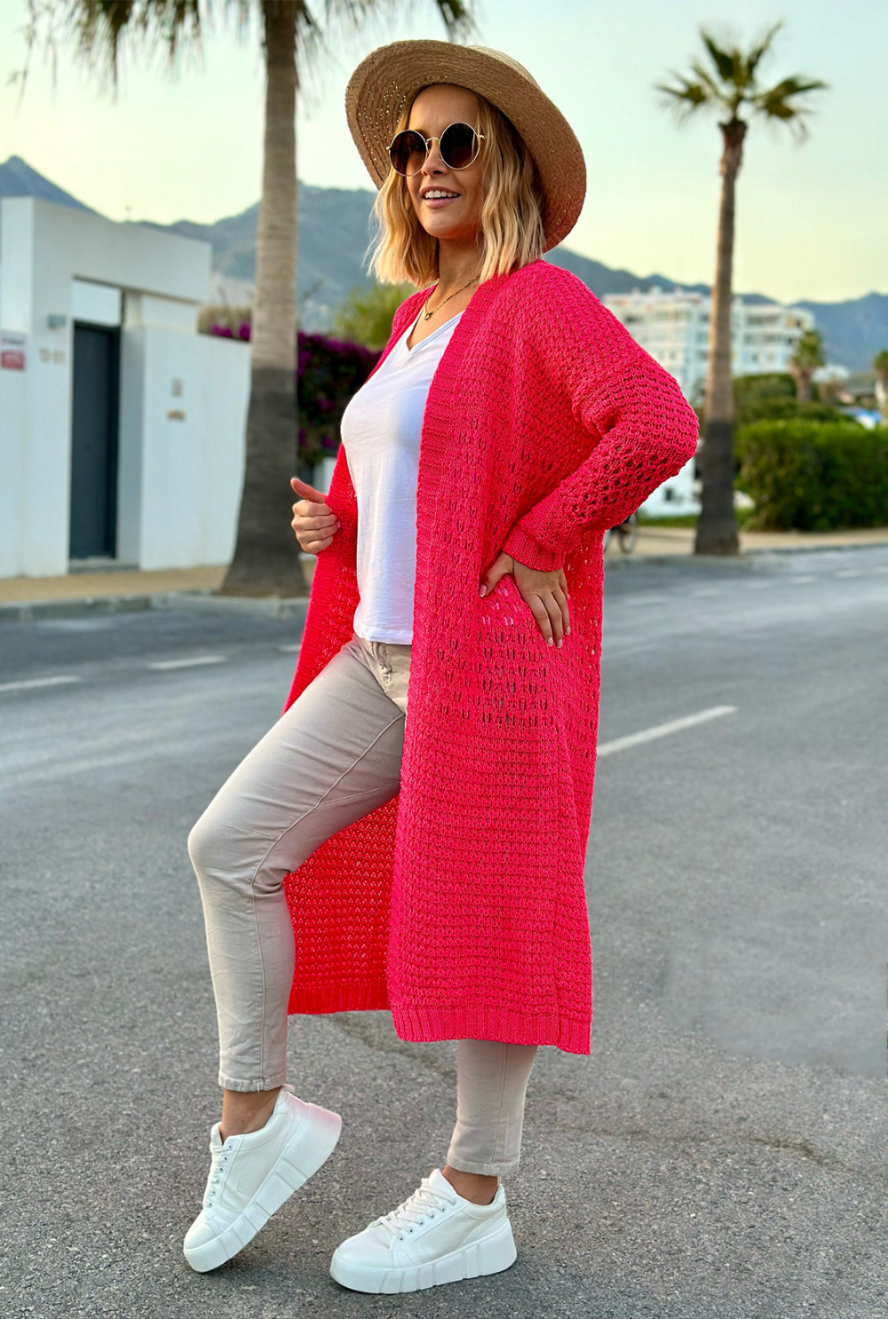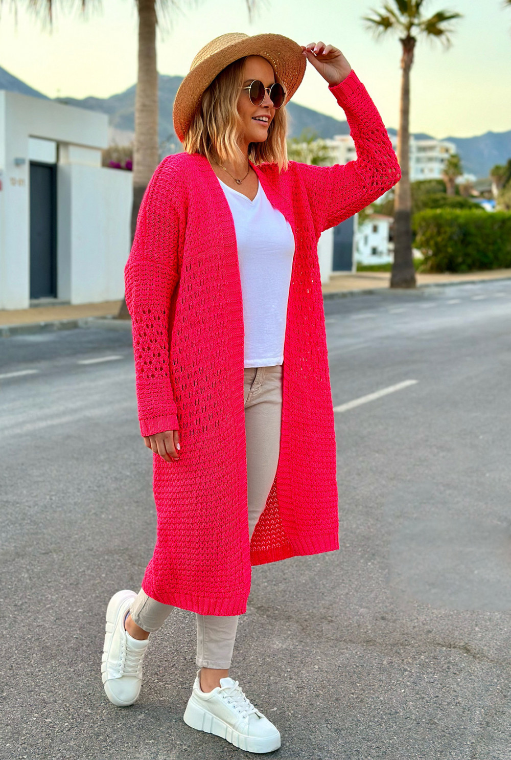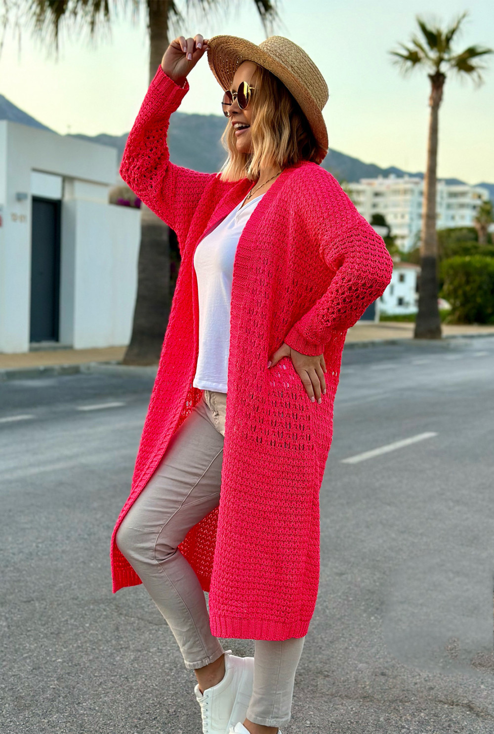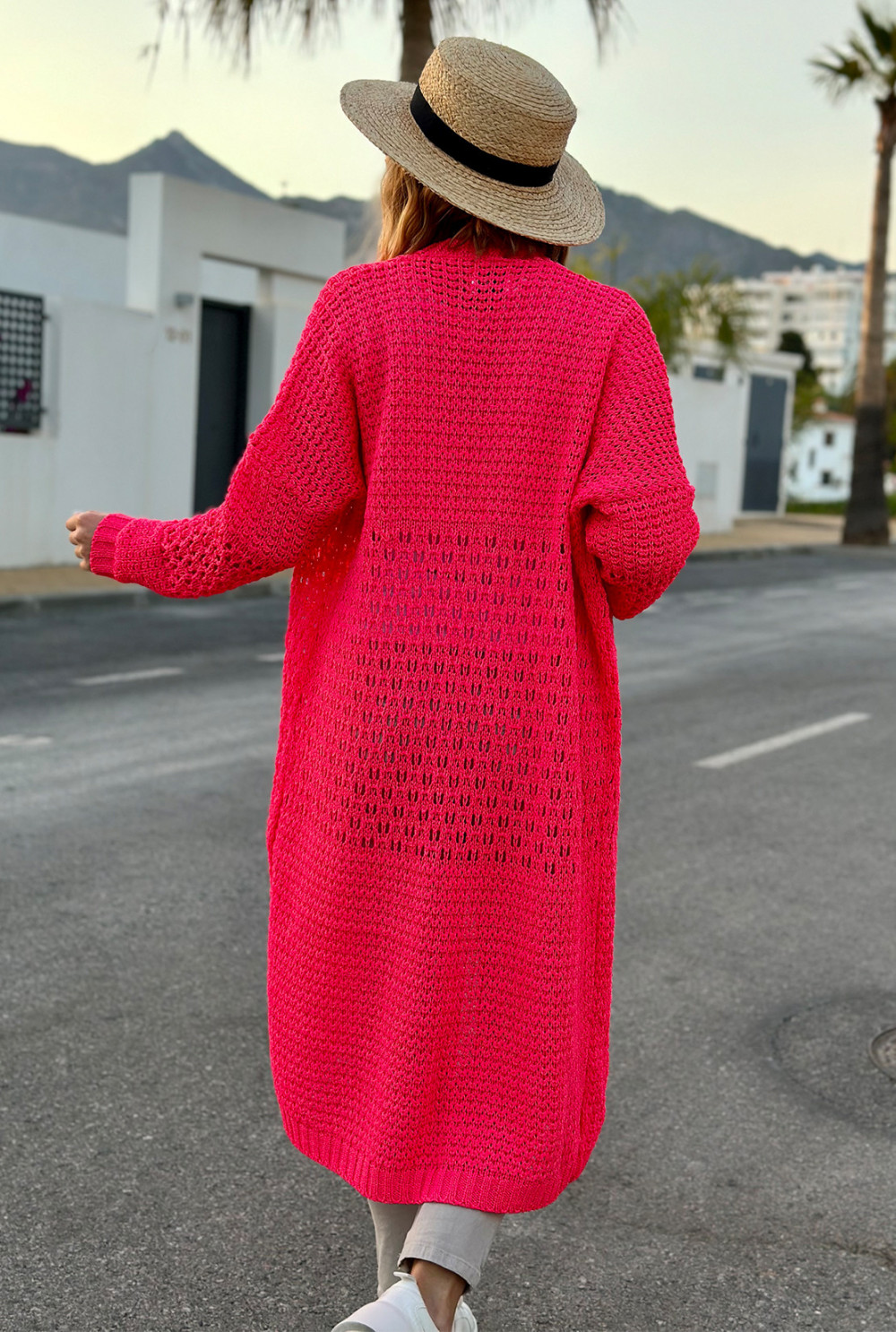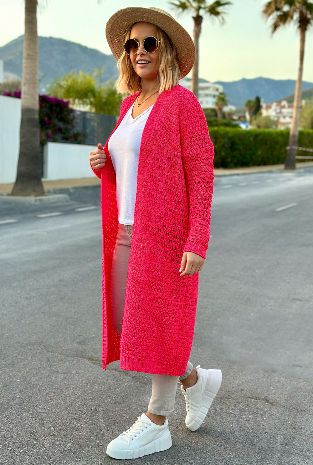 Długi ażurowy kardigan Carla Fuksja