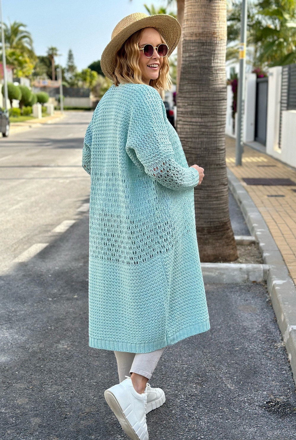 Długi kardigan wykonany z ażurowego splotu. Świetnie dopełni każdą wiosenno-letnią stylizację!