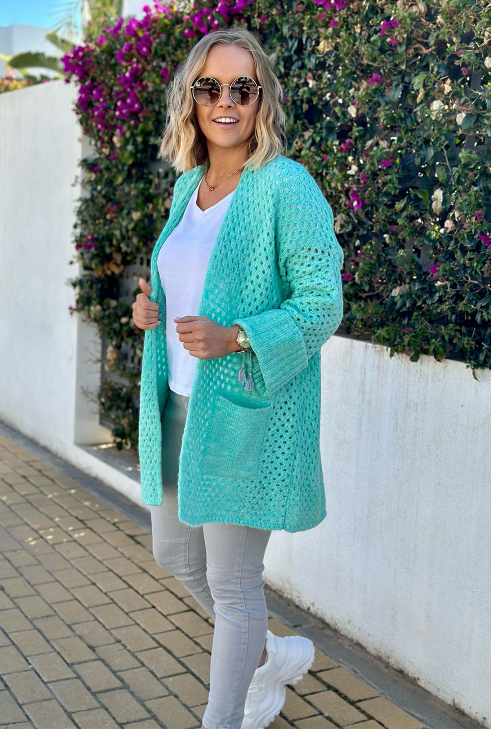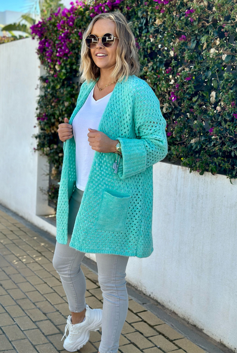 Przepiękny kardigan wykonany z ażurowego splotu. Model posiada praktyczne kieszenie. Wyróżnia go wywijany rękaw! Świetnie sprawdzi się w wiosenno-letniej stylizacji!
