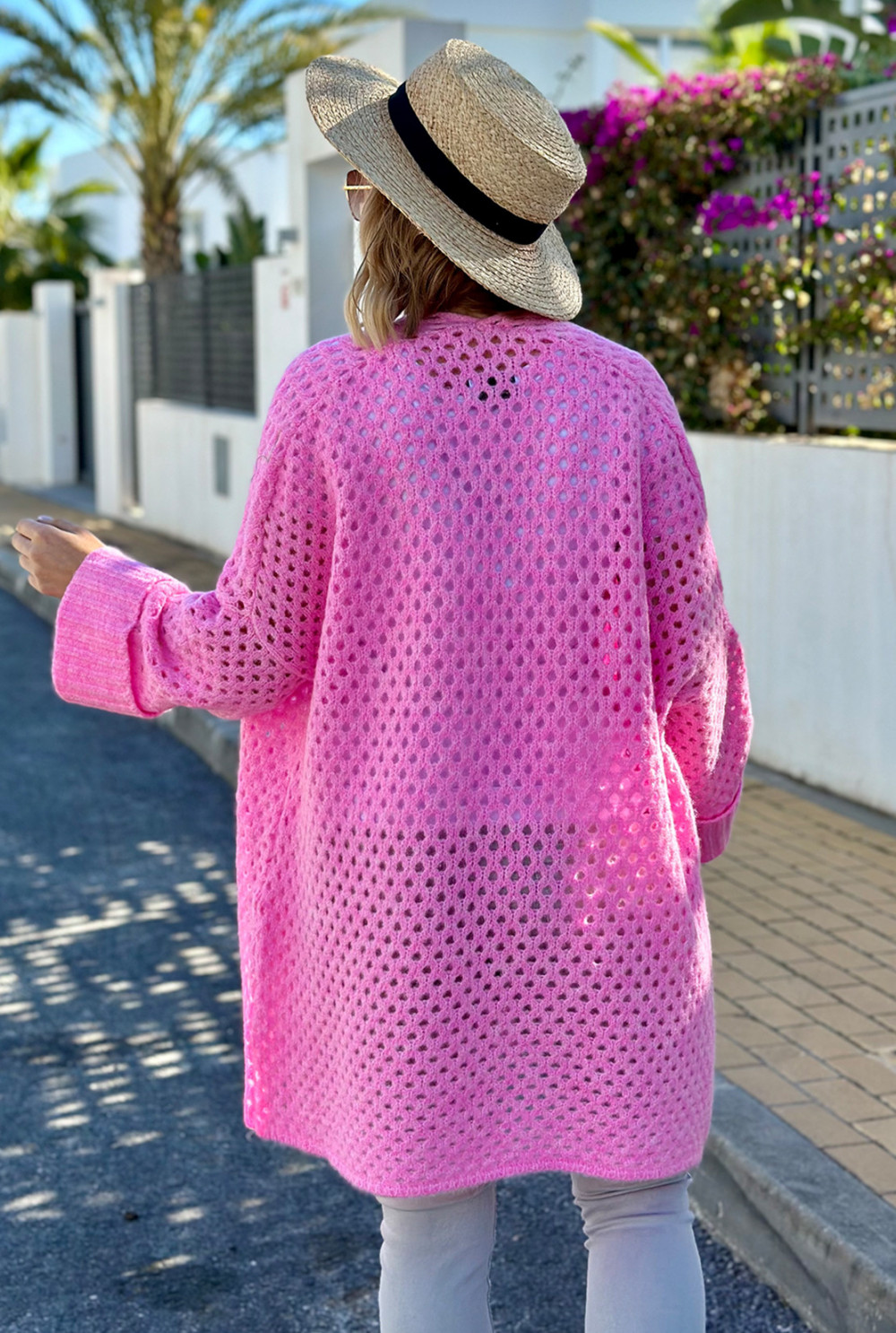 Przepiękny kardigan wykonany z ażurowego splotu. Model posiada praktyczne kieszenie. Wyróżnia go wywijany rękaw! Świetnie sprawdzi się w wiosenno-letniej stylizacji!
