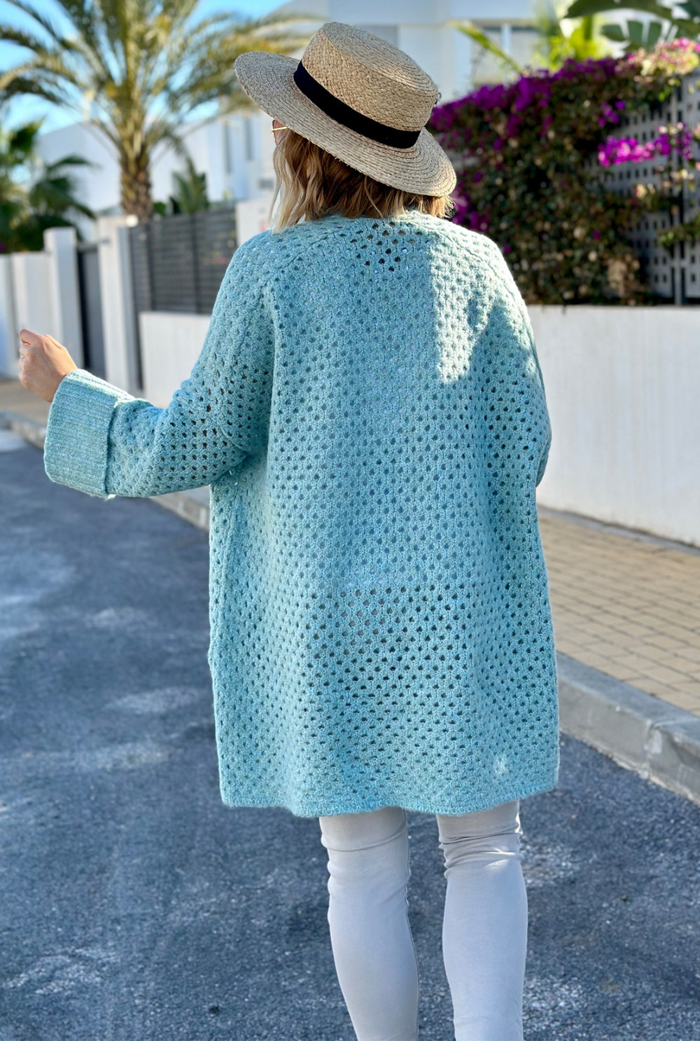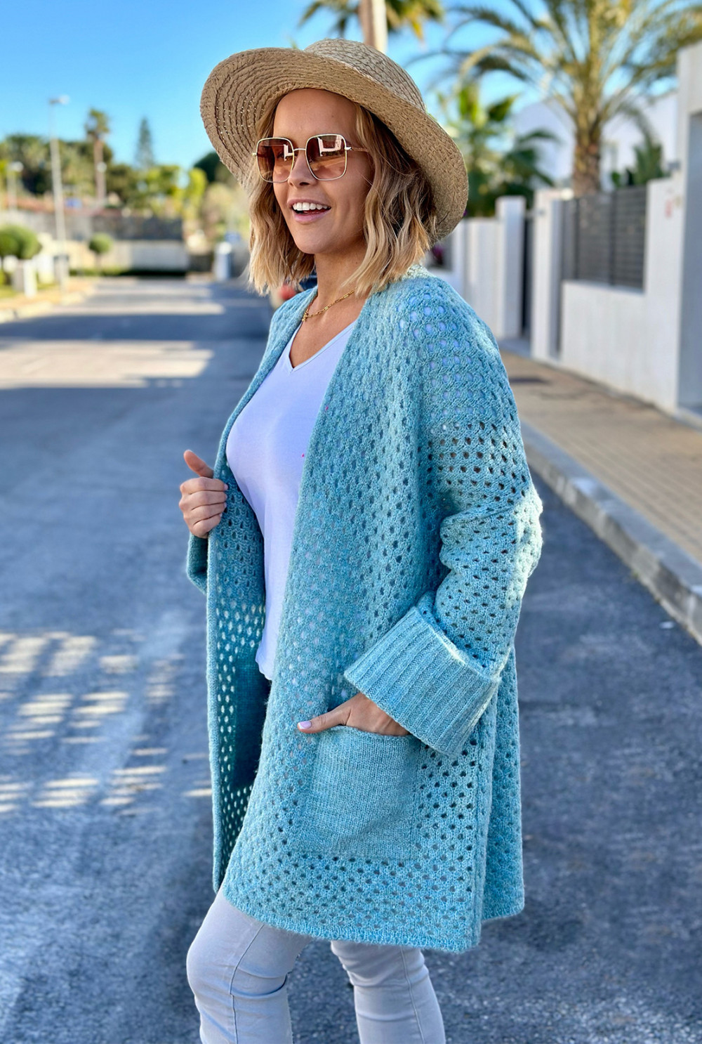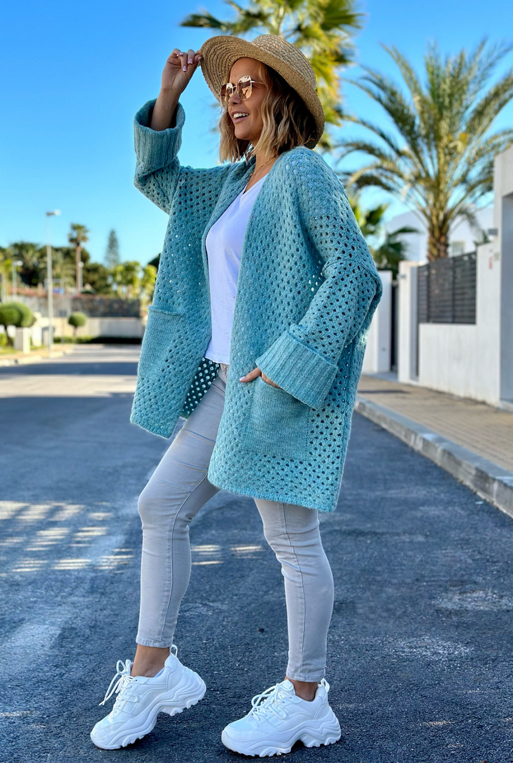 Ażurowy kardigan z kieszeniami Santiago Turkus