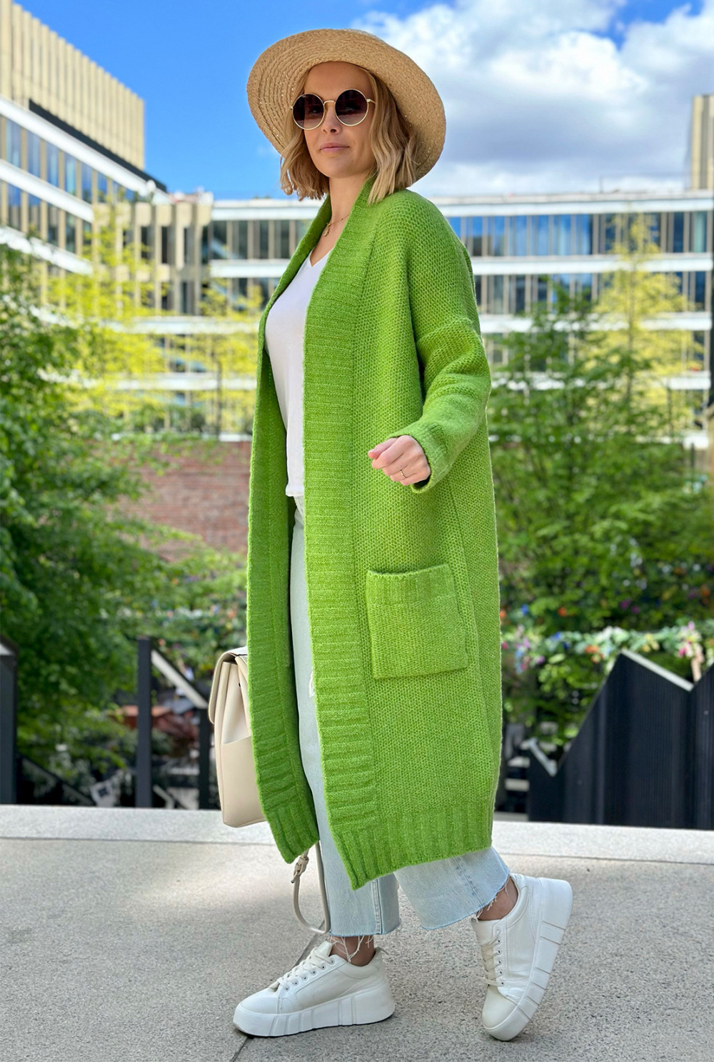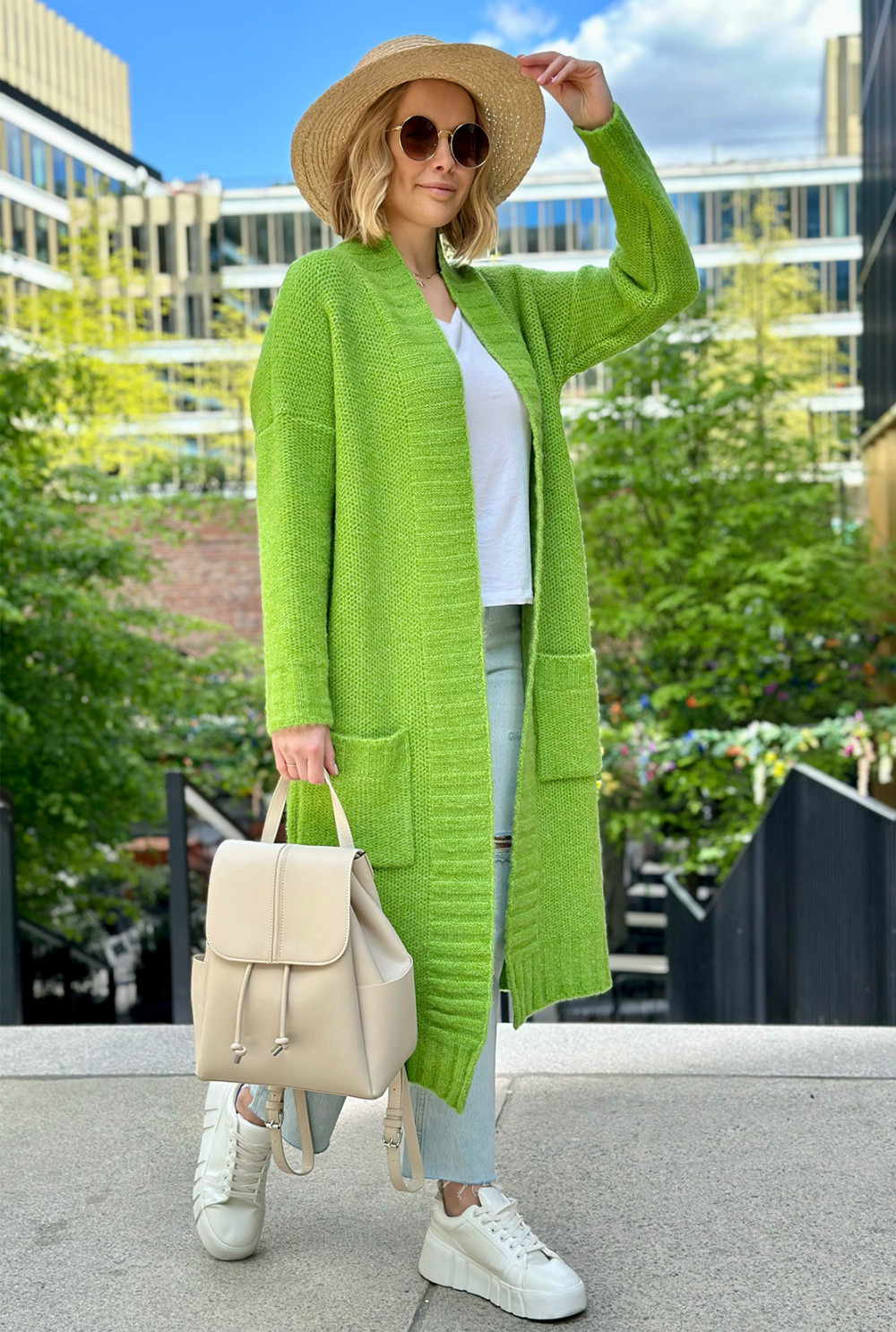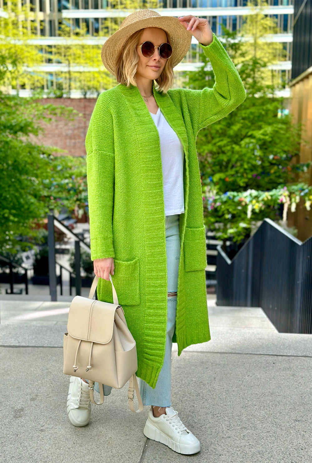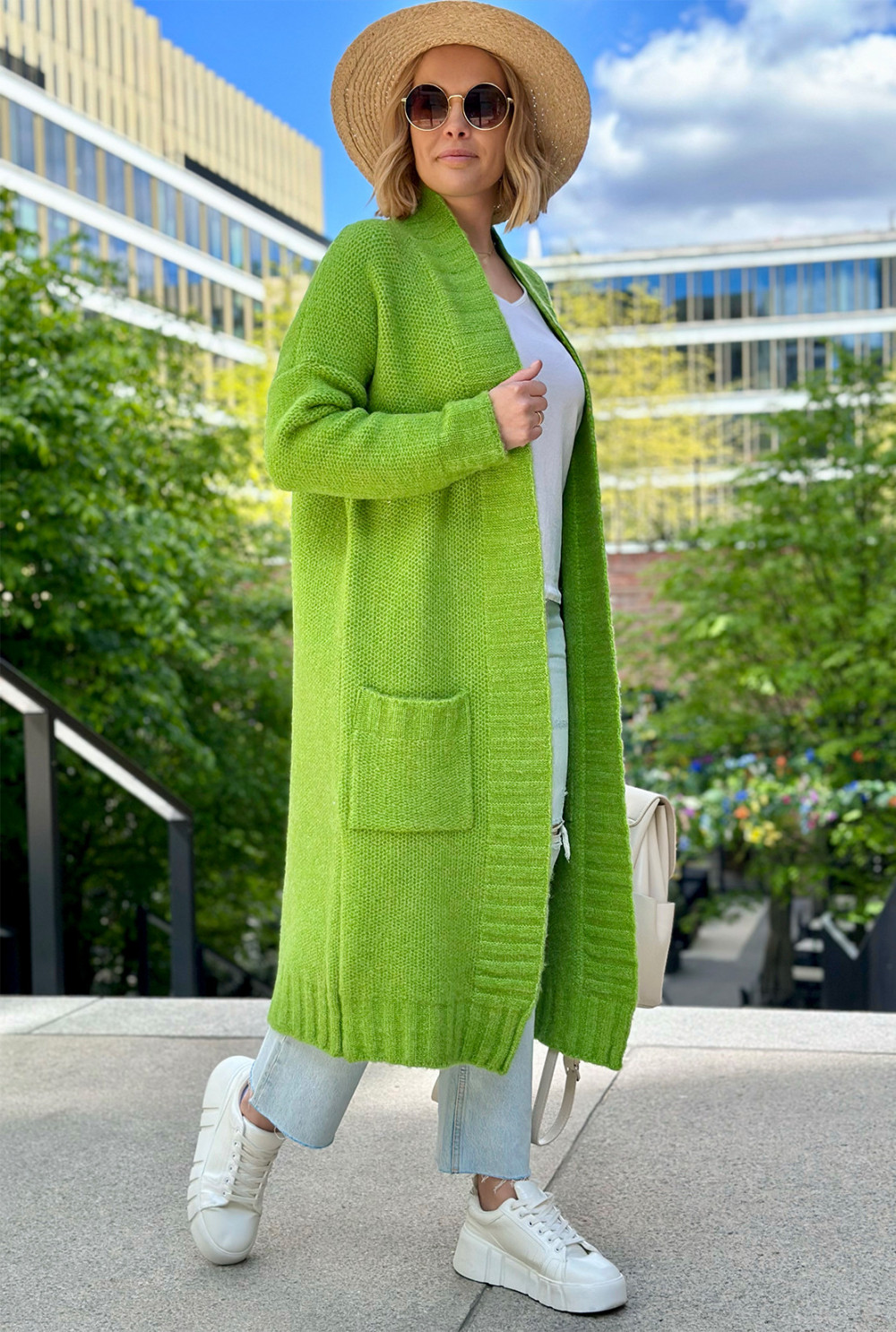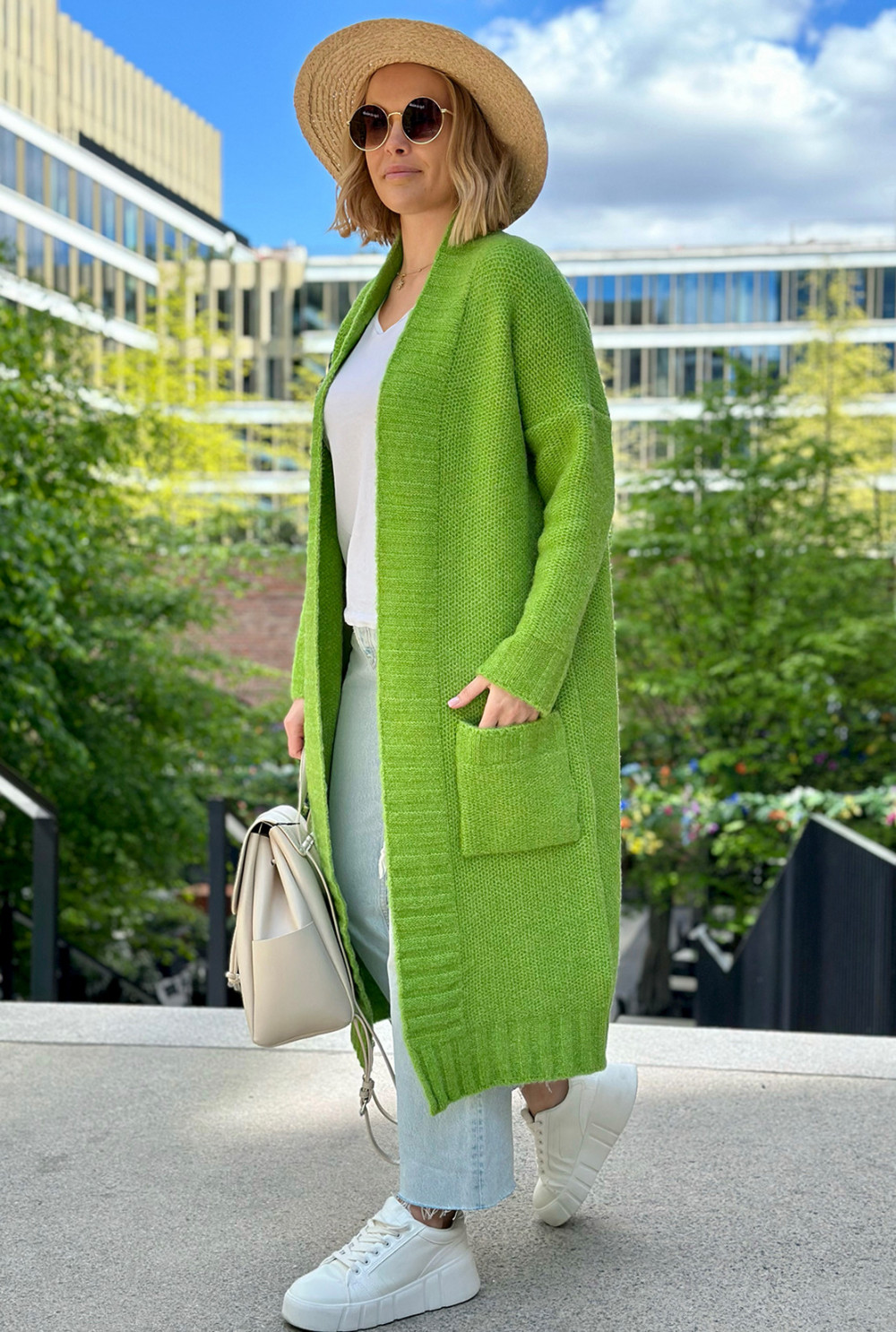 Długi kardigan o prostym kroju wykonany z najwyższej jakości materiałów. Model posiada praktyczne kieszenie. Świetnie dopełni Twoją stylizację! Dostępny jest w wielu kolorach!