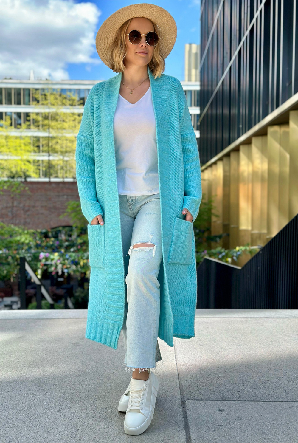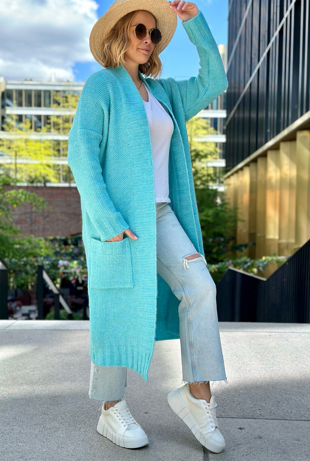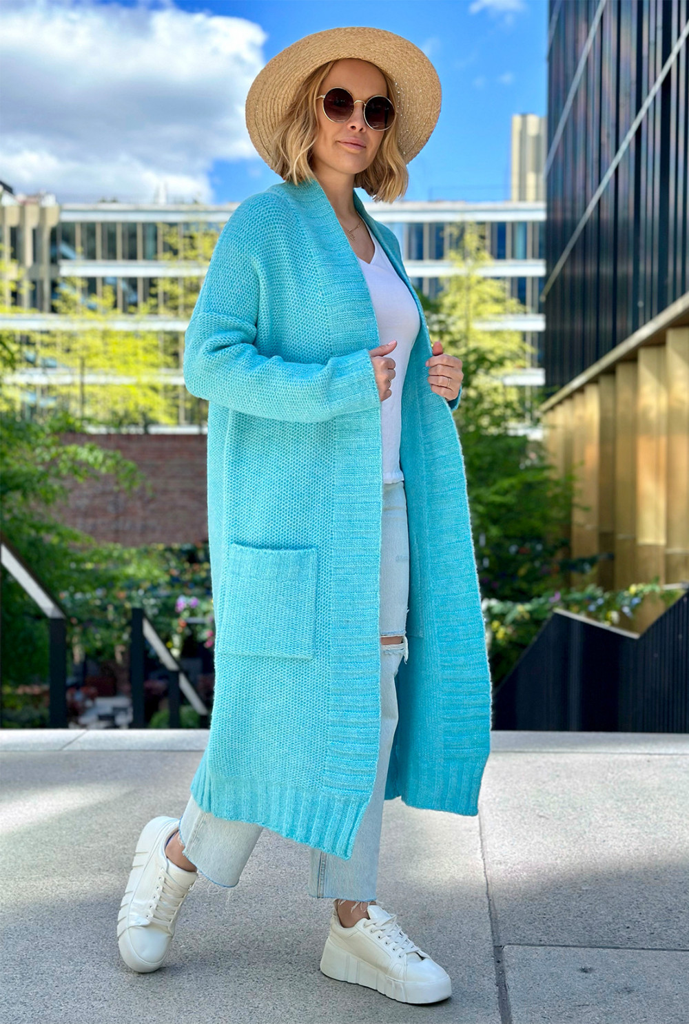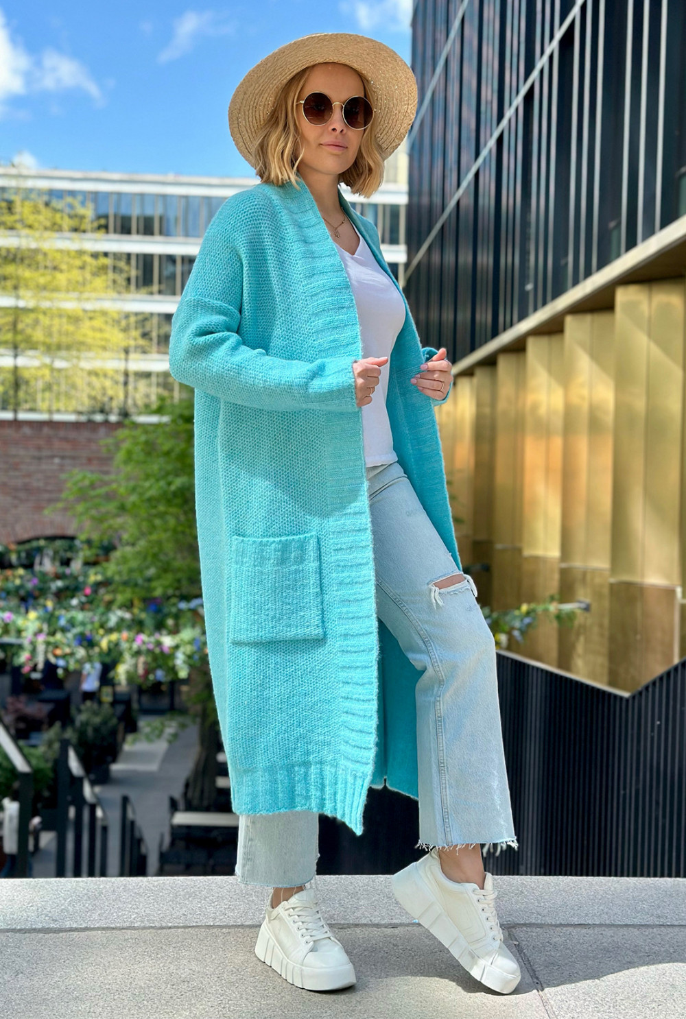 Długi kardigan o prostym kroju wykonany z najwyższej jakości materiałów. Model posiada praktyczne kieszenie. Świetnie dopełni Twoją stylizację! Dostępny jest w wielu kolorach!