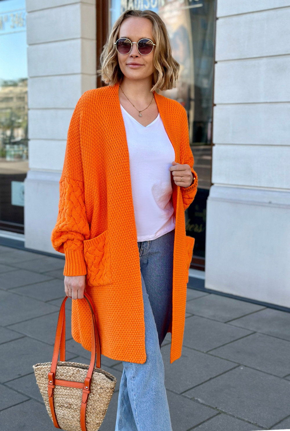 Kardigan z kieszeniami wykonany z przyjemnej w dotyku przędzy. Oversizowy model wykończony ozdobnym splotem. Cenisz sobie wygodę, stylowy wygląd, a zarazem komfort? Ten kardigan jest właśnie dla Ciebie!