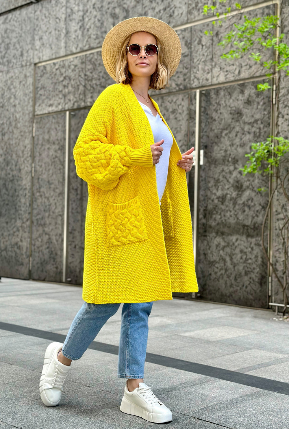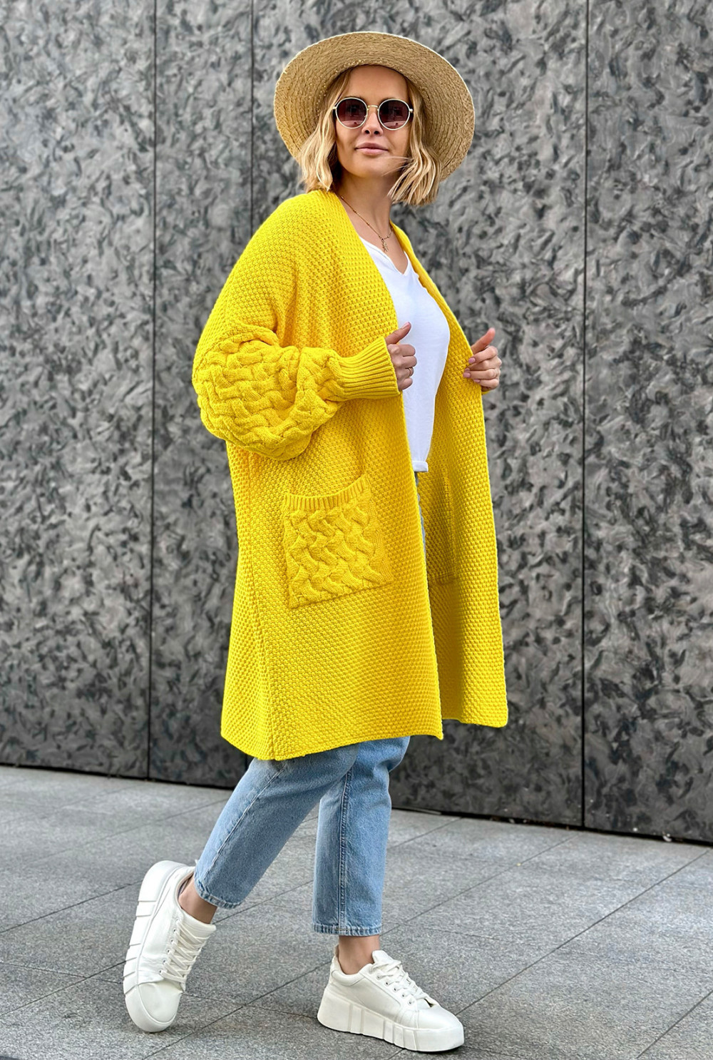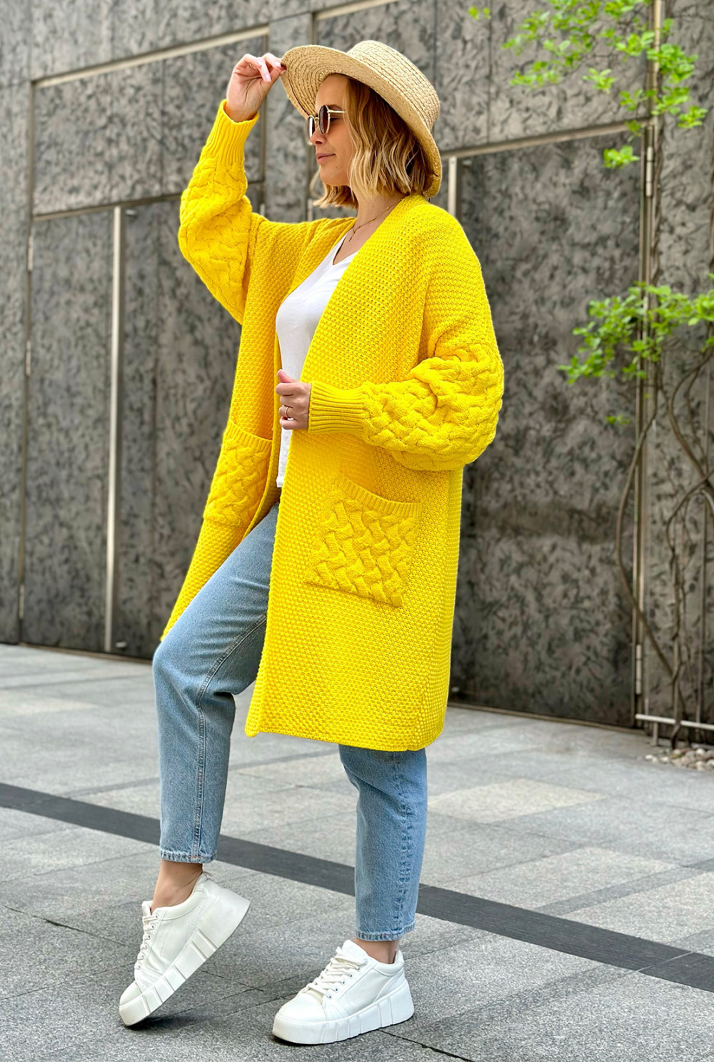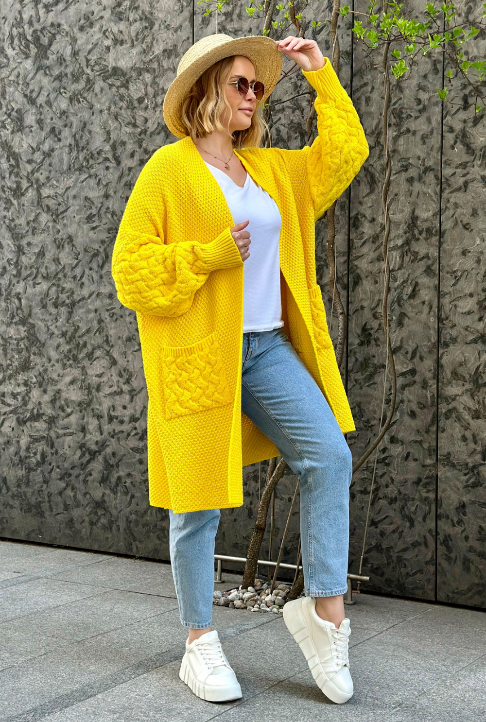 Kardigan z kieszeniami wykonany z przyjemnej w dotyku przędzy. Oversizowy model wykończony ozdobnym splotem. Cenisz sobie wygodę, stylowy wygląd, a zarazem komfort? Ten kardigan jest właśnie dla Ciebie!