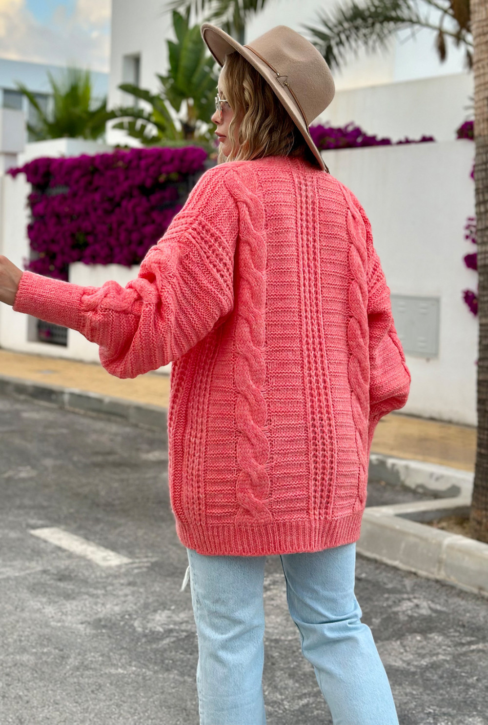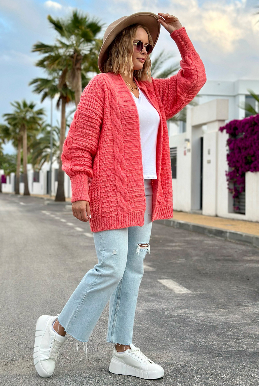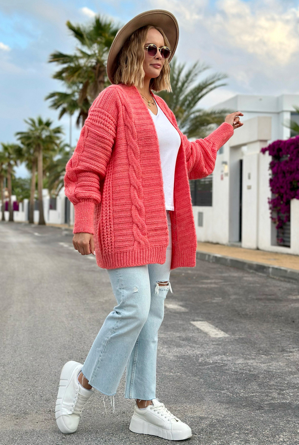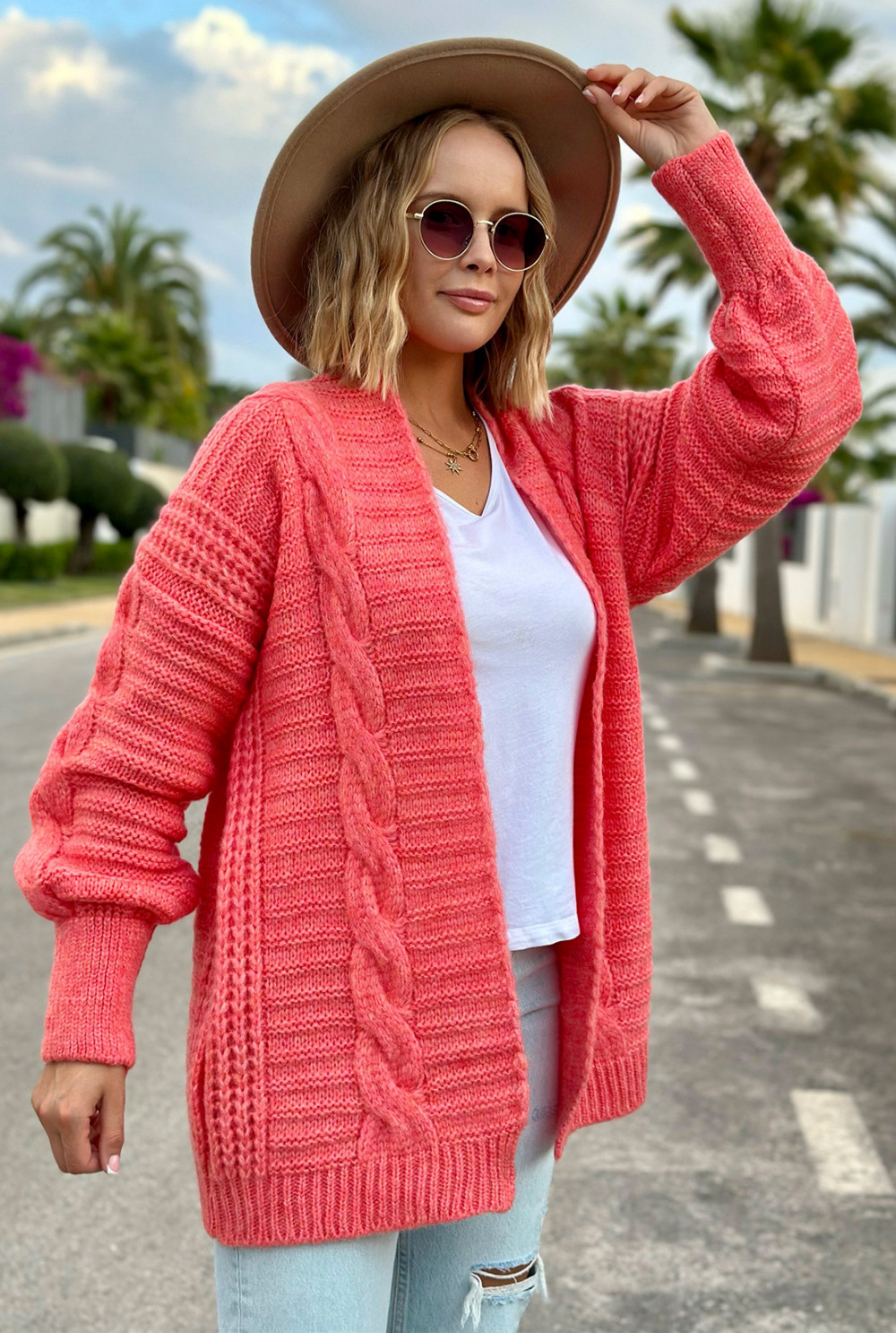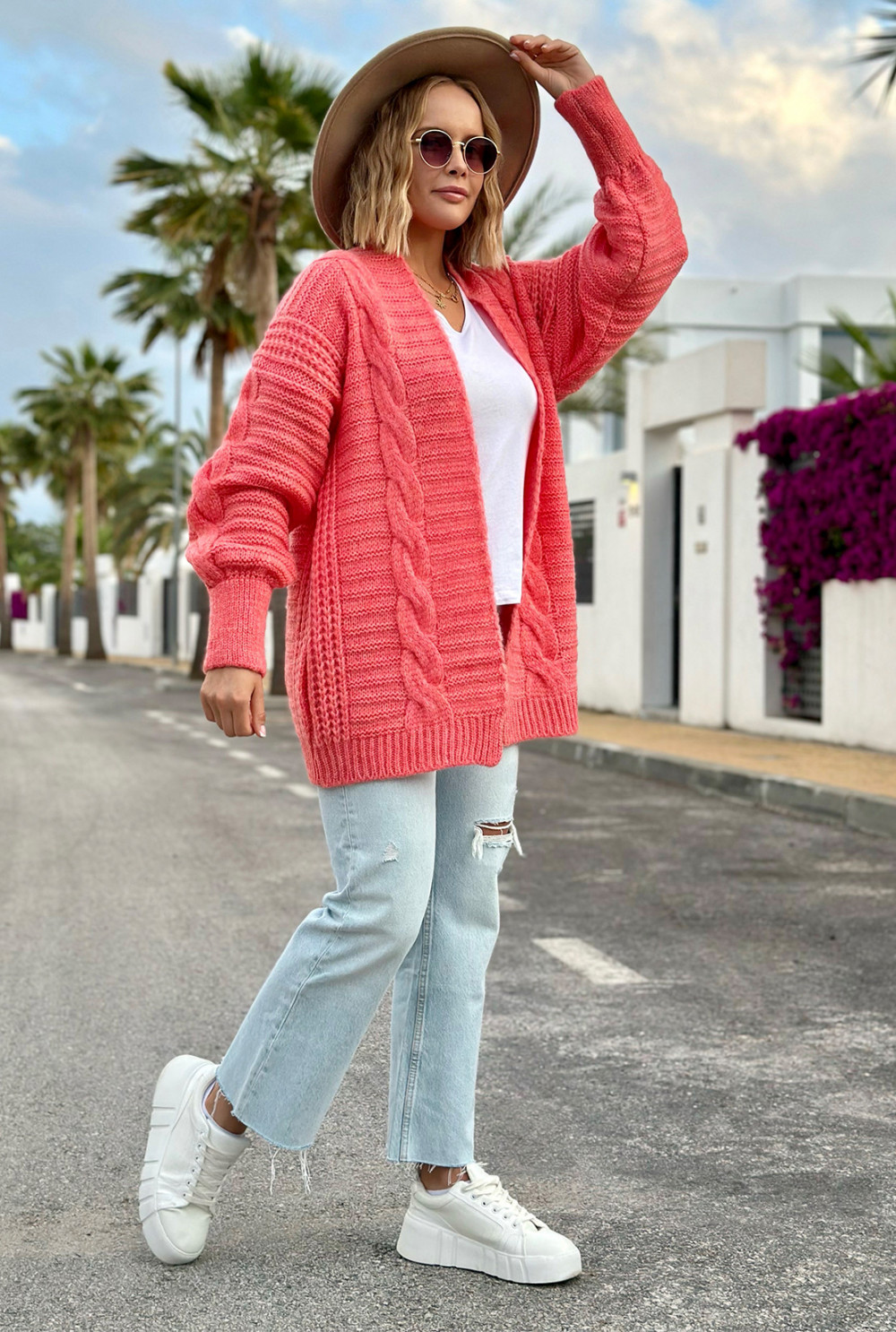 Kardigan z ozdobnym splotem. Model oversizowy o krótkim fasonie z bufiastymi rękawami, zakończonymi dłuższymi ściągaczami. Świetnie dopełni Twój look! Dostępny w wielu kolorach.