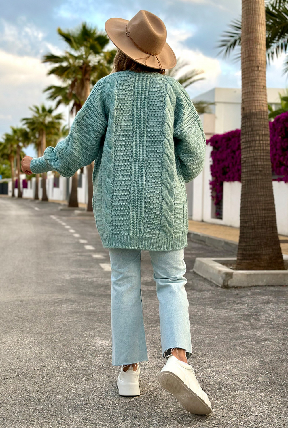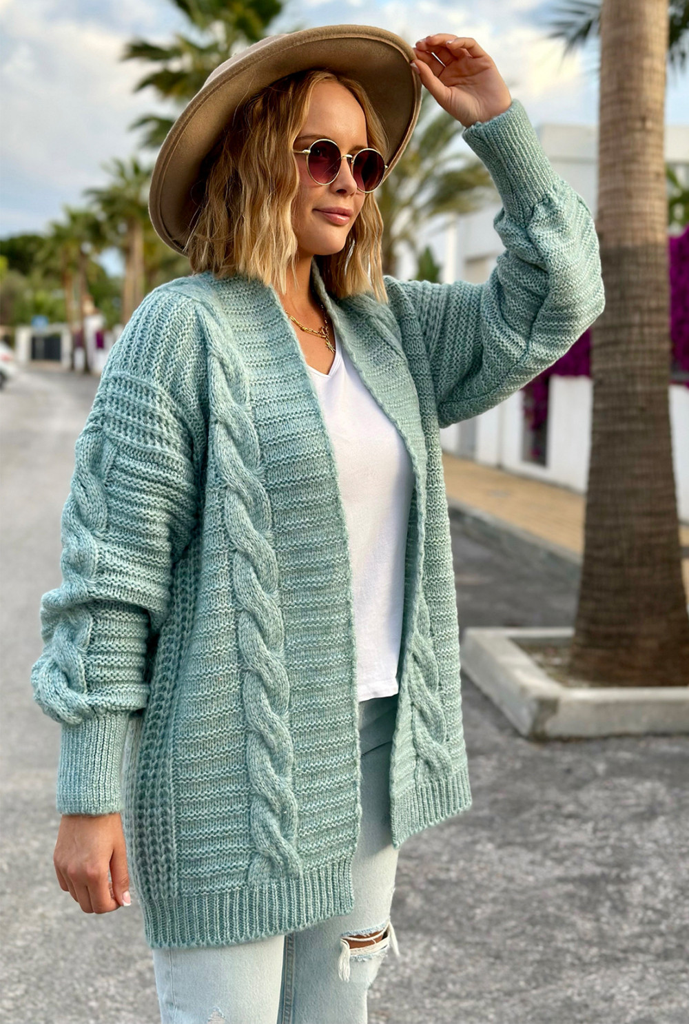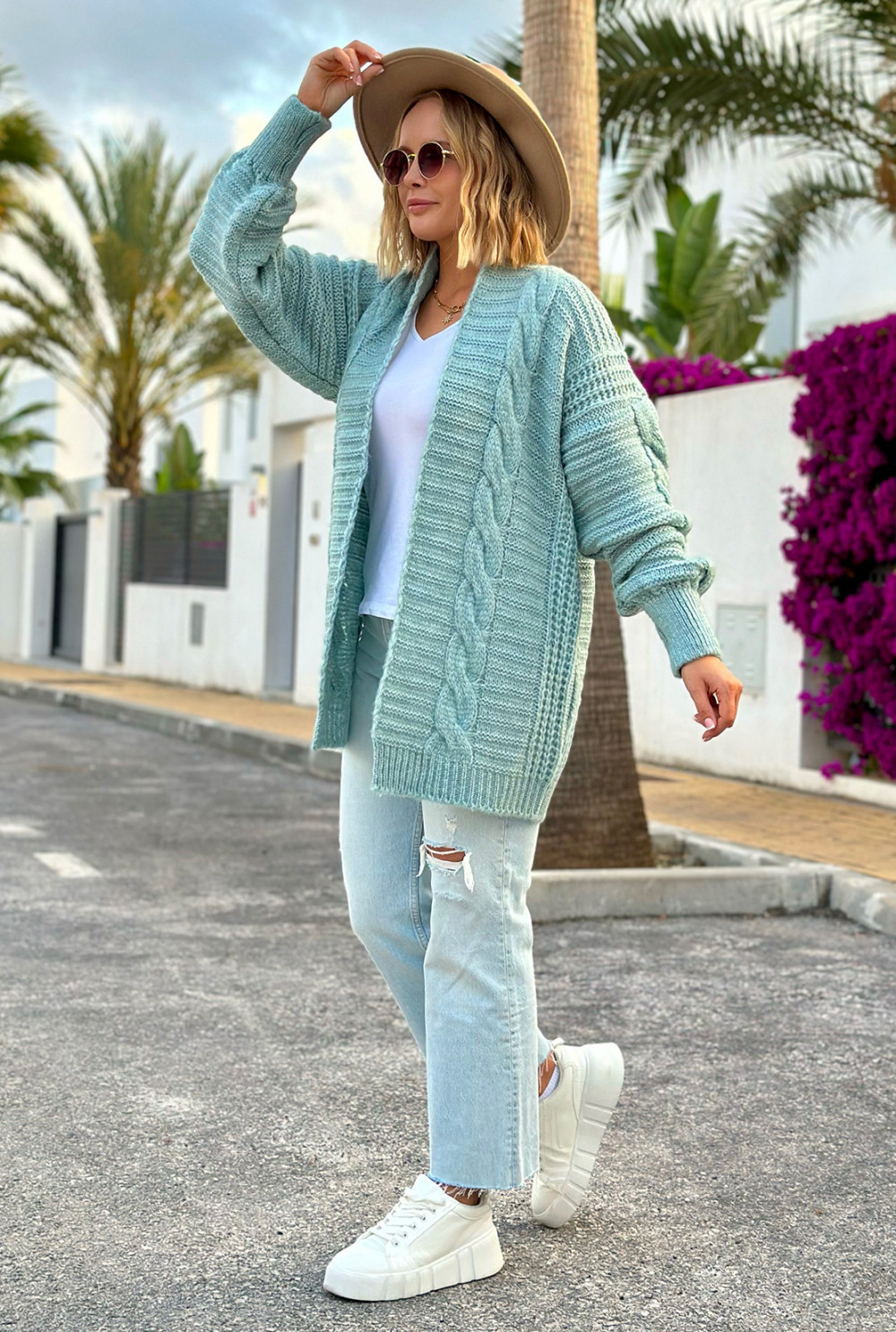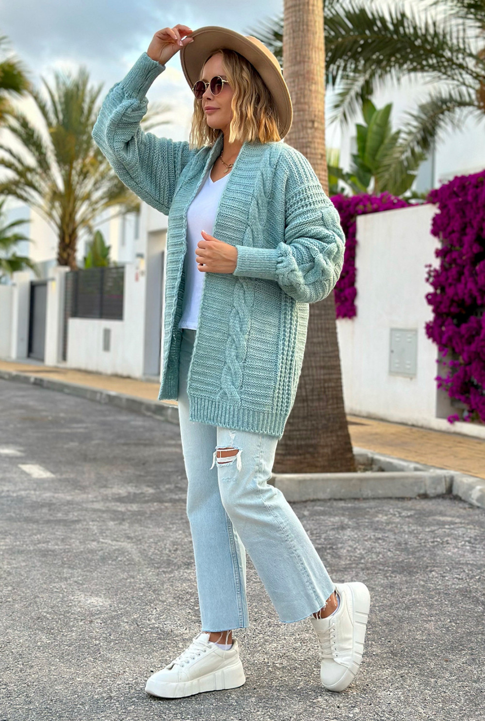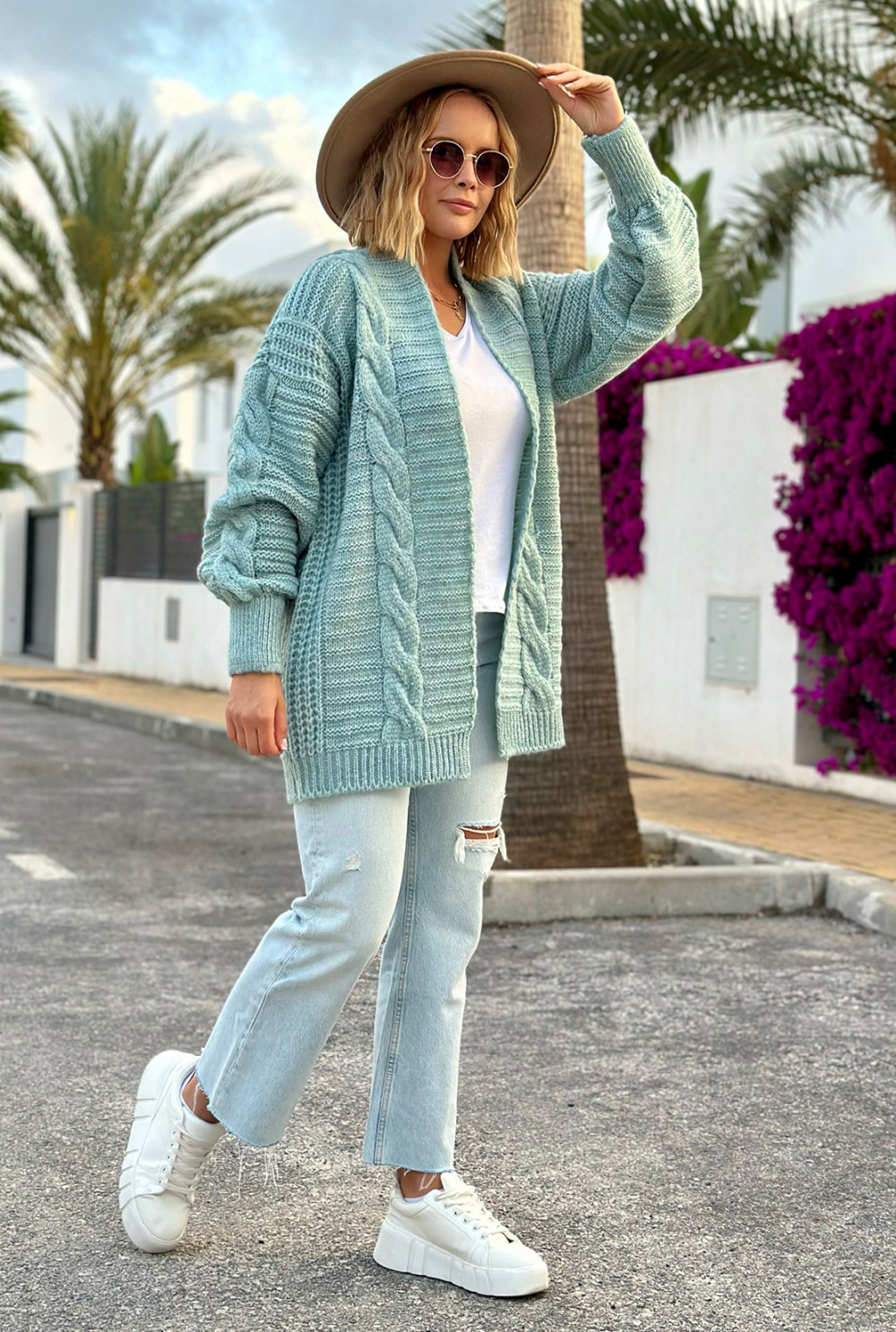 Kardigan z ozdobnym splotem. Model oversizowy o krótkim fasonie z bufiastymi rękawami, zakończonymi dłuższymi ściągaczami. Świetnie dopełni Twój look! Dostępny w wielu kolorach.