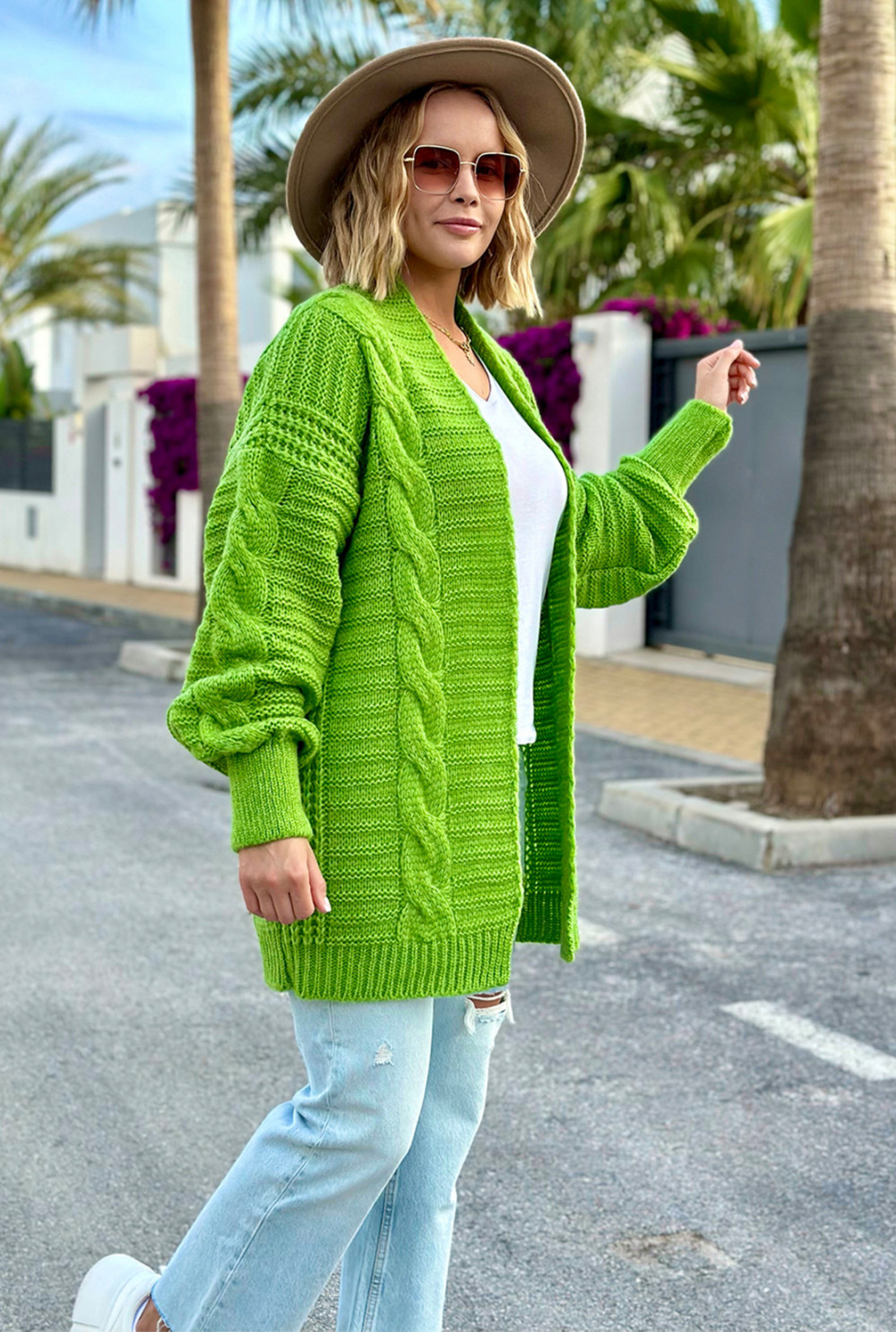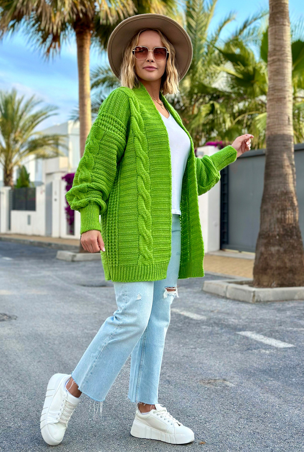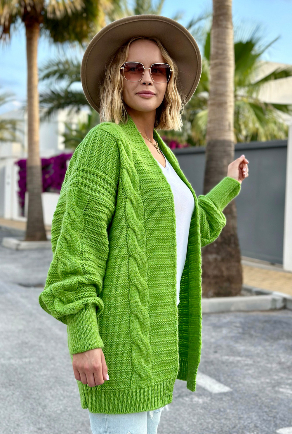 Kardigan z ozdobnym splotem. Model oversizowy o krótkim fasonie z bufiastymi rękawami, zakończonymi dłuższymi ściągaczami. Świetnie dopełni Twój look! Dostępny w wielu kolorach.