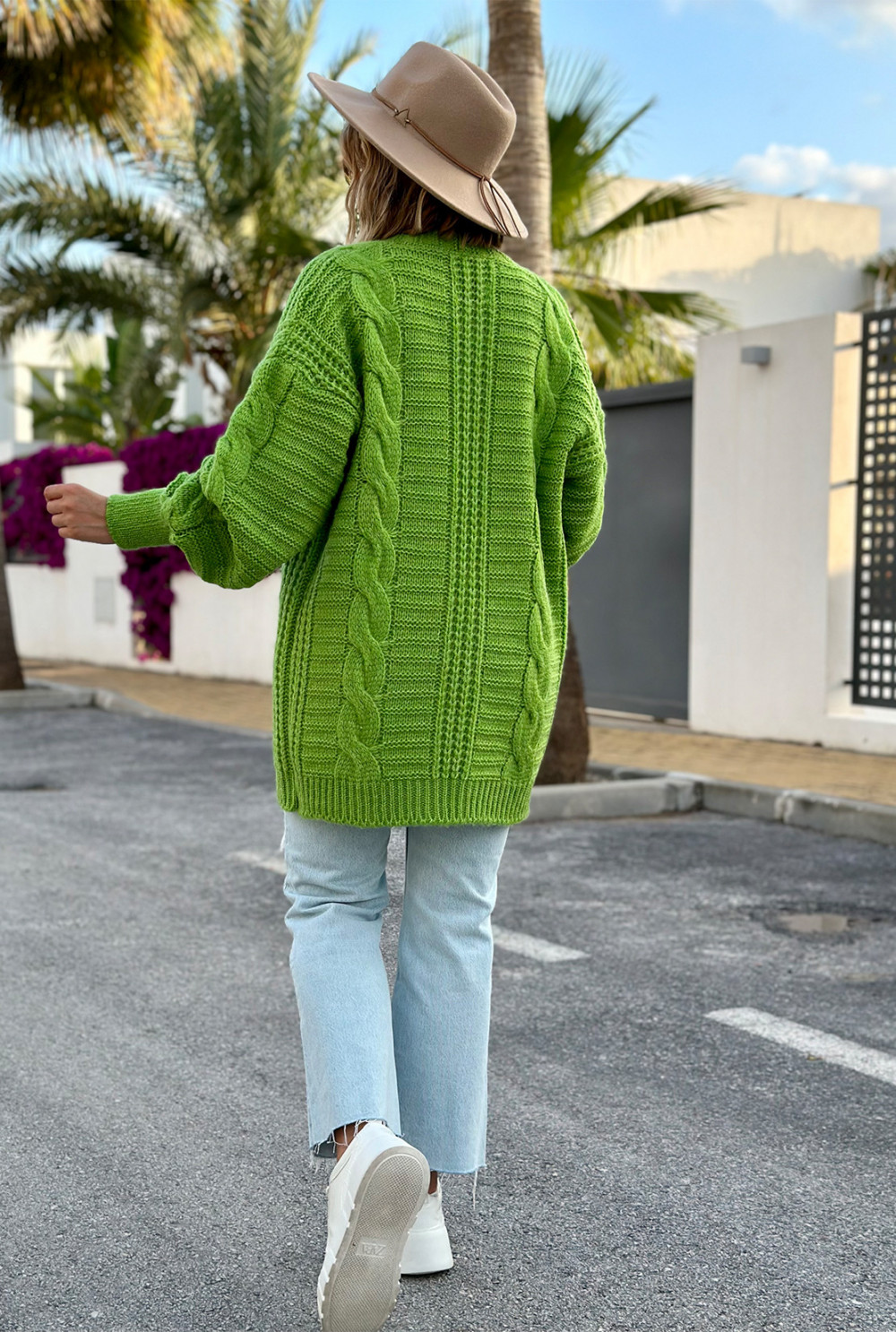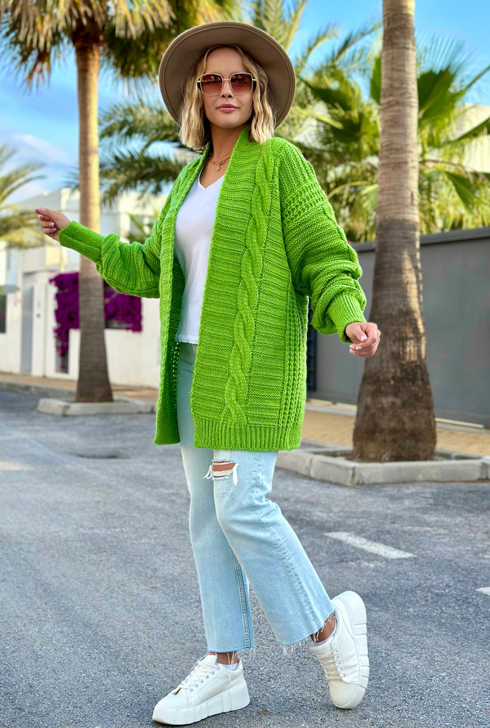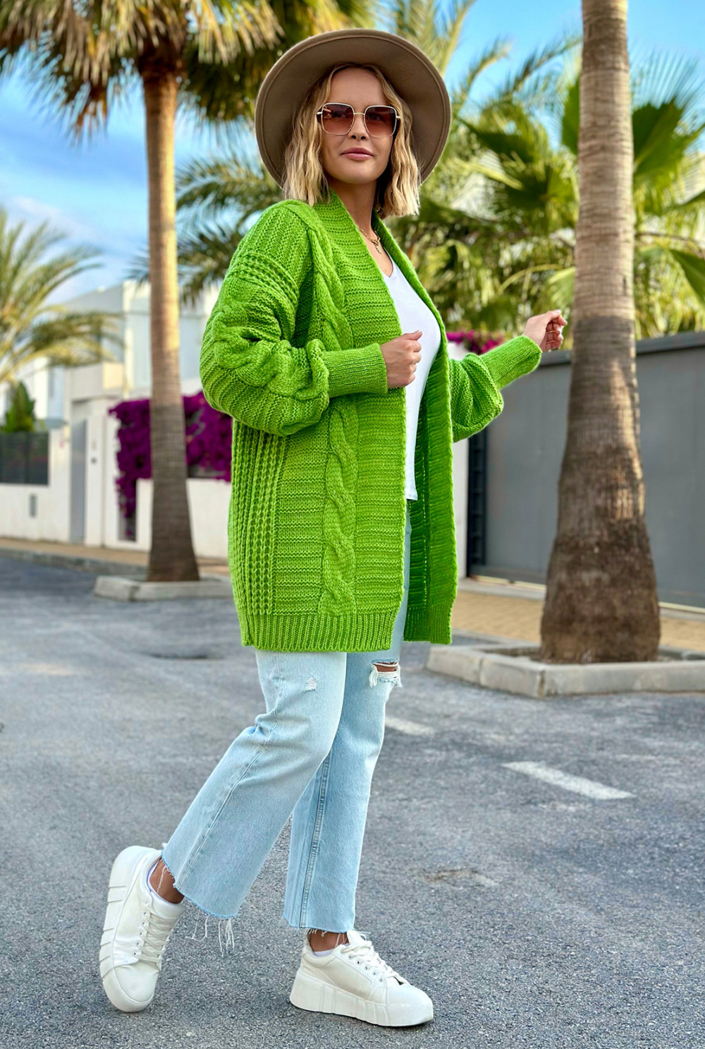 Kardigan z ozdobnym splotem. Model oversizowy o krótkim fasonie z bufiastymi rękawami, zakończonymi dłuższymi ściągaczami. Świetnie dopełni Twój look! Dostępny w wielu kolorach.