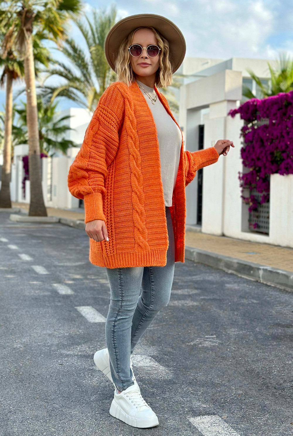 Kardigan z ozdobnym splotem. Model oversizowy o krótkim fasonie z bufiastymi rękawami, zakończonymi dłuższymi ściągaczami. Świetnie dopełni Twój look! Dostępny w wielu kolorach.