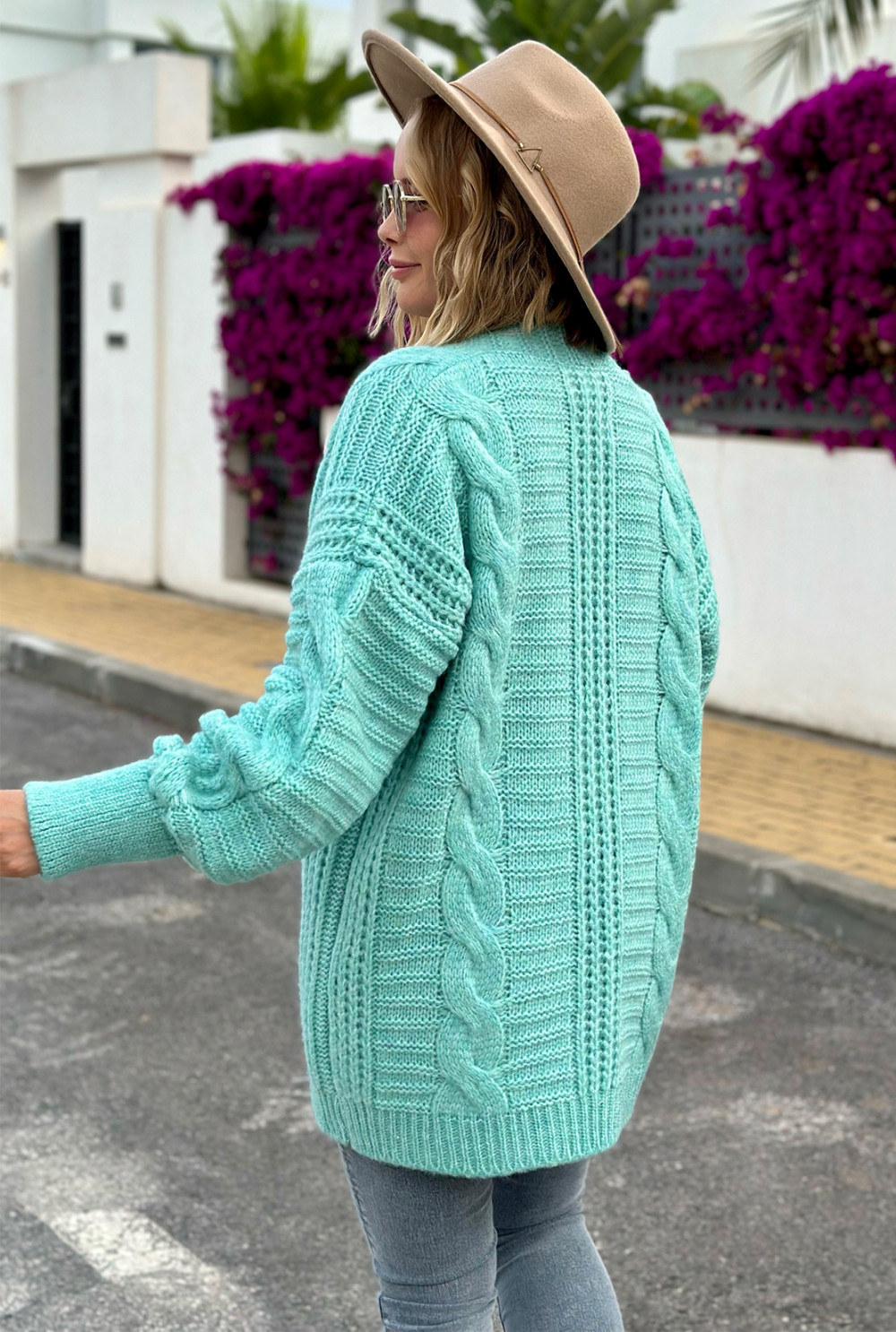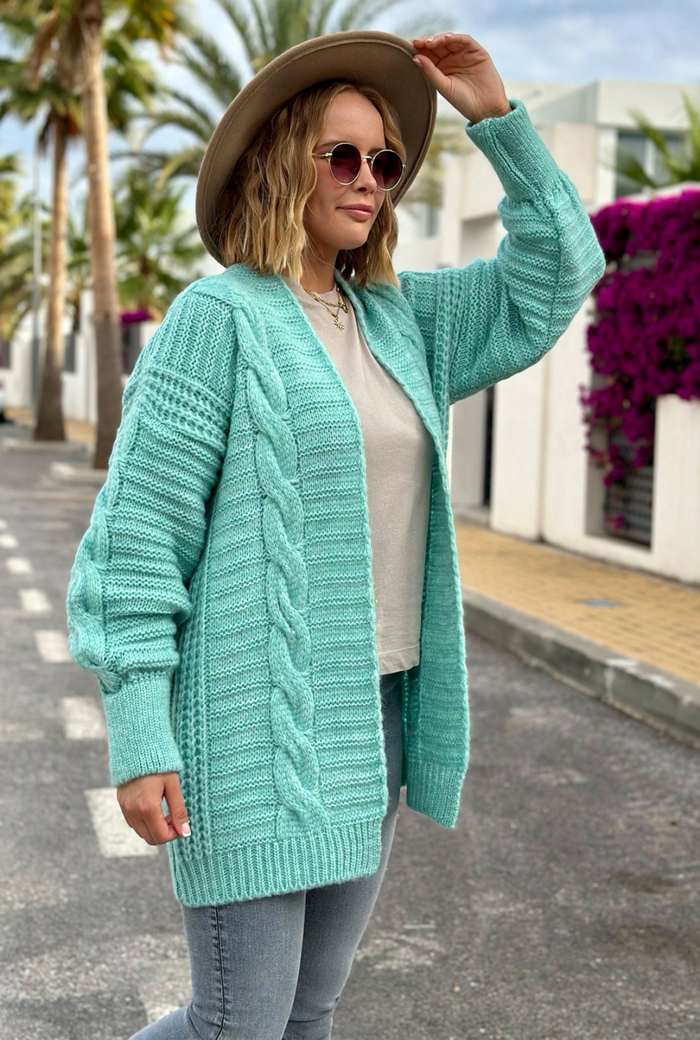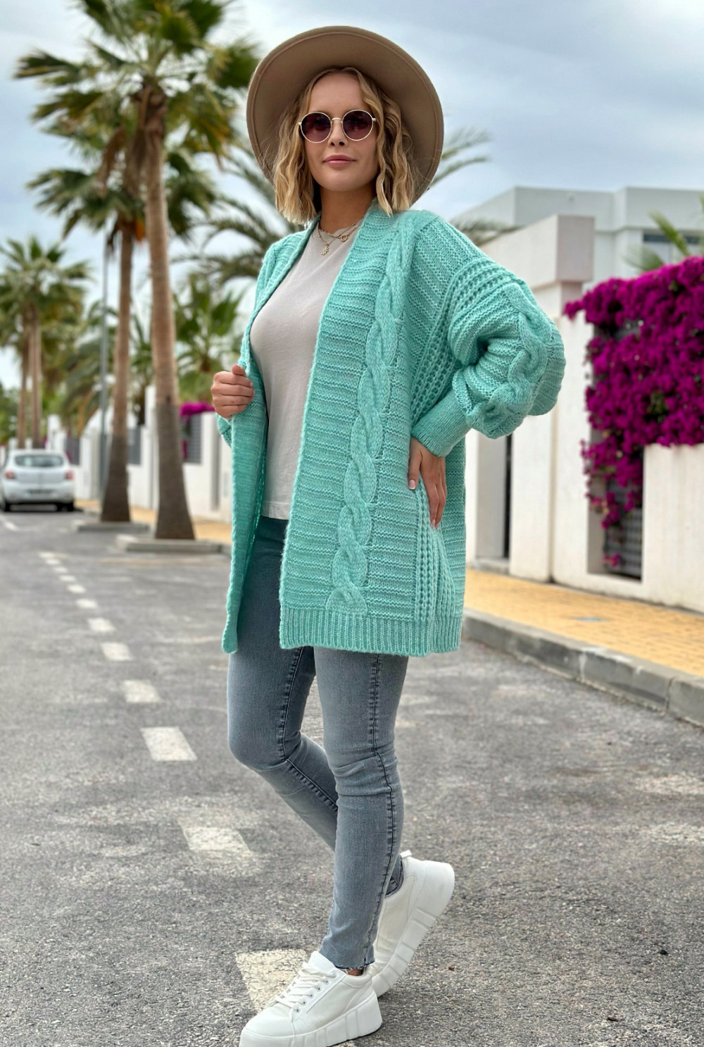 Kardigan z ozdobnym splotem. Model oversizowy o krótkim fasonie z bufiastymi rękawami, zakończonymi dłuższymi ściągaczami. Świetnie dopełni Twój look! Dostępny w wielu kolorach.
