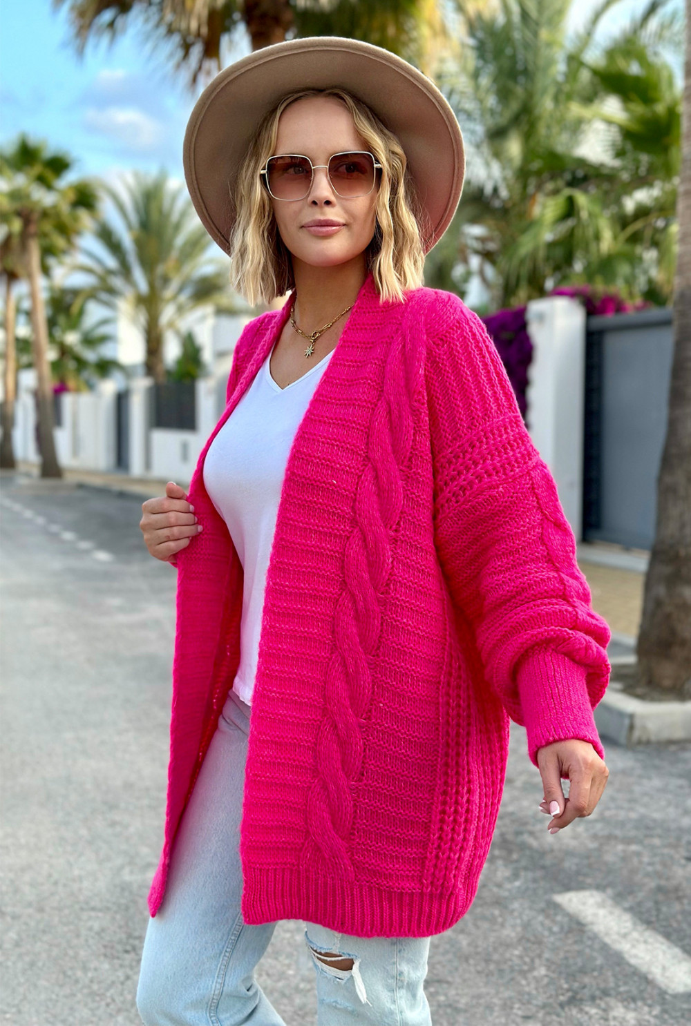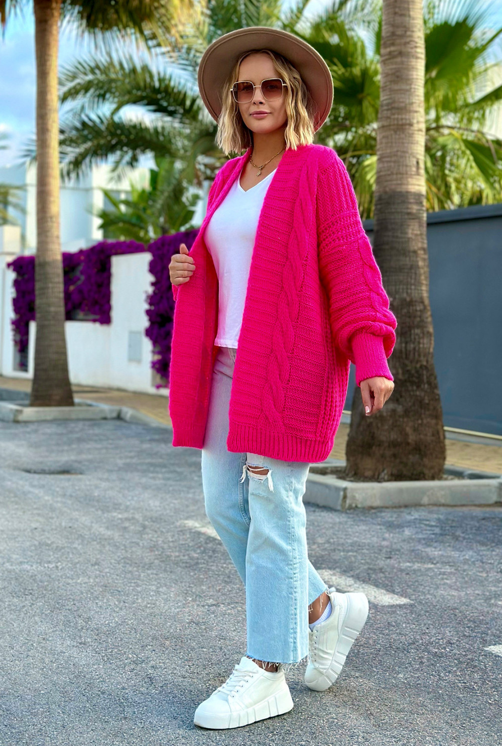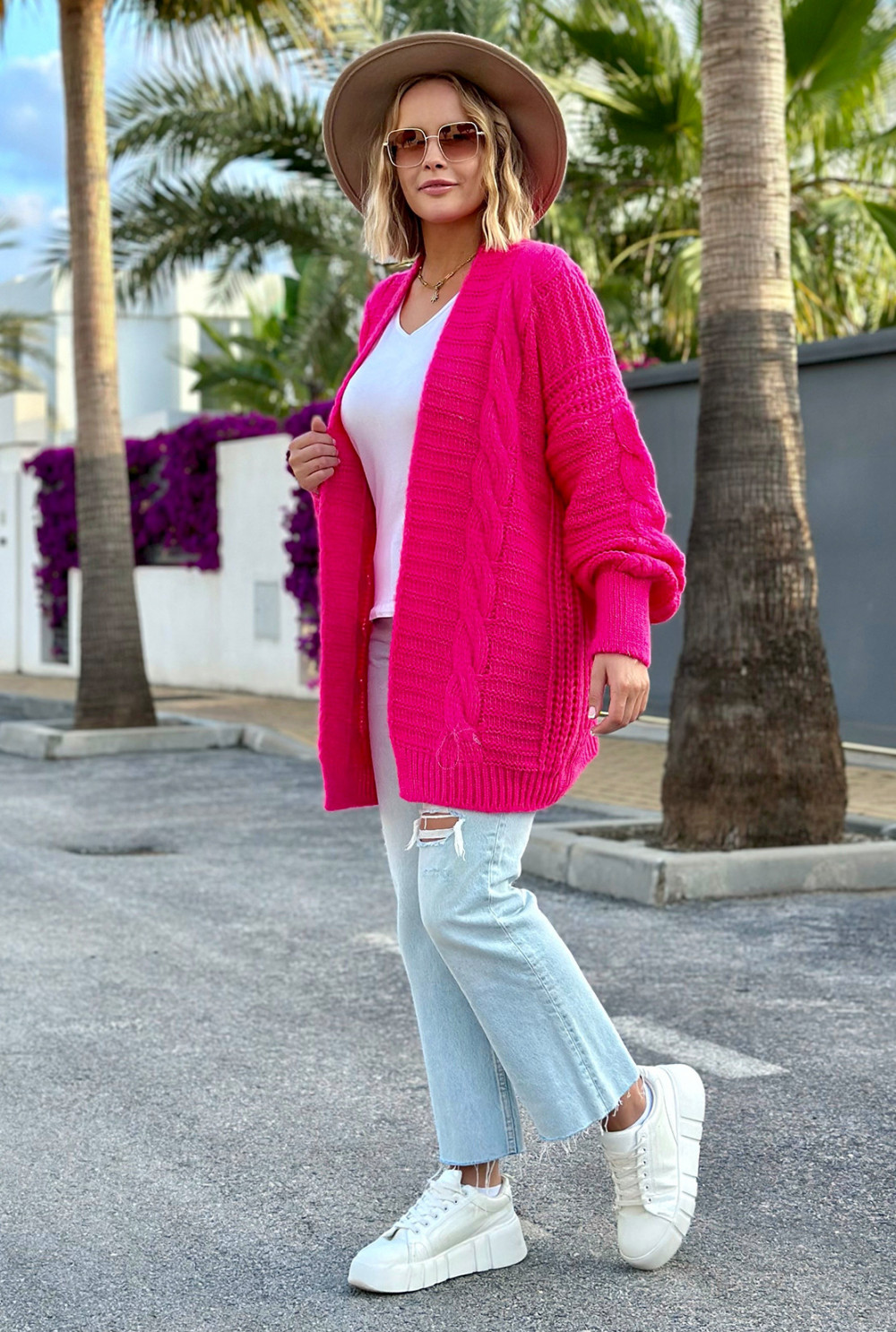 Kardigan z ozdobnym splotem. Model oversizowy o krótkim fasonie z bufiastymi rękawami, zakończonymi dłuższymi ściągaczami. Świetnie dopełni Twój look! Dostępny w wielu kolorach.