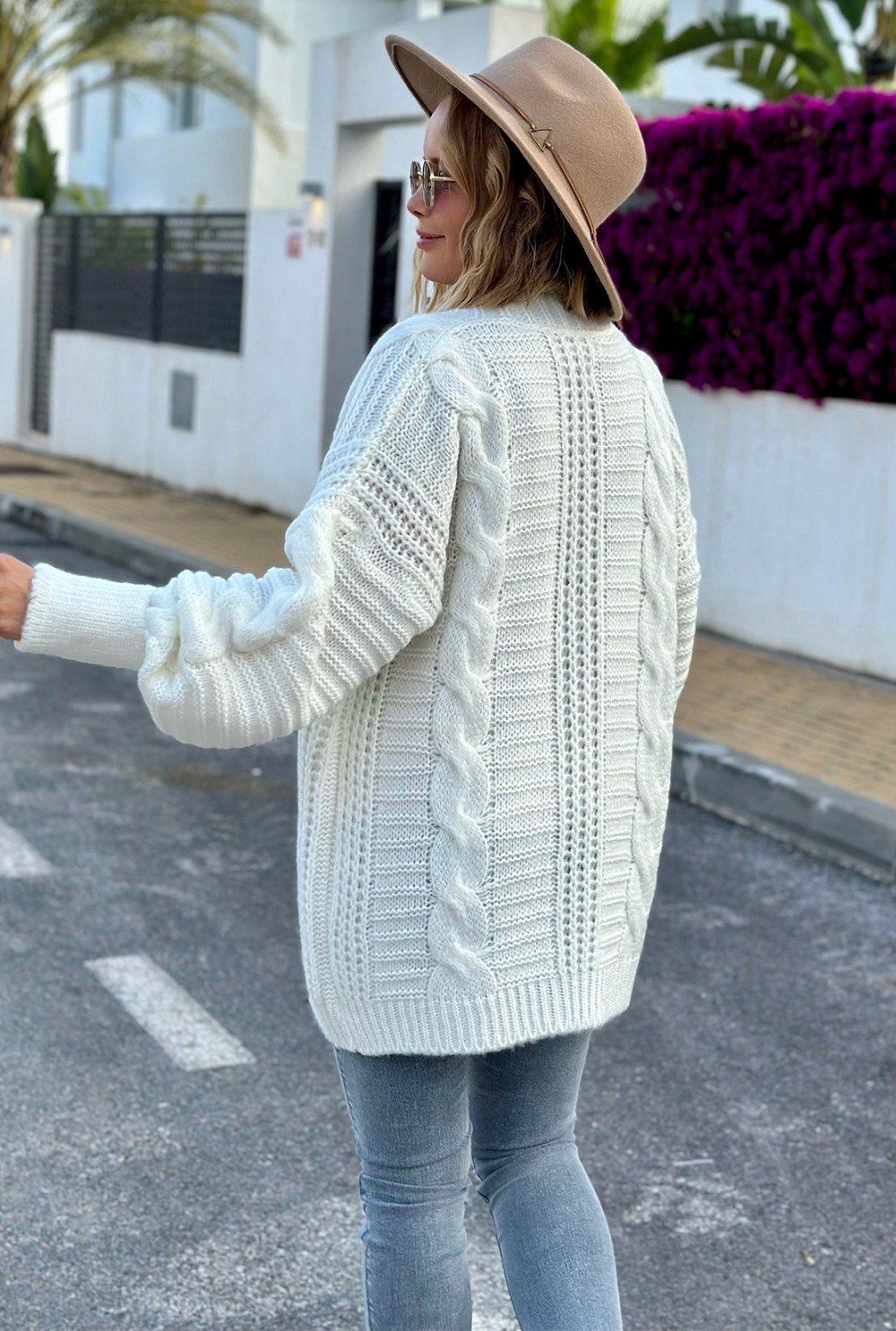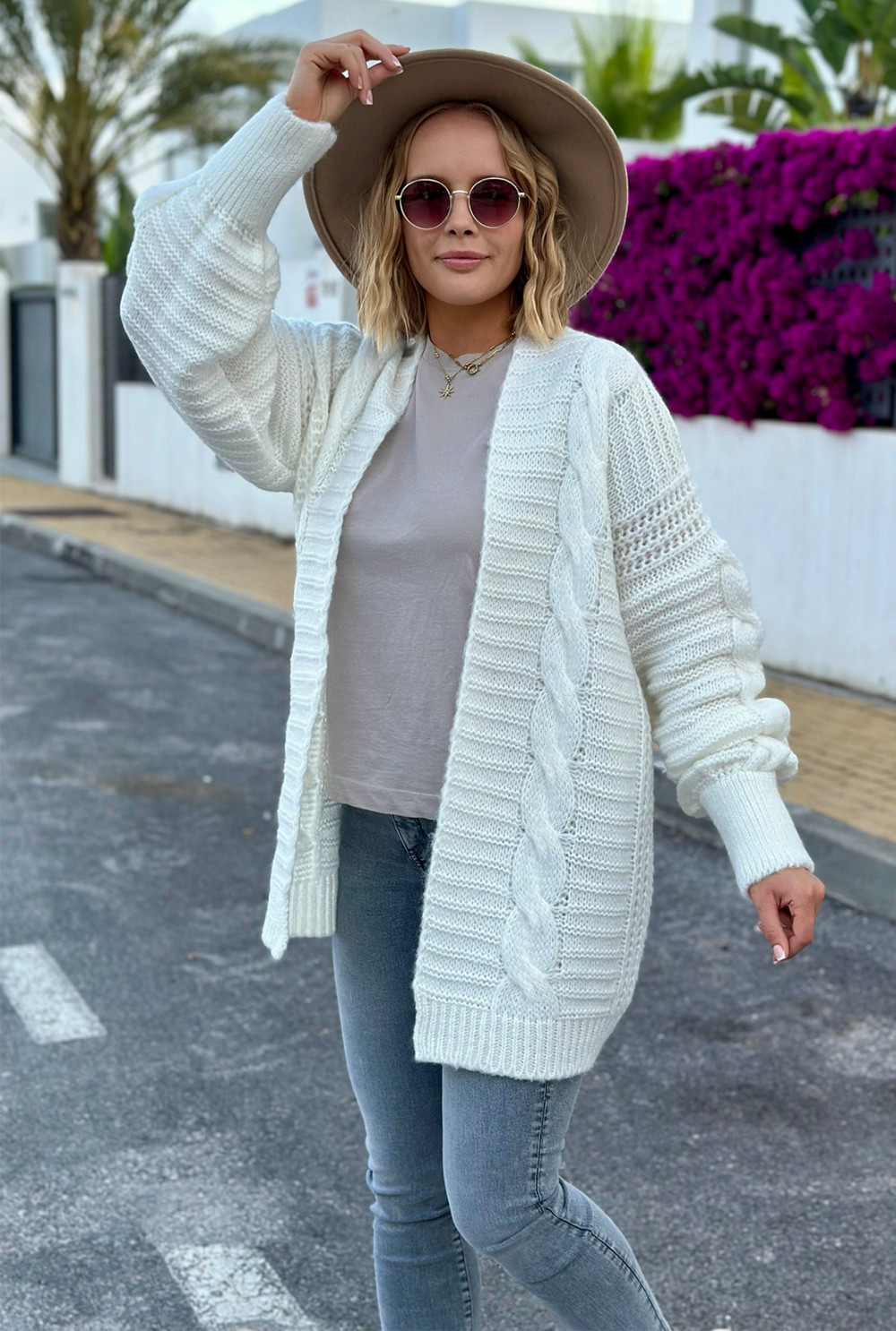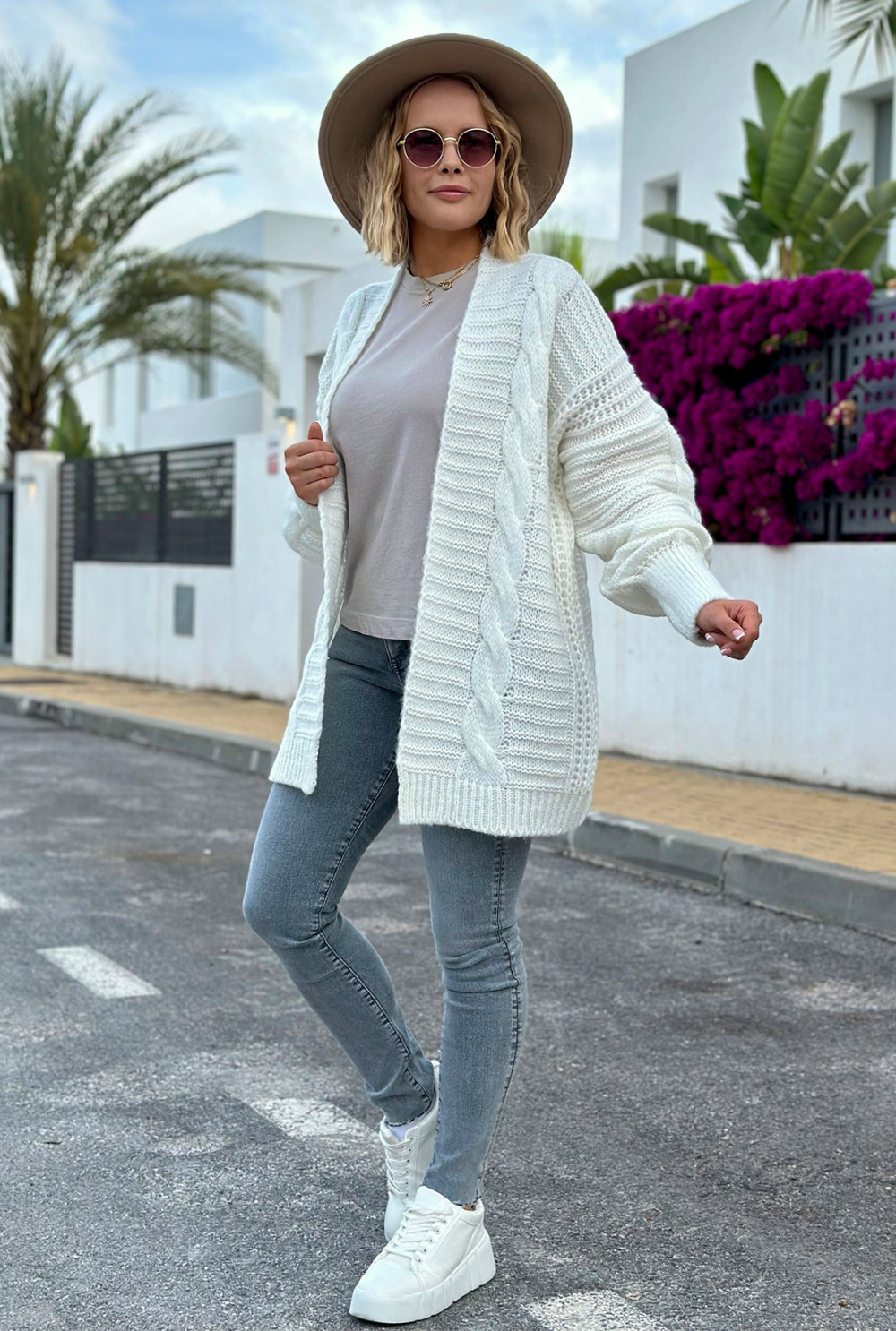 Kardigan z ozdobnym splotem. Model oversizowy o krótkim fasonie z bufiastymi rękawami, zakończonymi dłuższymi ściągaczami. Świetnie dopełni Twój look! Dostępny w wielu kolorach.